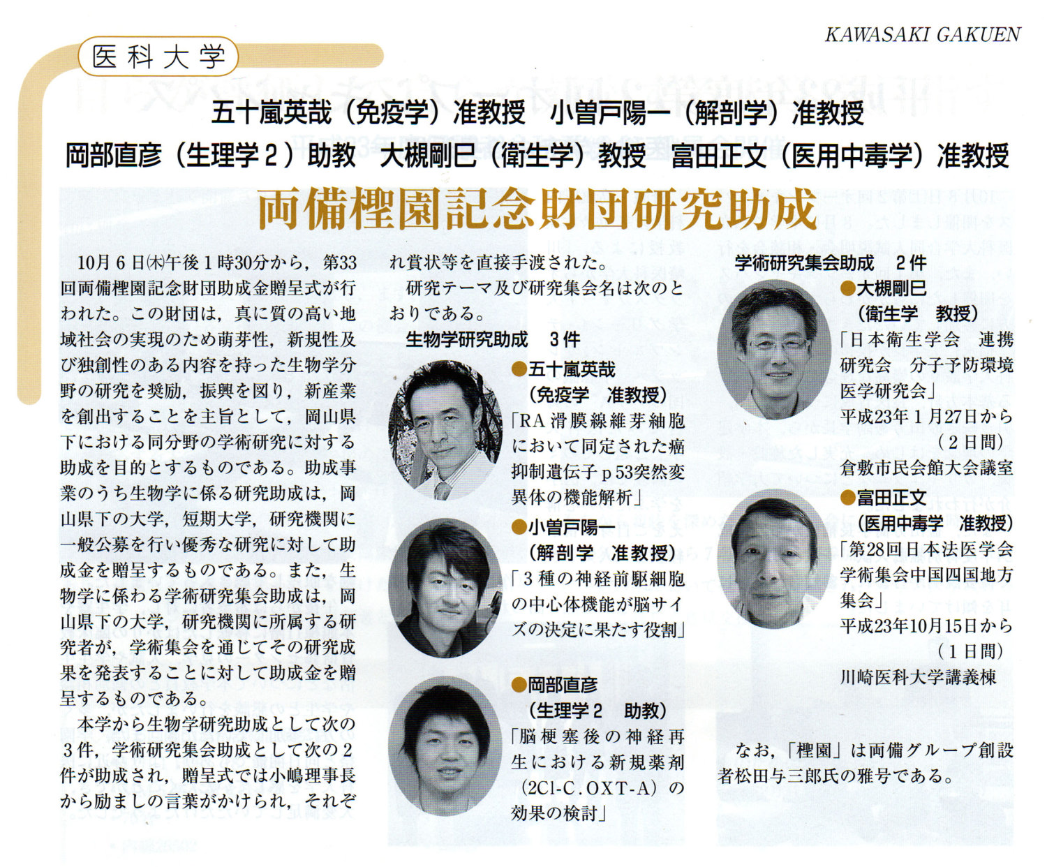 212/1/27-28で主催する第11回分子予防環境医学研究会に対して,両備てい園から研究会助成を受けた記事が掲載されました。