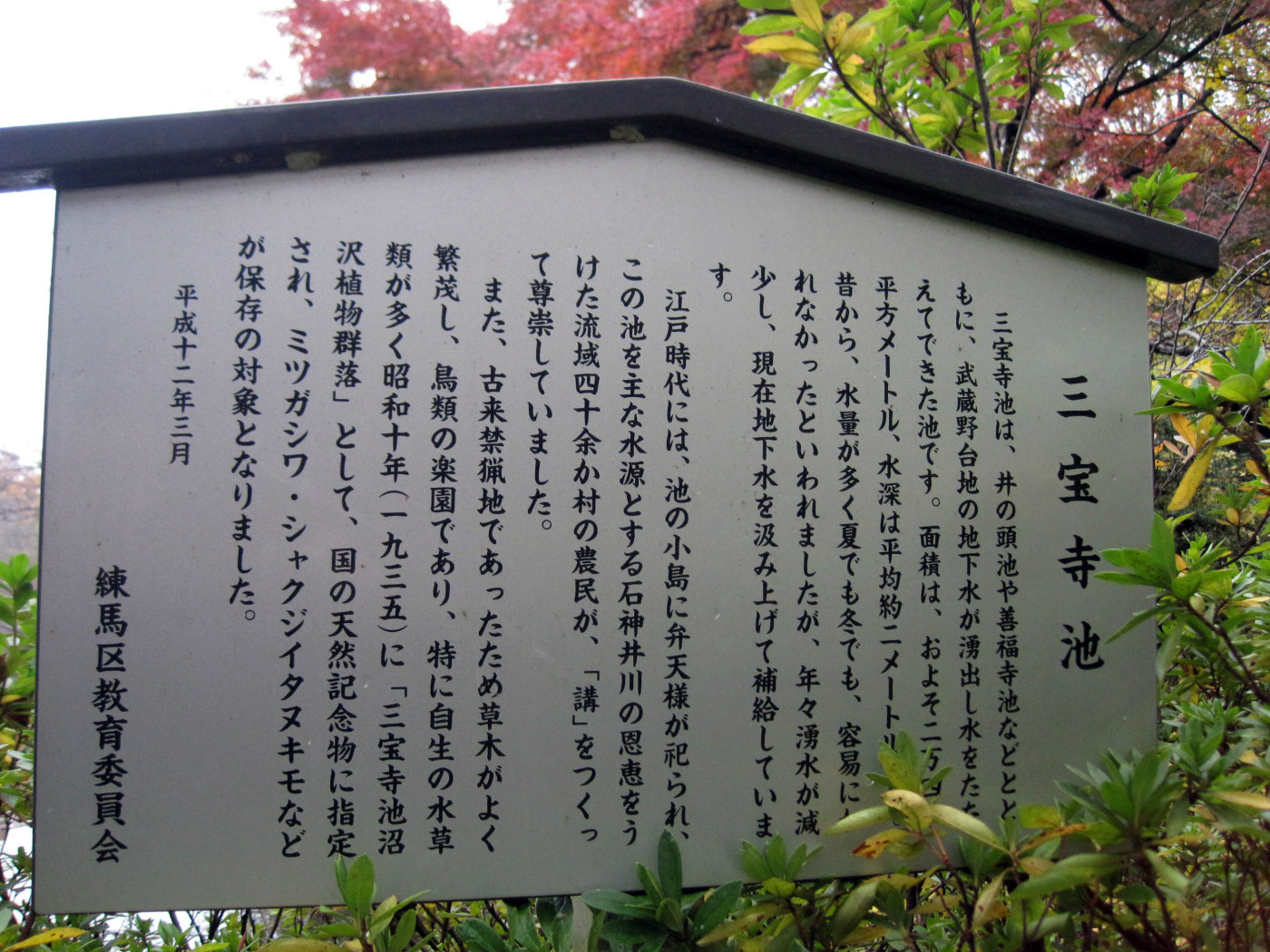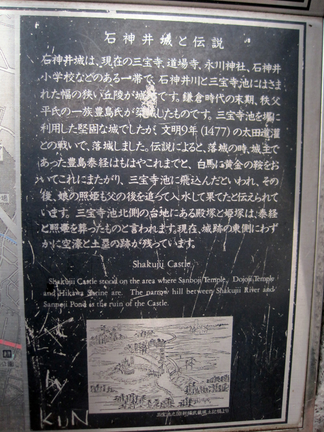 【当地付近は、元々武蔵野を支配した豊島氏の居城(石神井城)があり、同氏が室町時代に滅ぶまで在った。公園内に空堀の一部が残る。近辺には、豊島氏や豊島氏を滅ぼした太田道灌にまつわる遺跡や神社がある。三宝寺池には石神井城落城の際に豊島氏の姫、照姫が身を投げたと言う伝説があり、練馬区では照姫を偲んだ照姫まつりを1988年(昭和63年)より毎年4月-5月に開催している。公園の脇には旧早稲田通りが、石神井公園駅からこの公園にかけては石神井公園通りがある。園の南には石神井川が流れている。】だそうです。