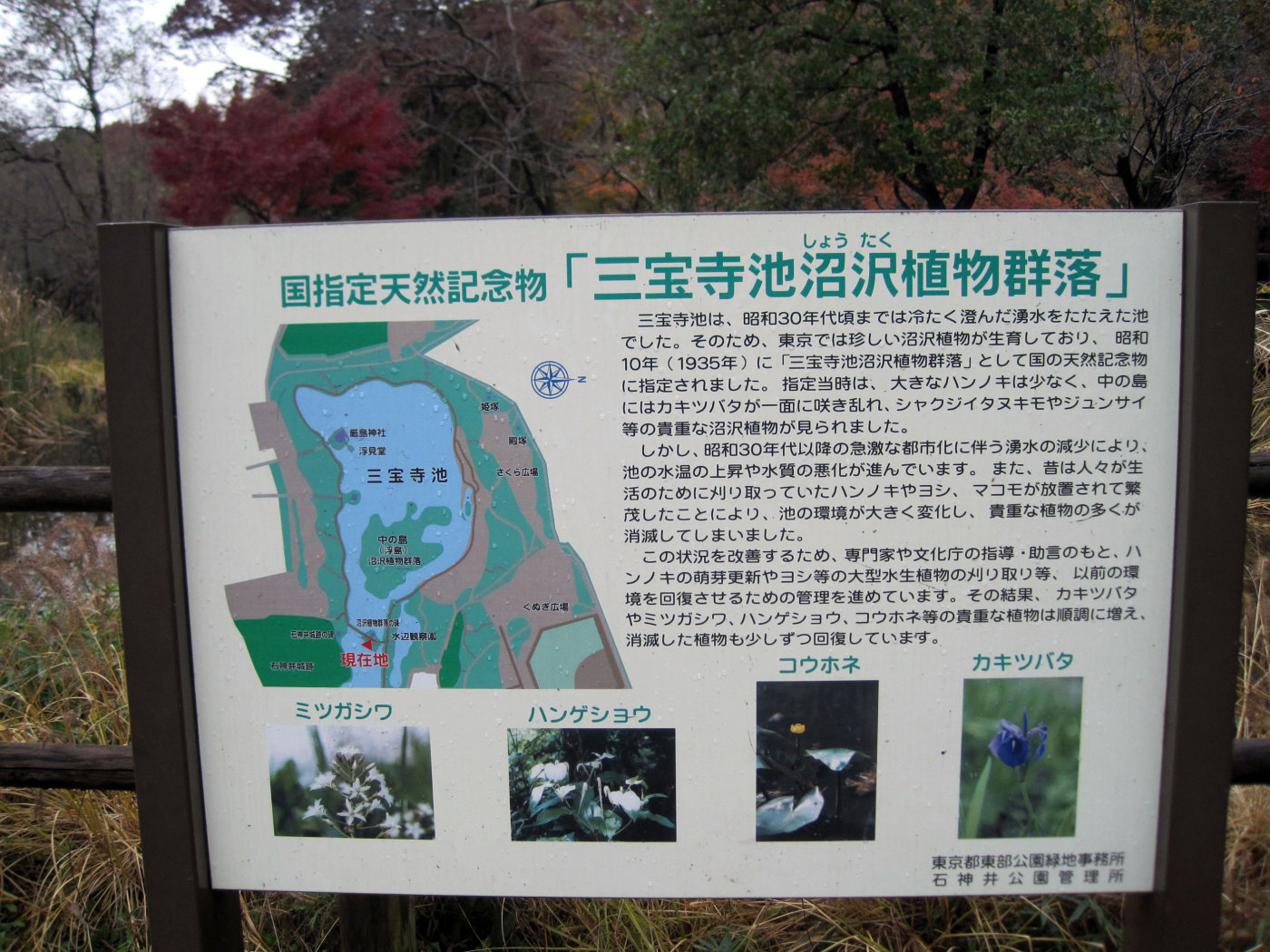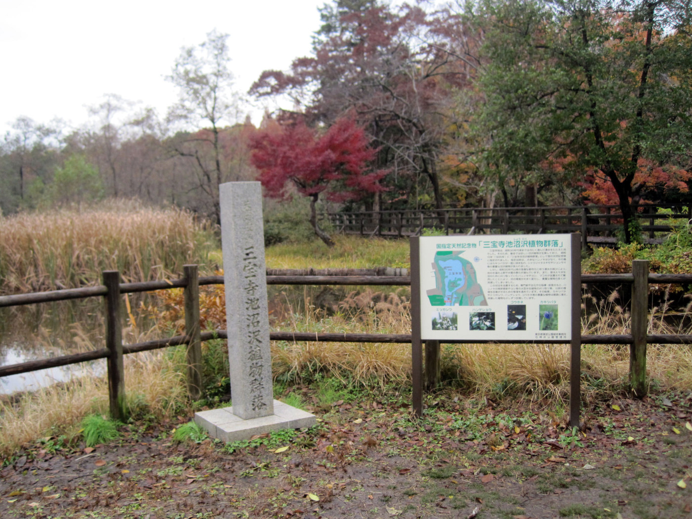 【沼や沢などに生える植物の群落で、三宝寺池では中の島にある群落が昭和10年12月に、国の天然記念物に指定されています。ここには、氷河期から遺存してきた寒冷地植物のミツガシワをはじめ、カキツバタ、コウホネなどがあります。当時、約50種あった植物も、水環境の変化などにより様相が変わり、種類、個体数共、減ってしまいました。現在、大型の水生植物を刈り取り、カキツバタの成育を促すなど、この群落の回復を図っています。また、水辺観察園でも、これらの水生植物を見ることができます。】とのことです。