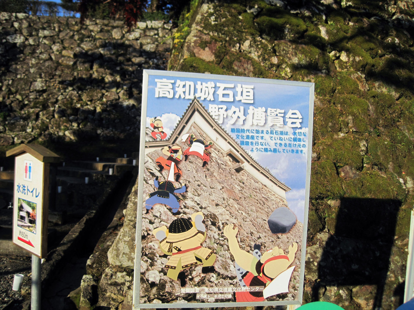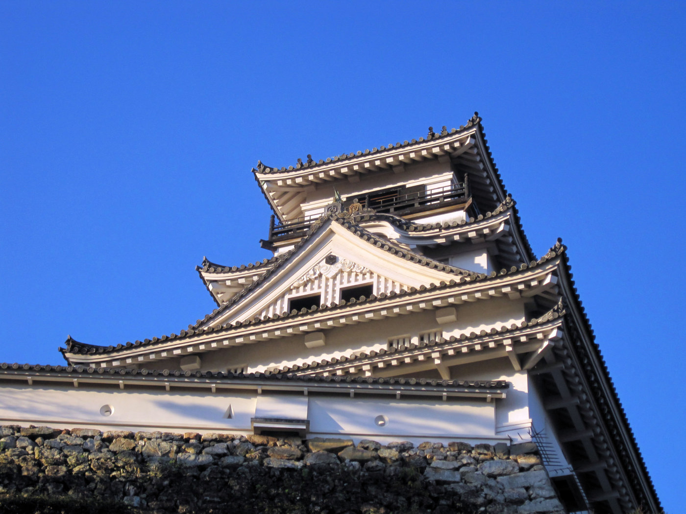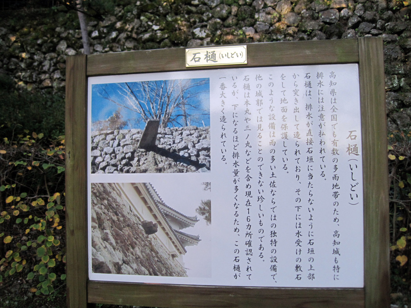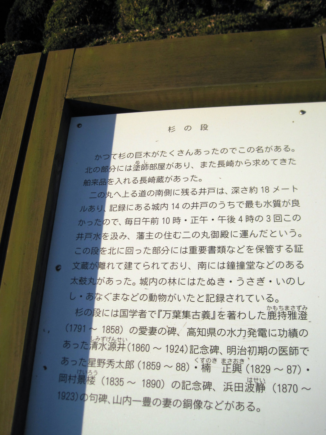 【高知城は、高知県高知市(土佐国土佐郡高知)にあった城。別名、鷹城(たかじょう)。江戸時代、土佐藩の藩庁がおかれた。江戸時代に建造された天守や追手門等が現存し、城跡は国の史跡に指定されている。日本100名城に選定されている。】です。