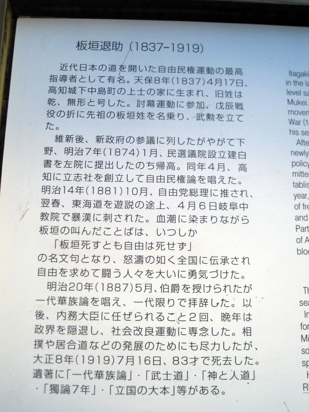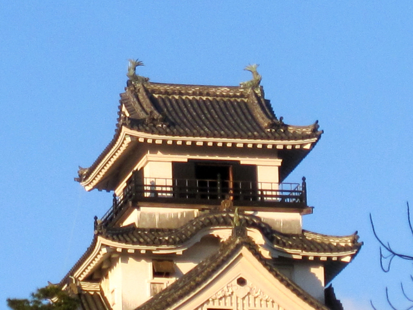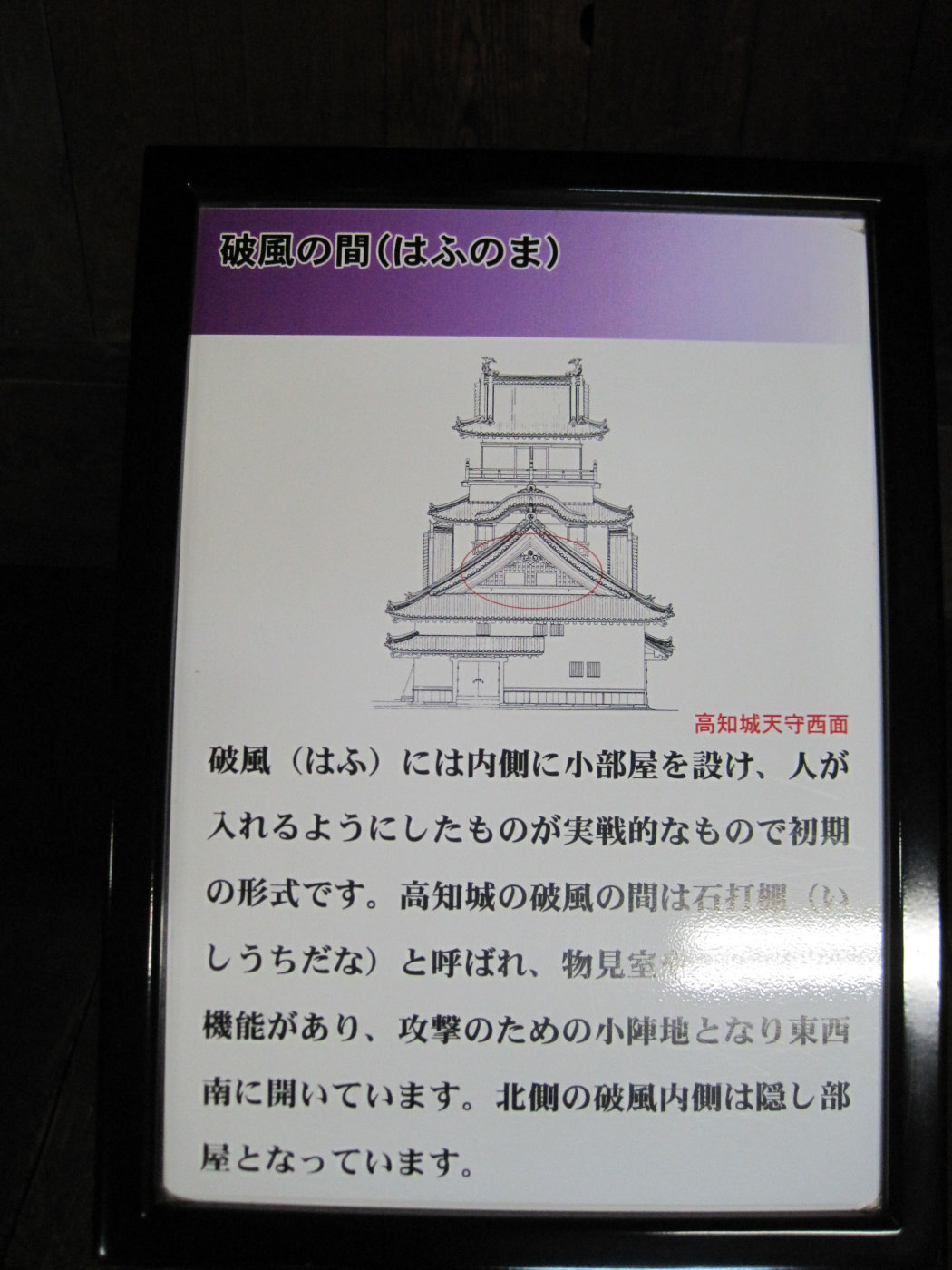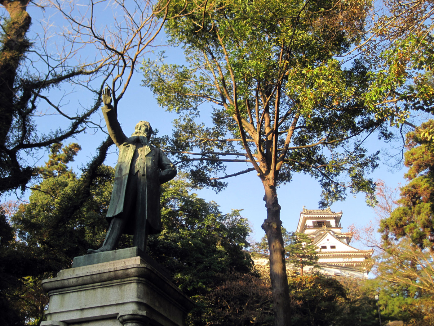 【高知城は、高知県高知市(土佐国土佐郡高知)にあった城。別名、鷹城(たかじょう)。江戸時代、土佐藩の藩庁がおかれた。江戸時代に建造された天守や追手門等が現存し、城跡は国の史跡に指定されている。日本100名城に選定されている。】です。