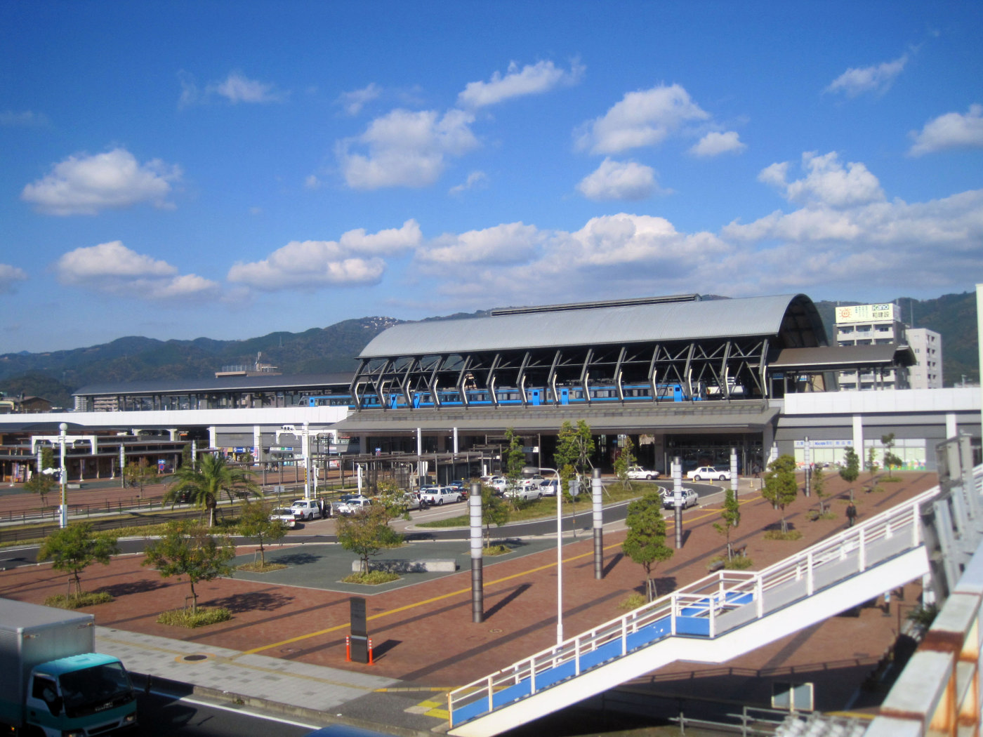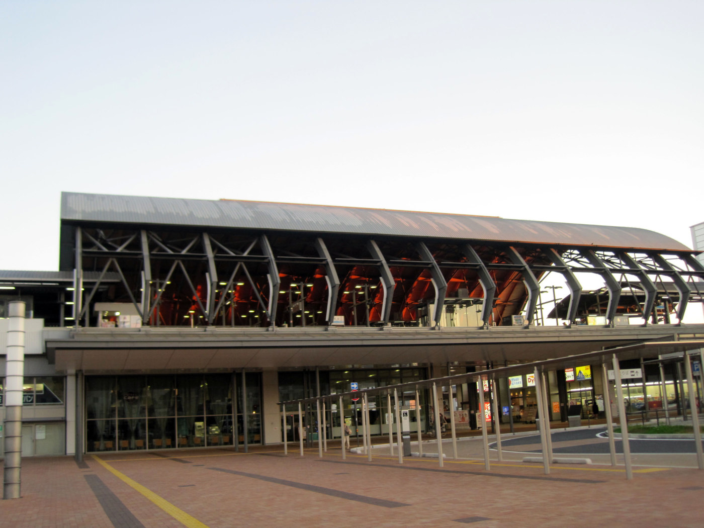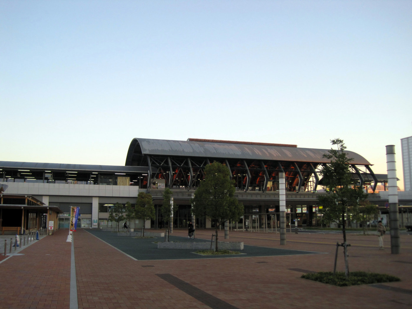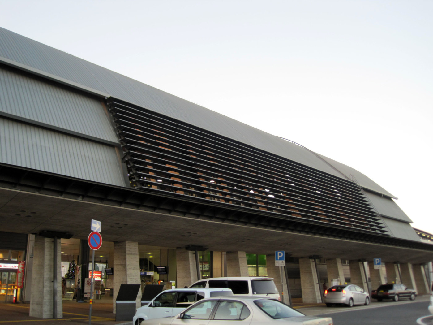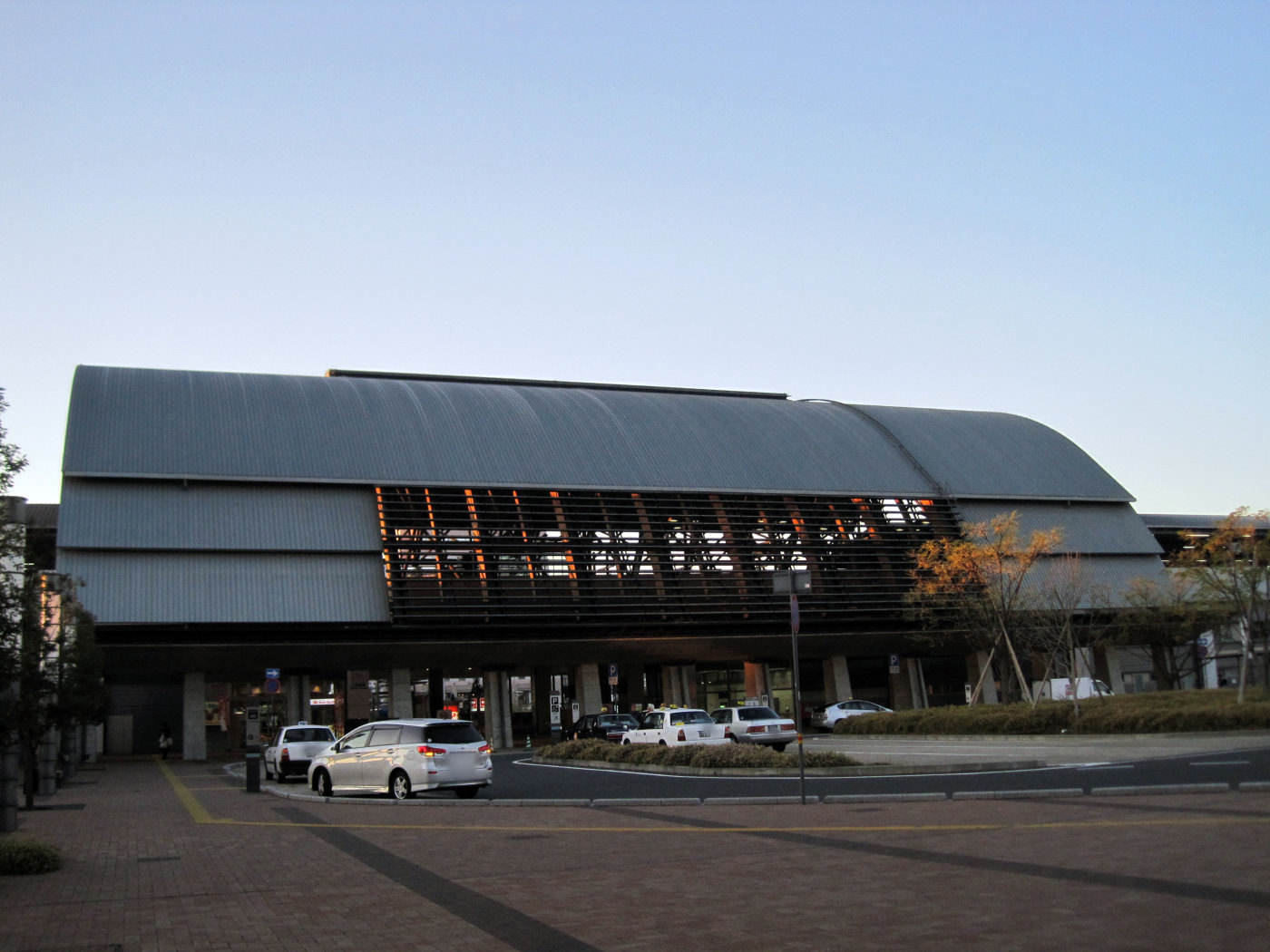 60.9m、南北に38.5m、高さ23.3mで、杉のみではメンテナンス上問題があるため、外部にチタン亜鉛合金を使用してい。駅舎では、南国の明るく