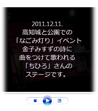 「なごみの灯り」のイベントで 金子みすずの詩に曲をつけて歌われている「ちひろ」さんのステージがありました・・・「こだまでしょうか?」は撮れませんでしたが・・・・。ステキな歌唱です。