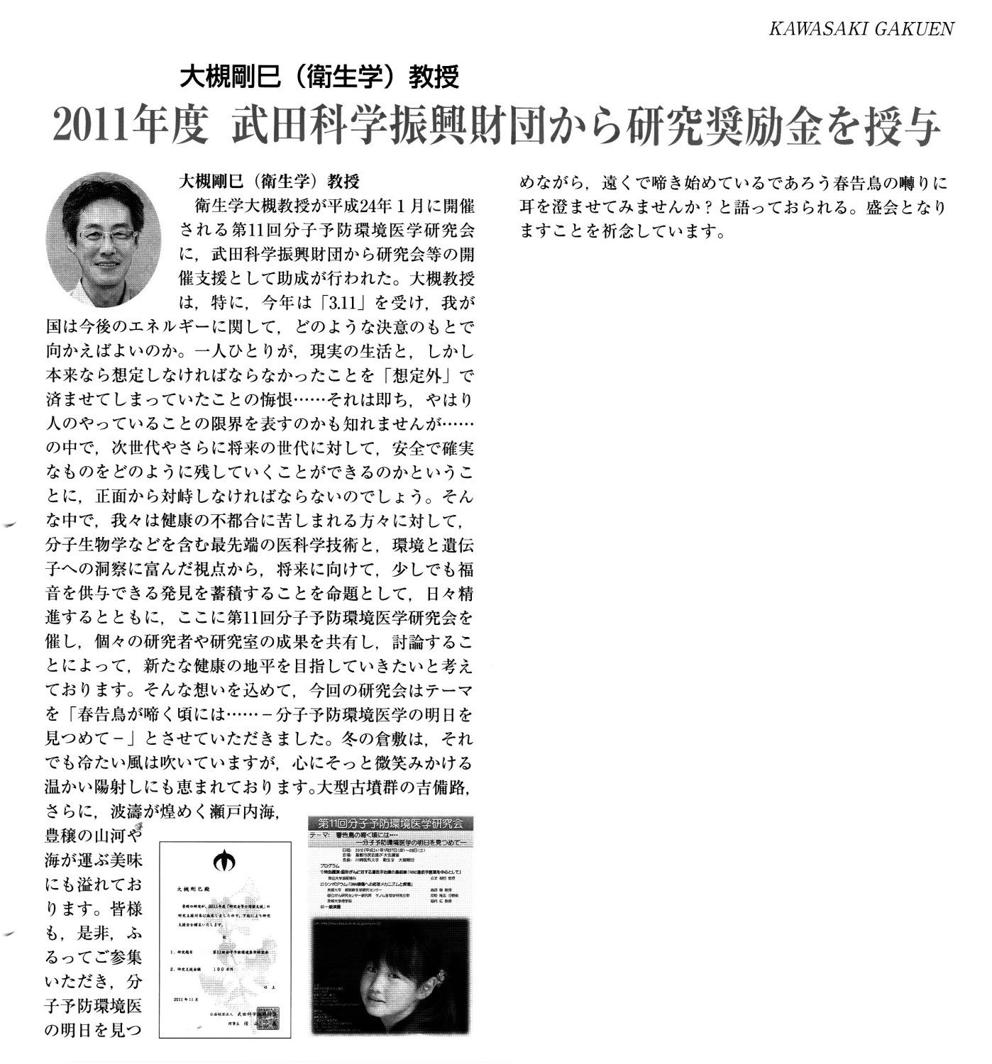 来年1月27-28日に倉敷市民会館2階大会議室で行う第11回分子予防環境医学研究会に対する「研究会塔の開催支援の助成金」を受けましたが,その記事を掲載していただきました。