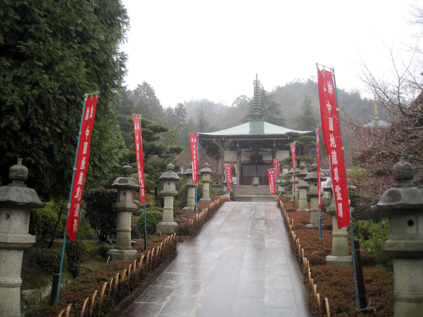 【伝教大師最澄が入唐の際、立ち寄って開いた天台宗のお寺。次いで慈覚大師が秘密灌頂の道場とした。その後、平家滅亡と運命を共にした安徳天皇の御在所「穴泉の御所」が設けられしばらく滞在したといわれる。寺域が広く、応天門を通り、杉や松がうっそうとした参道を通ると、境内の客殿や多宝塔、庭園が目をひく。特に、さつきの咲くころが美しい。室町時代に制作された仏涅槃図は、県指定重要文化財。】だそうです。
