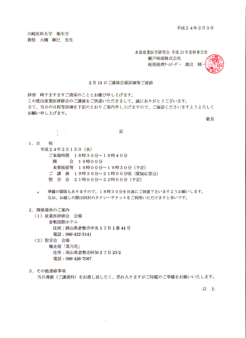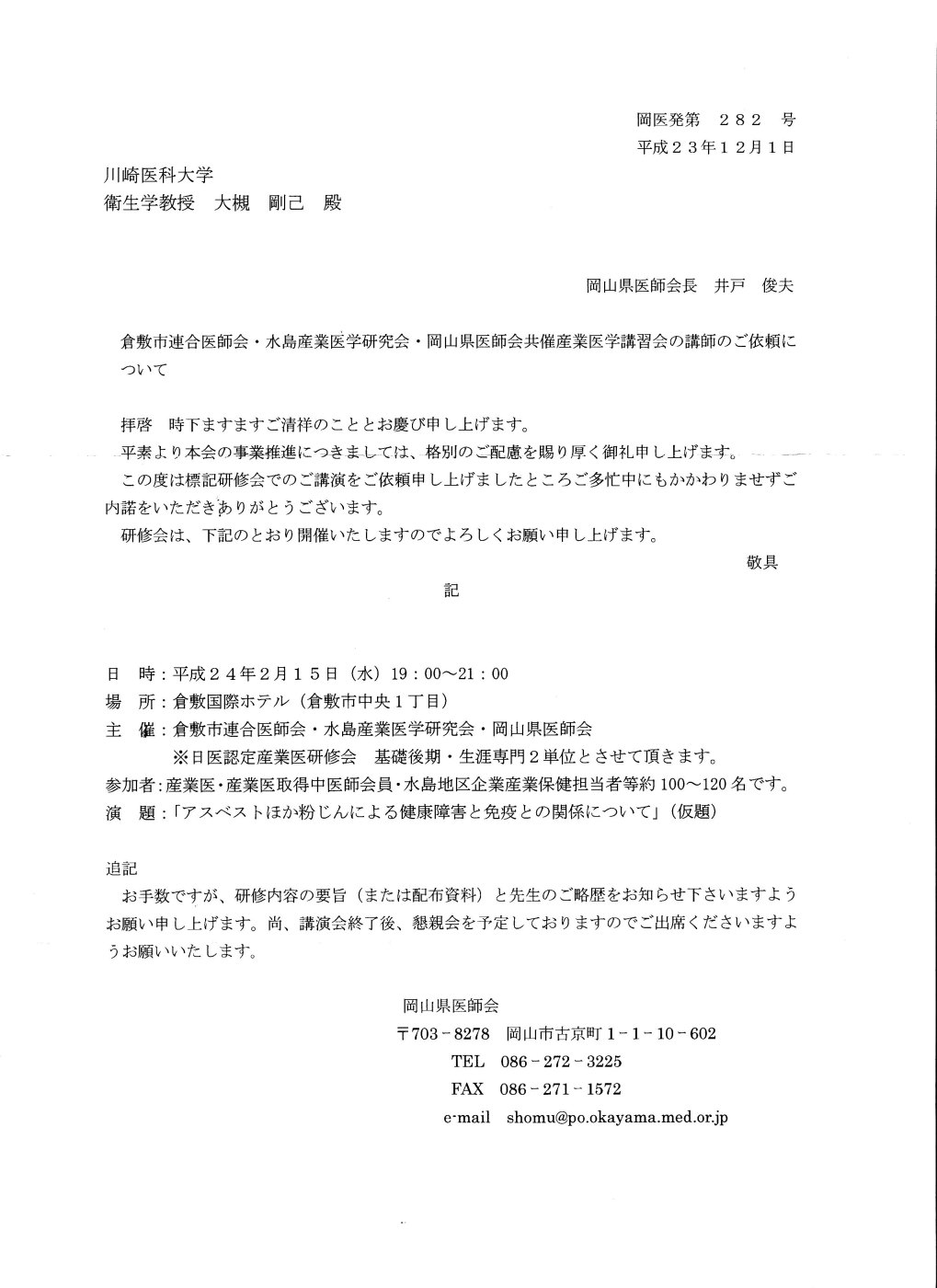 水島産業医学研究会(倉敷市連合医師会・岡山県医師会共催講習会)の講師として「アスベストほか粉じんによる健康障害と免疫との関係について」と題して90分の講演をしてきました。