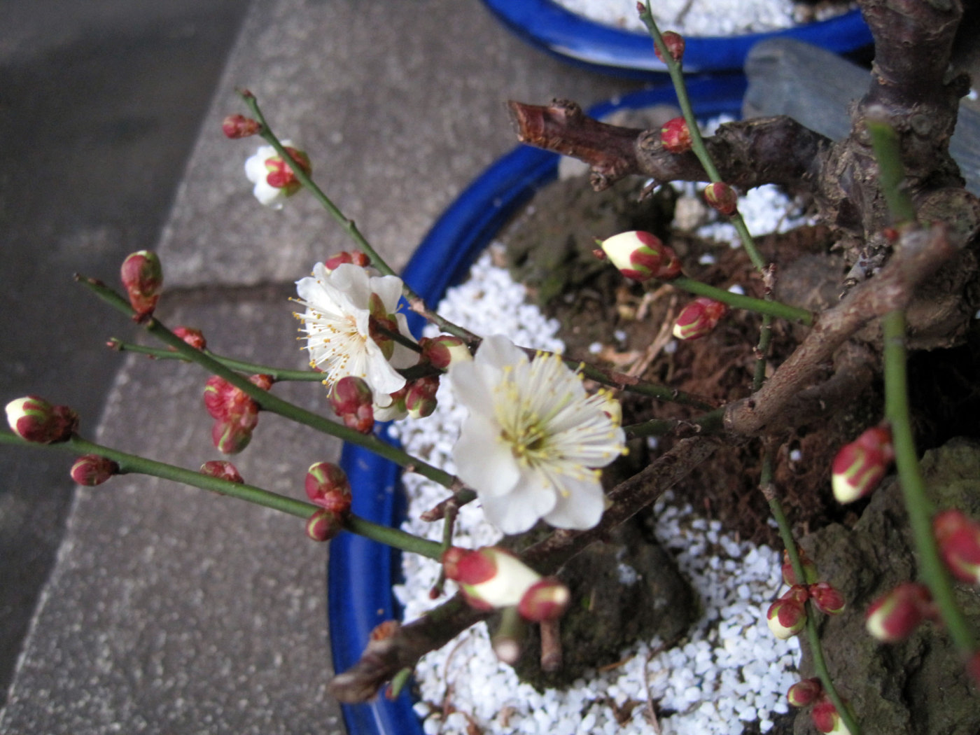 倉敷紡績記念館の所には,鉢植えの梅が,一輪,二輪。。。咲き始めていました。春も近い?
