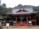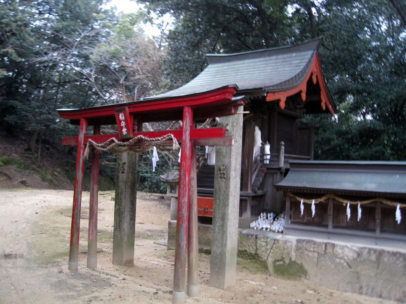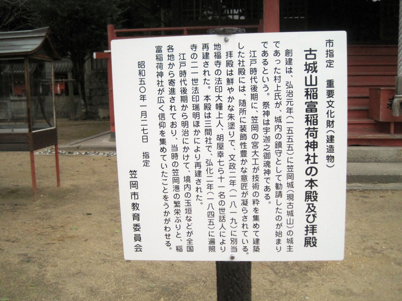 【古城山の中腹にある稲富稲荷神社は、弘治元年(1555)、村上隆重が古城山に築城したとき、城内の鎮守としてまつったのが始まりという。江戸時代後期には境内の工作物が全国各地から寄進されており、広く信仰を集めていたことがうかがわれる。その社殿は、江戸時代後期に、笠岡在住の宮大工が技術の粋を集めて建築したもので、市の重要文化財に指定されている。鮮やかな朱塗りが印象的な拝殿は、建物全体に装飾性豊かな意匠を凝らしており、内部の天井には、見事な花鳥、動物の絵が描かれている。棟札から、拝殿は文政2年(1819)、本殿は弘化2年(1845)の建築であることが分かっている。毎年6月には参拝者が「茅の輪」をくぐり罪やけがれをはらい、無病息災を祈る夏越祭が行われる。】だそうです。