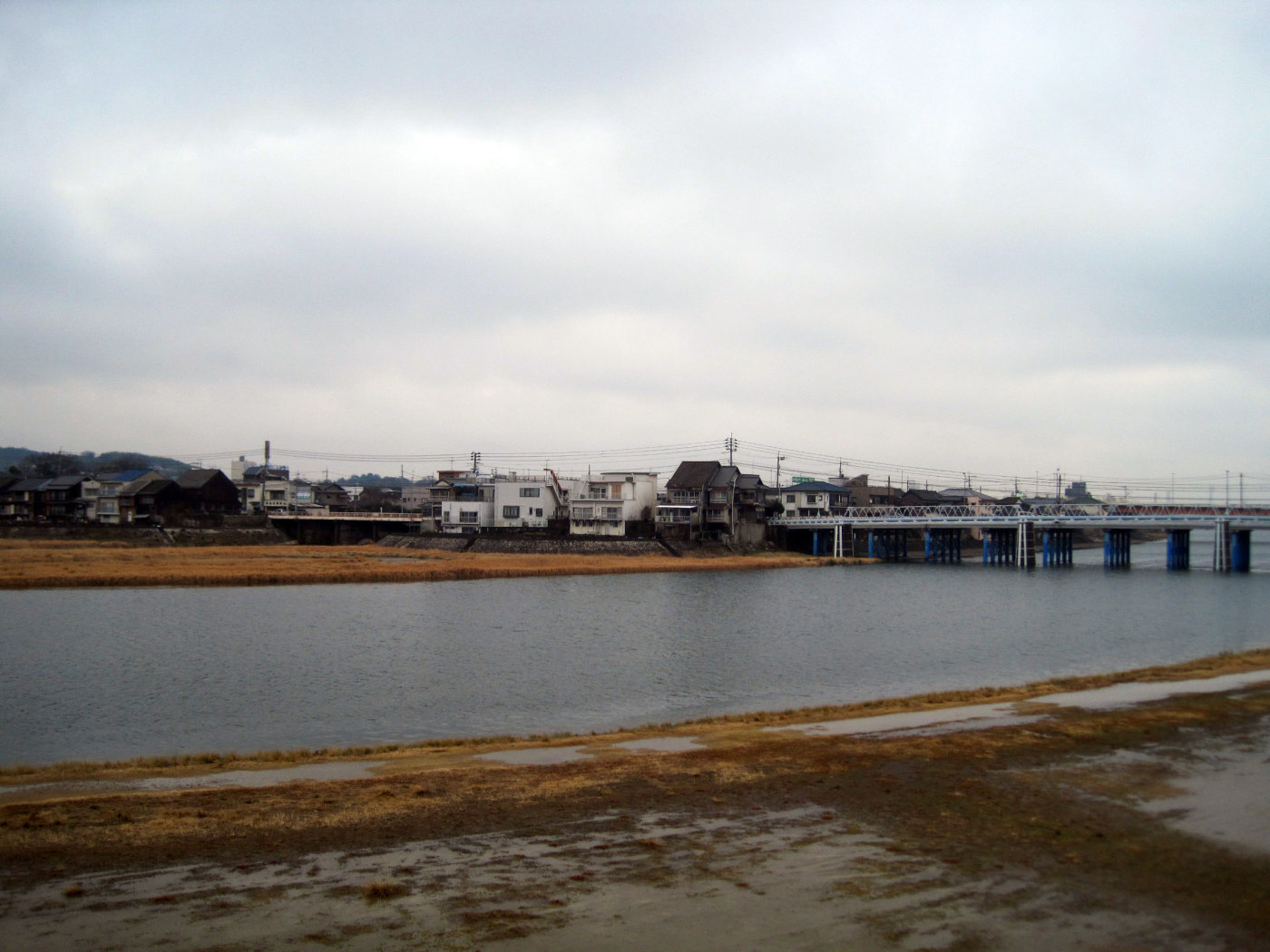 さて,河川敷に降りて,下流の方へ歩きましょう(足元が雨で悪いのですが)。