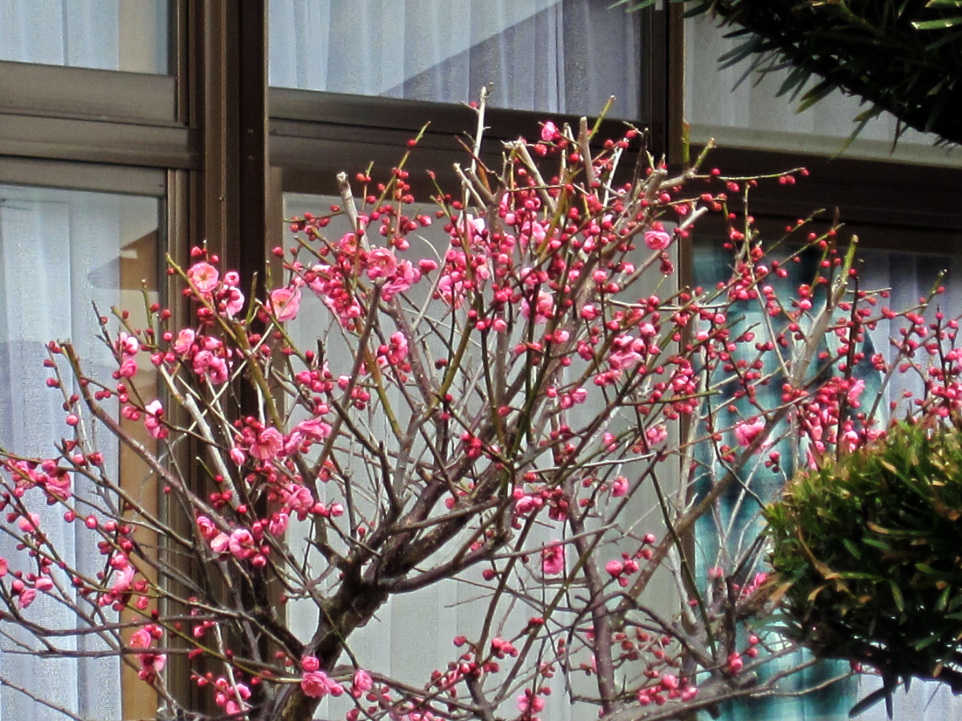 そして,隣家の庭には・・・紅梅が・・・もうすっかり蕾も膨らんでいます・・・そうか,2月ももう終わりですよね!