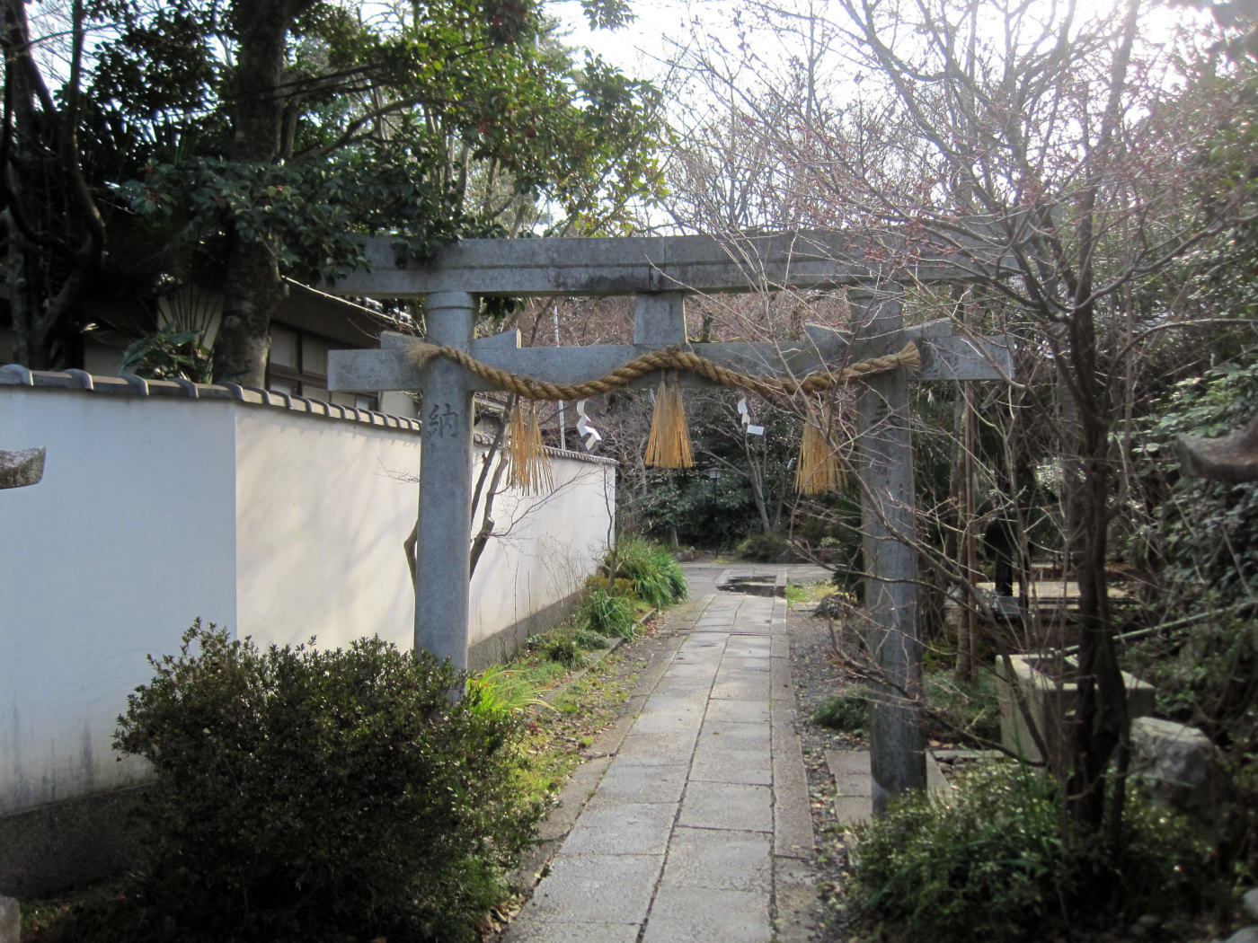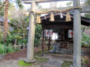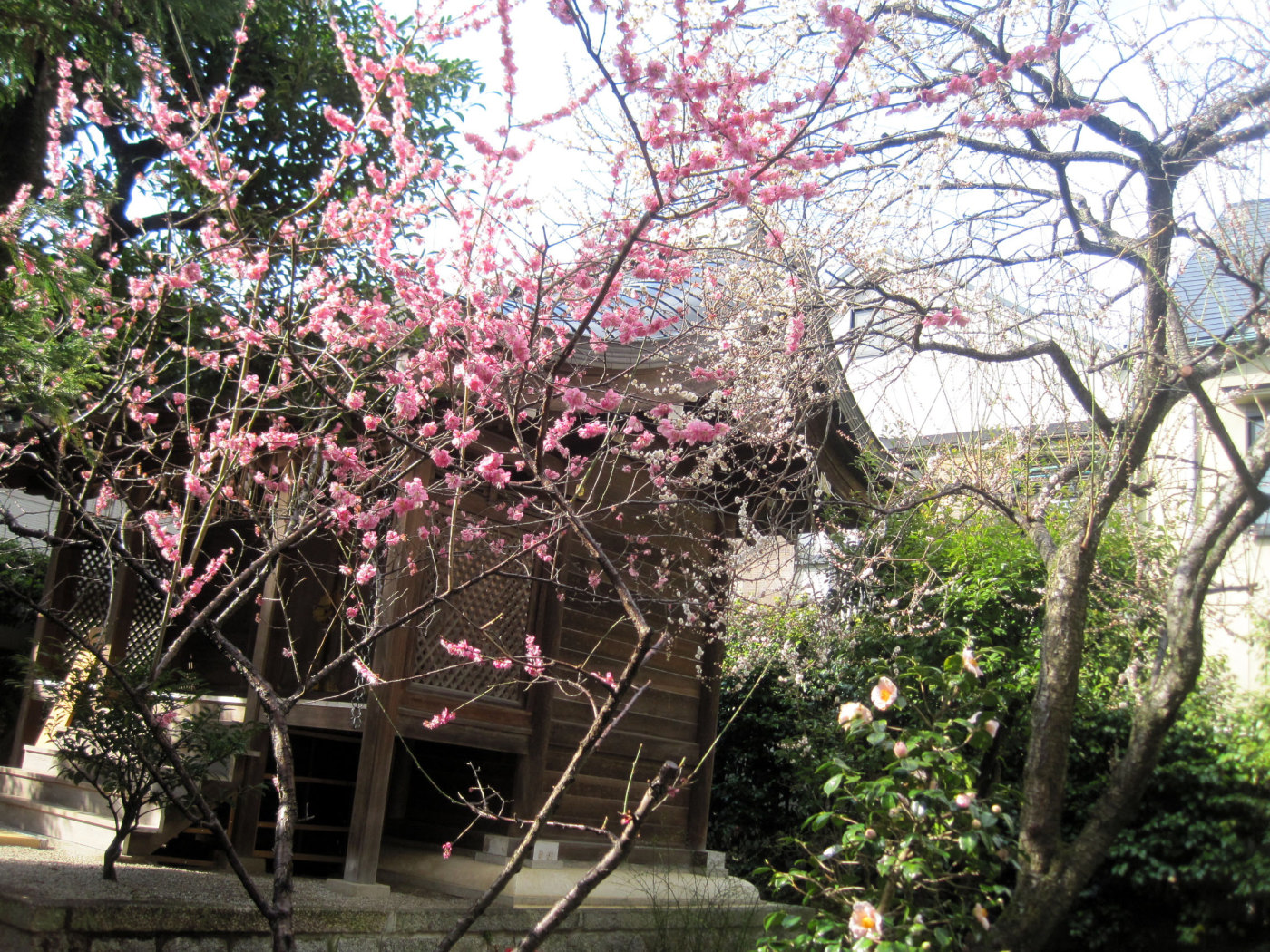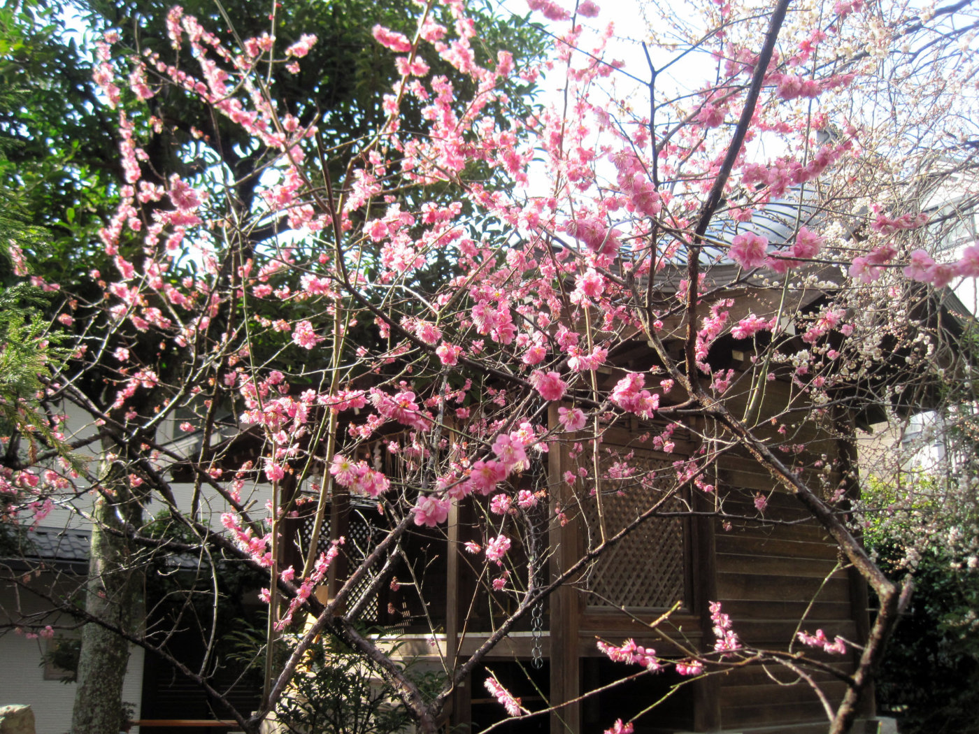 石段を下りて,また,別の末社・・その近くには,紅白の梅が・・・。