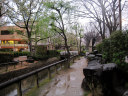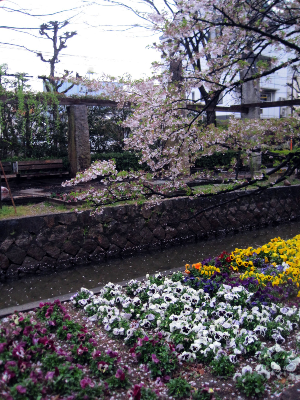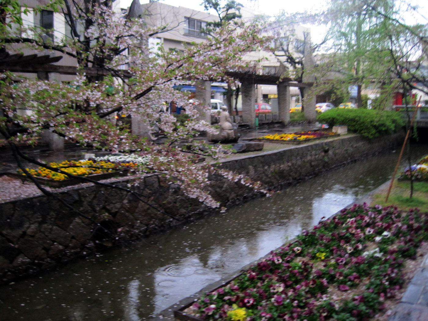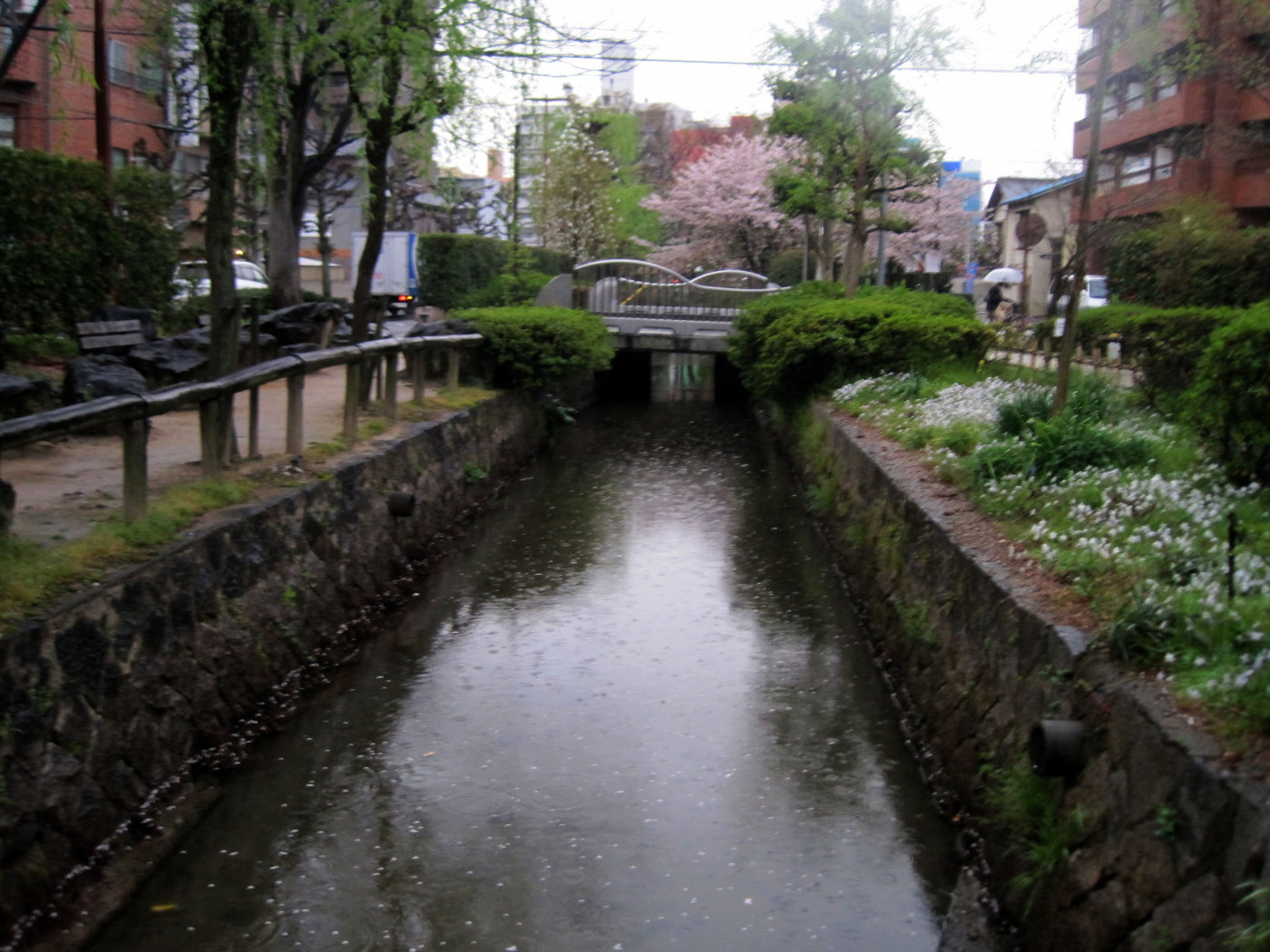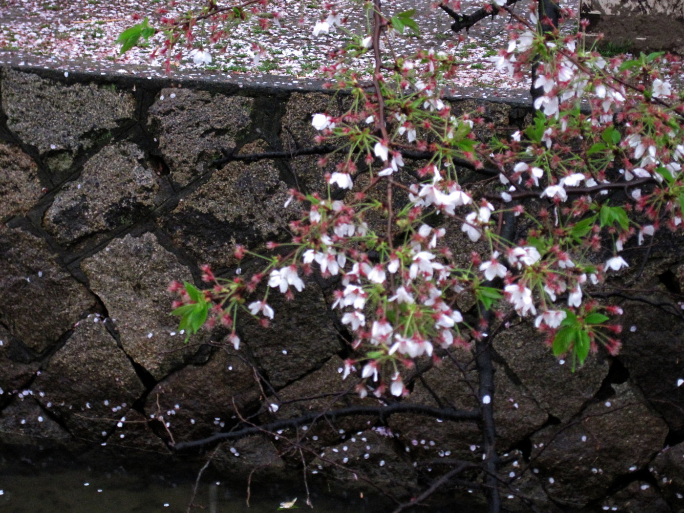 川面にも花びらが流れています,そして雨粒が波紋を広げています。