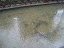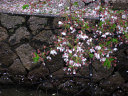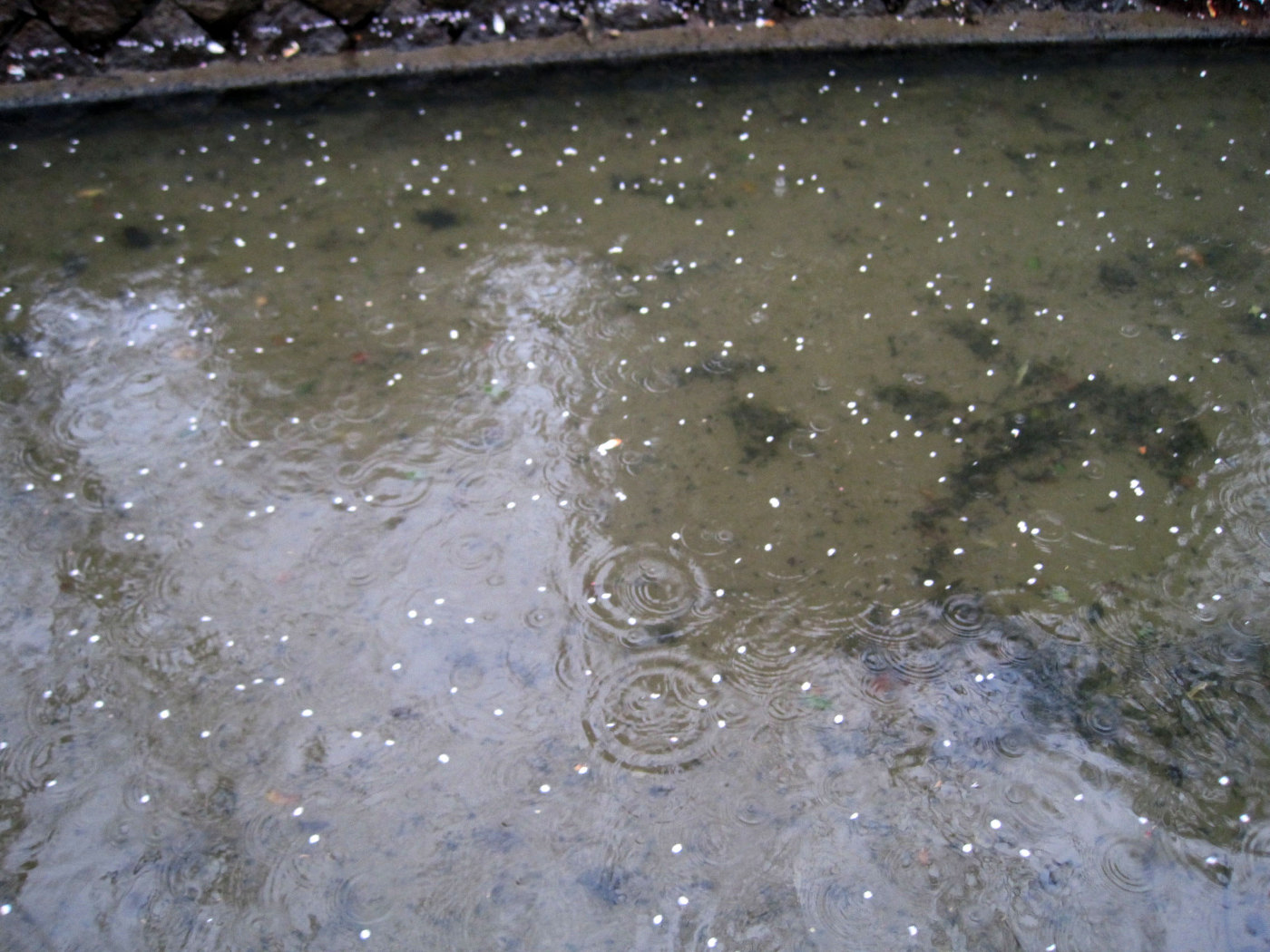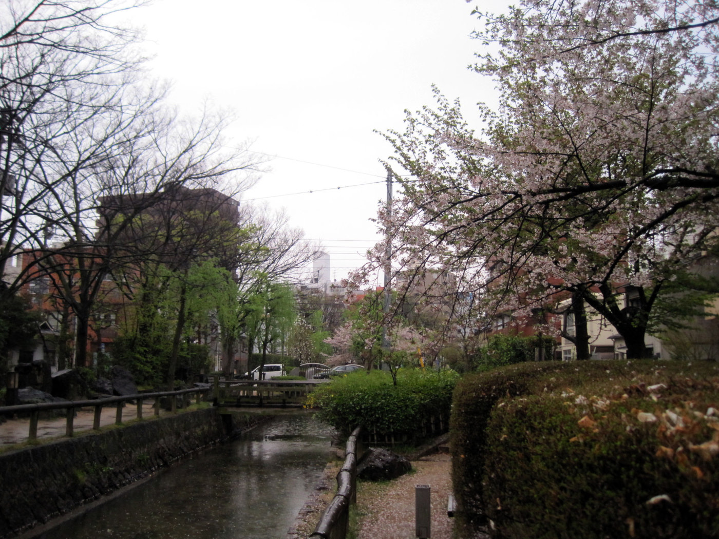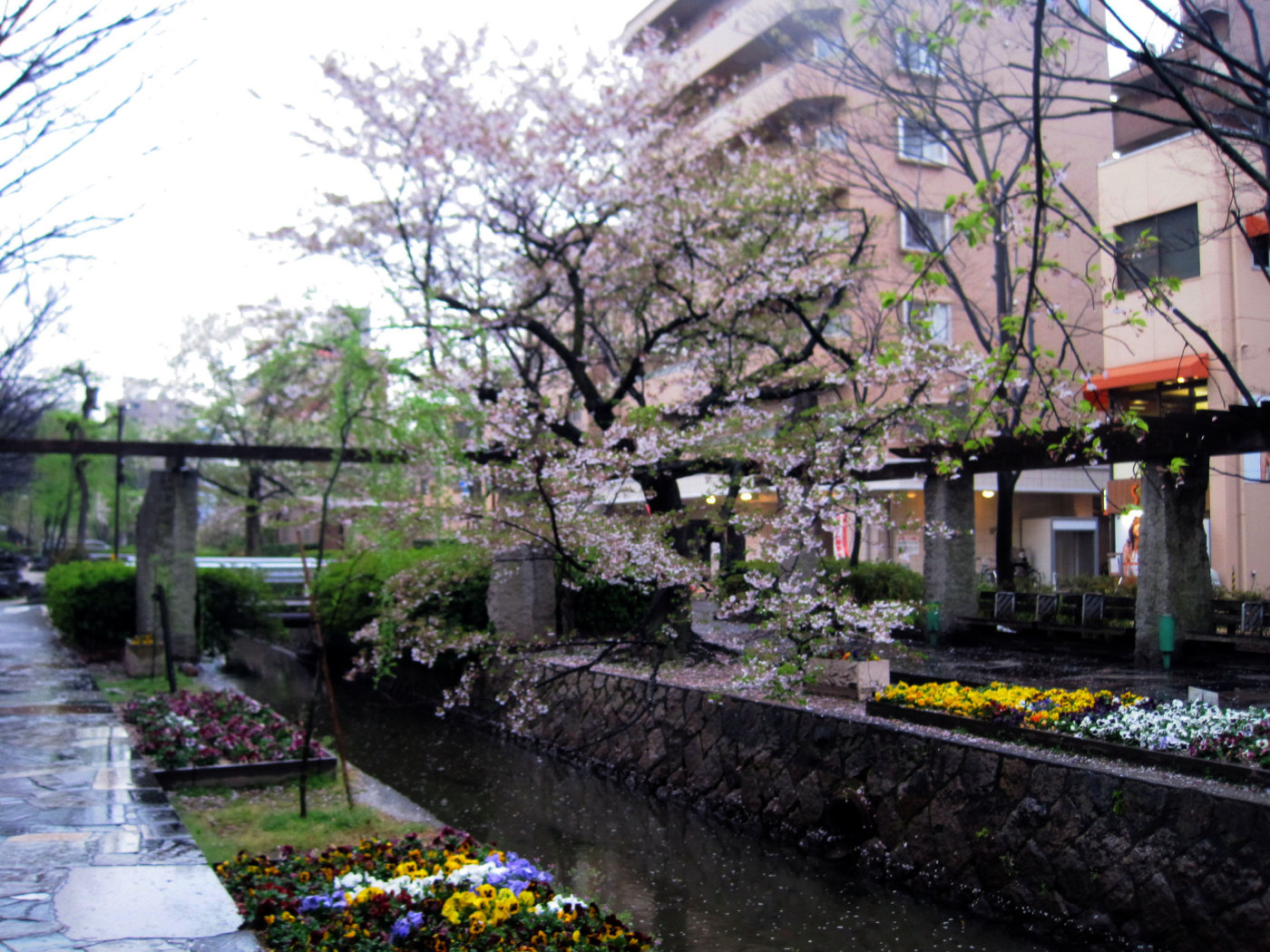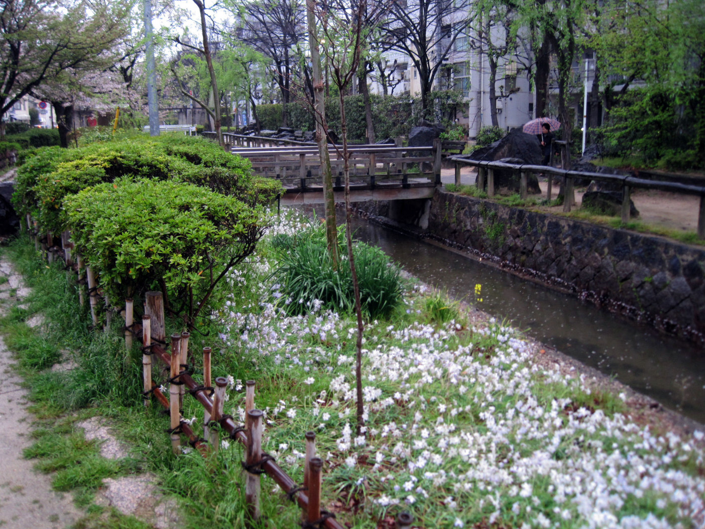 川面にも花びらが流れています,そして雨粒が波紋を広げています。