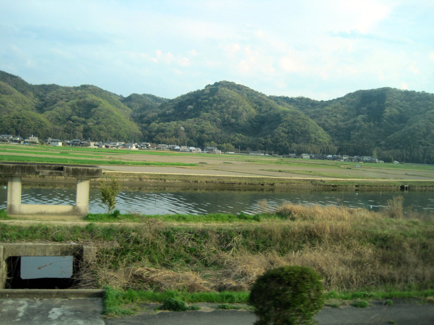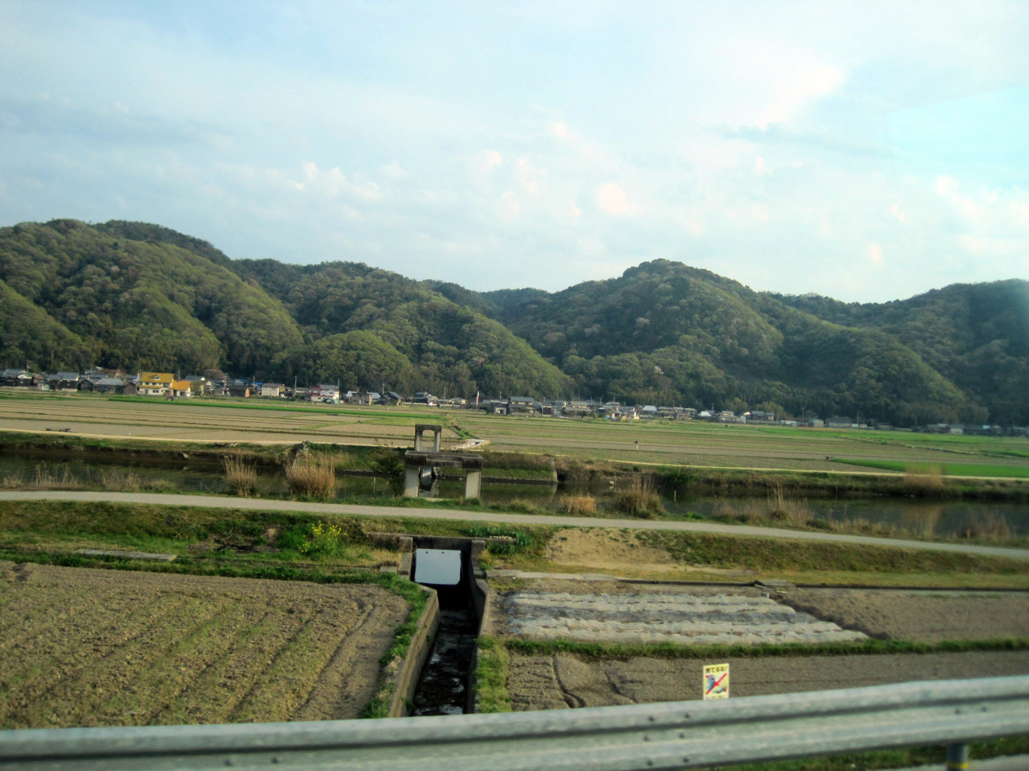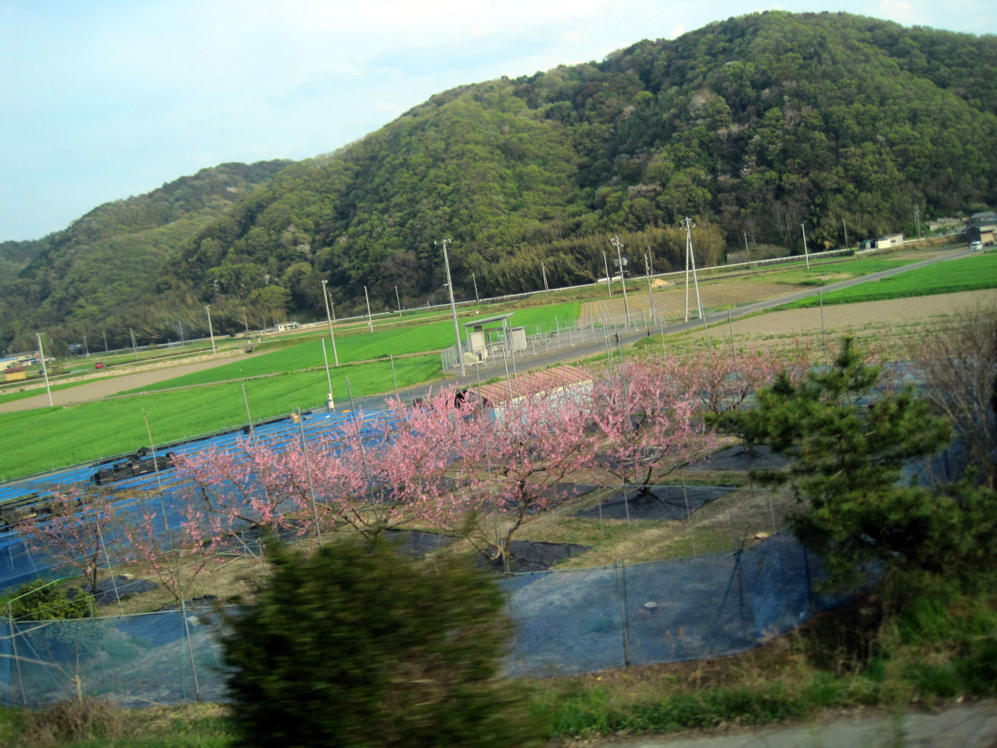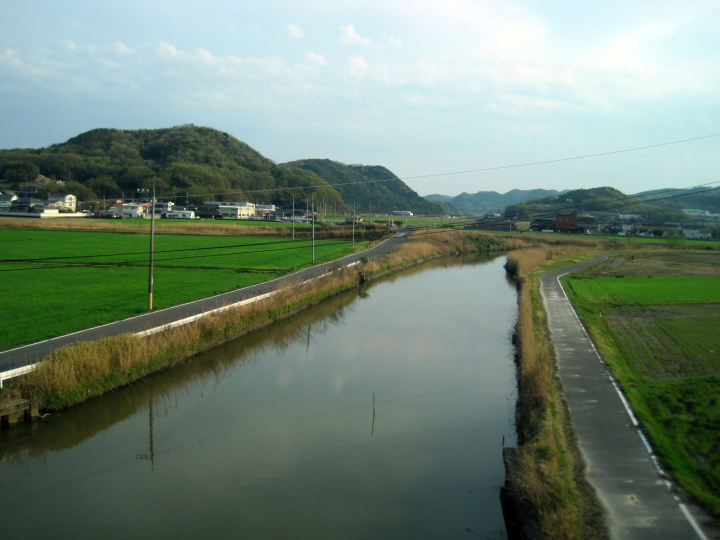 瀬戸内市邑久町の田畑と千町川・・・所によって桃の栽培をされています。