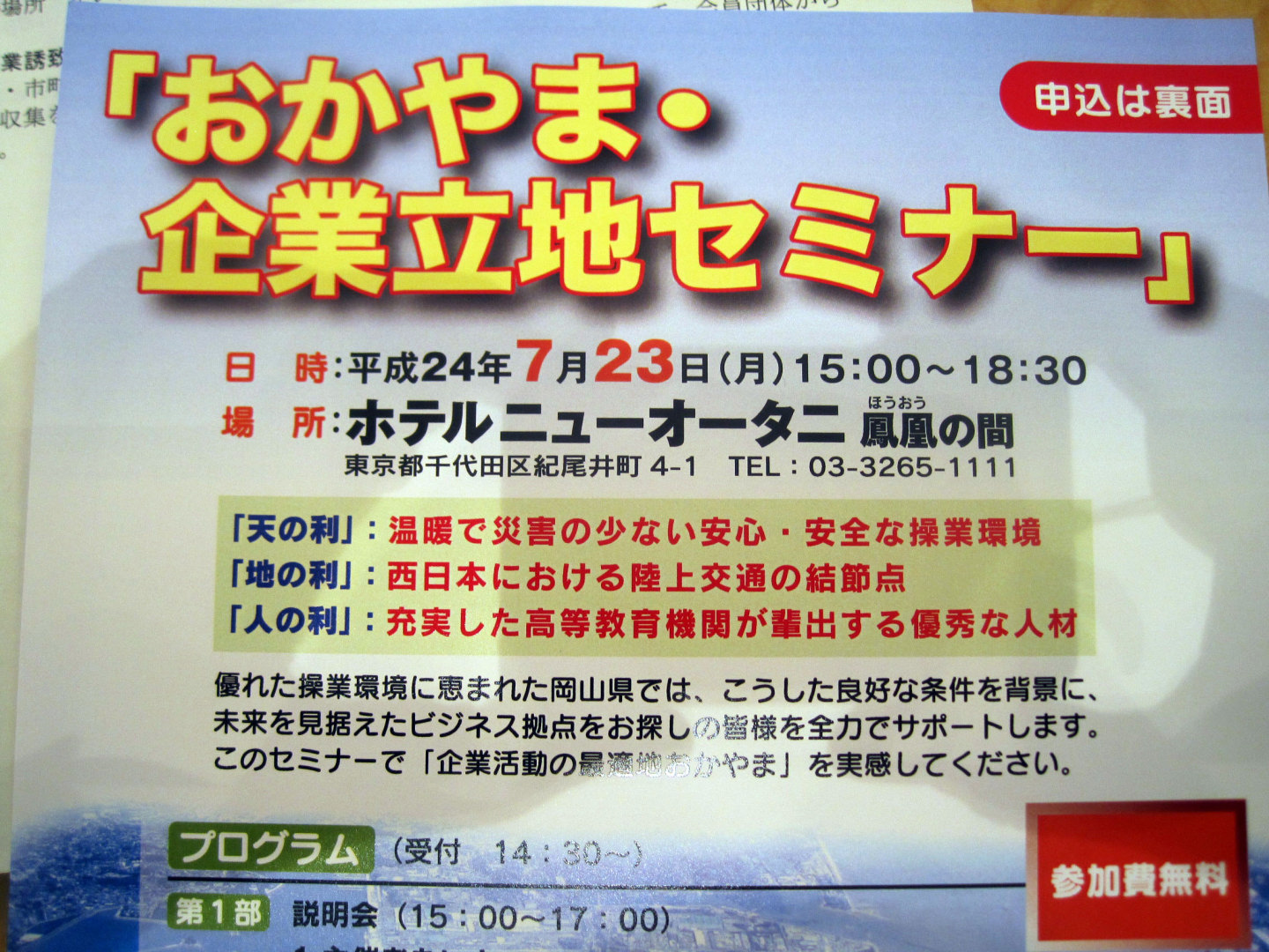 昨年度から,東京ホテルニューオータニで企業立地セミナーを開催され,知事自らの県のPRの様です!!