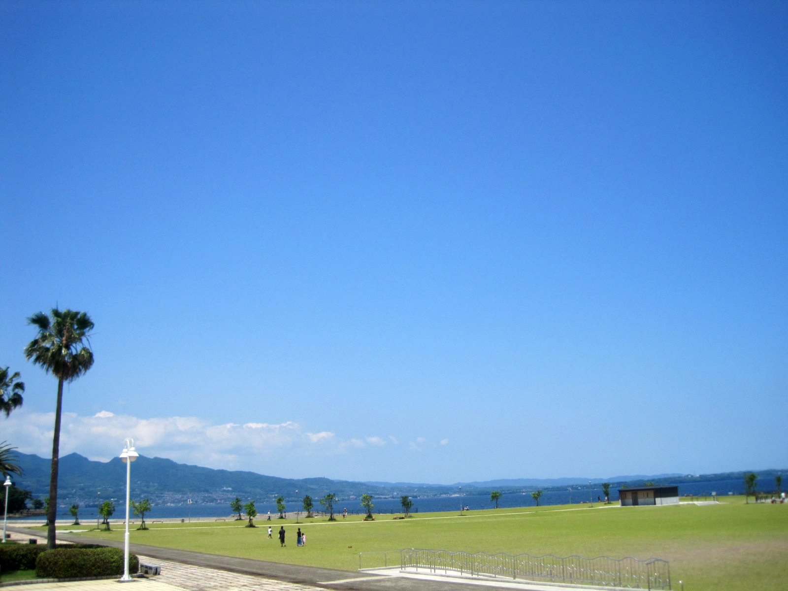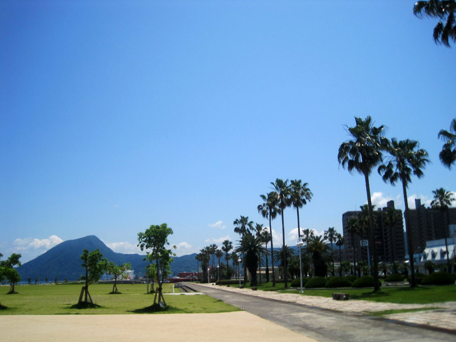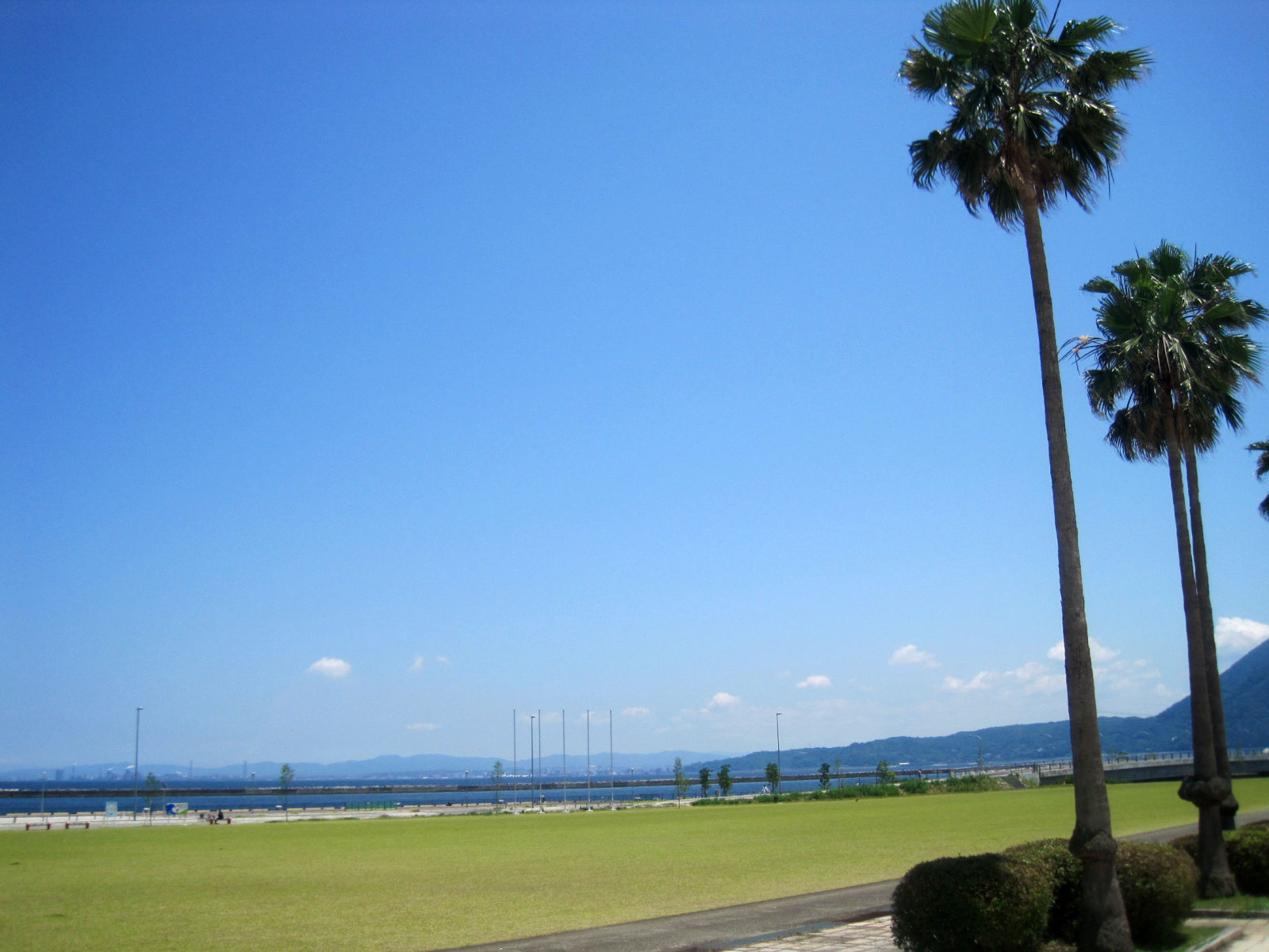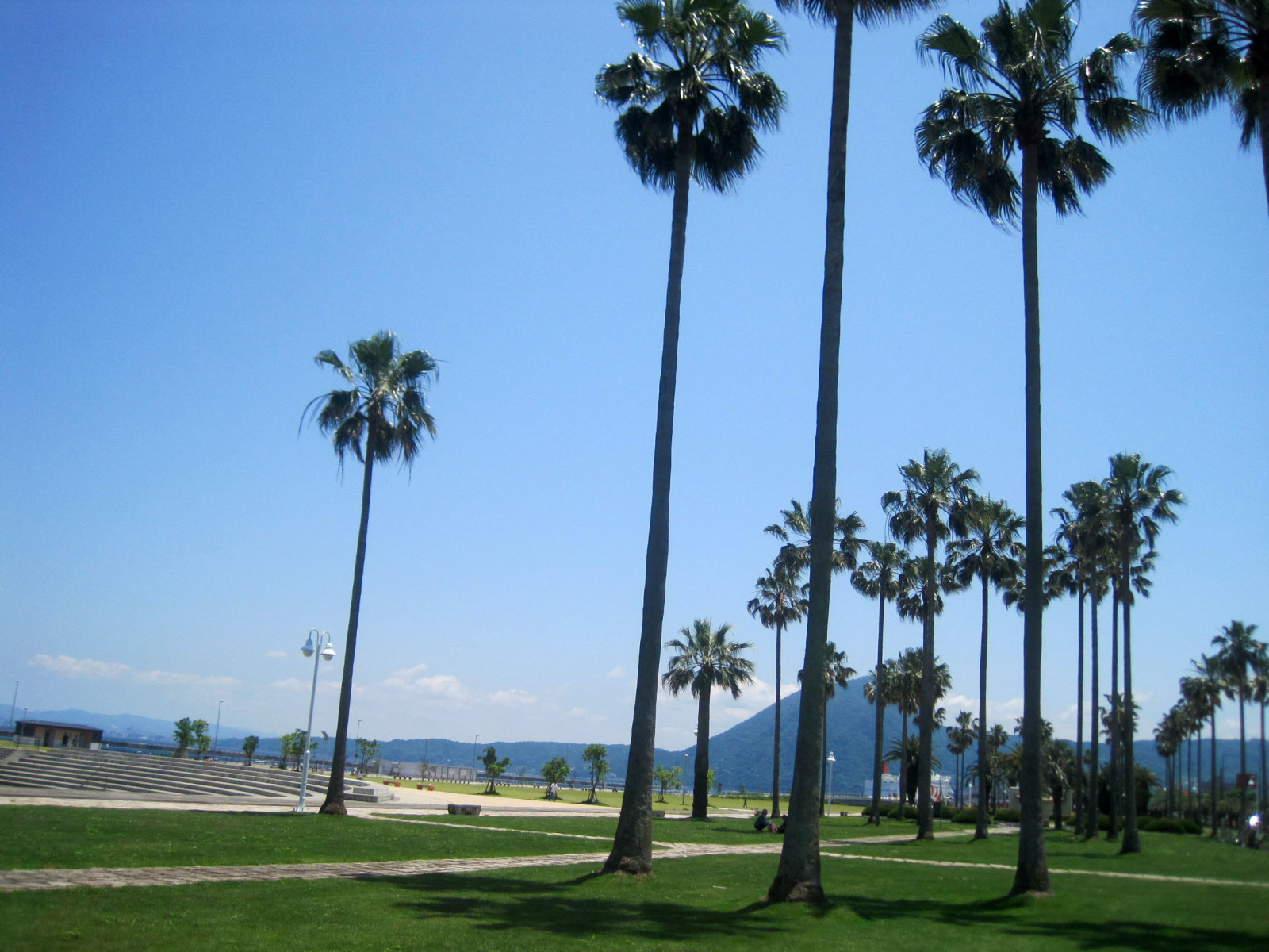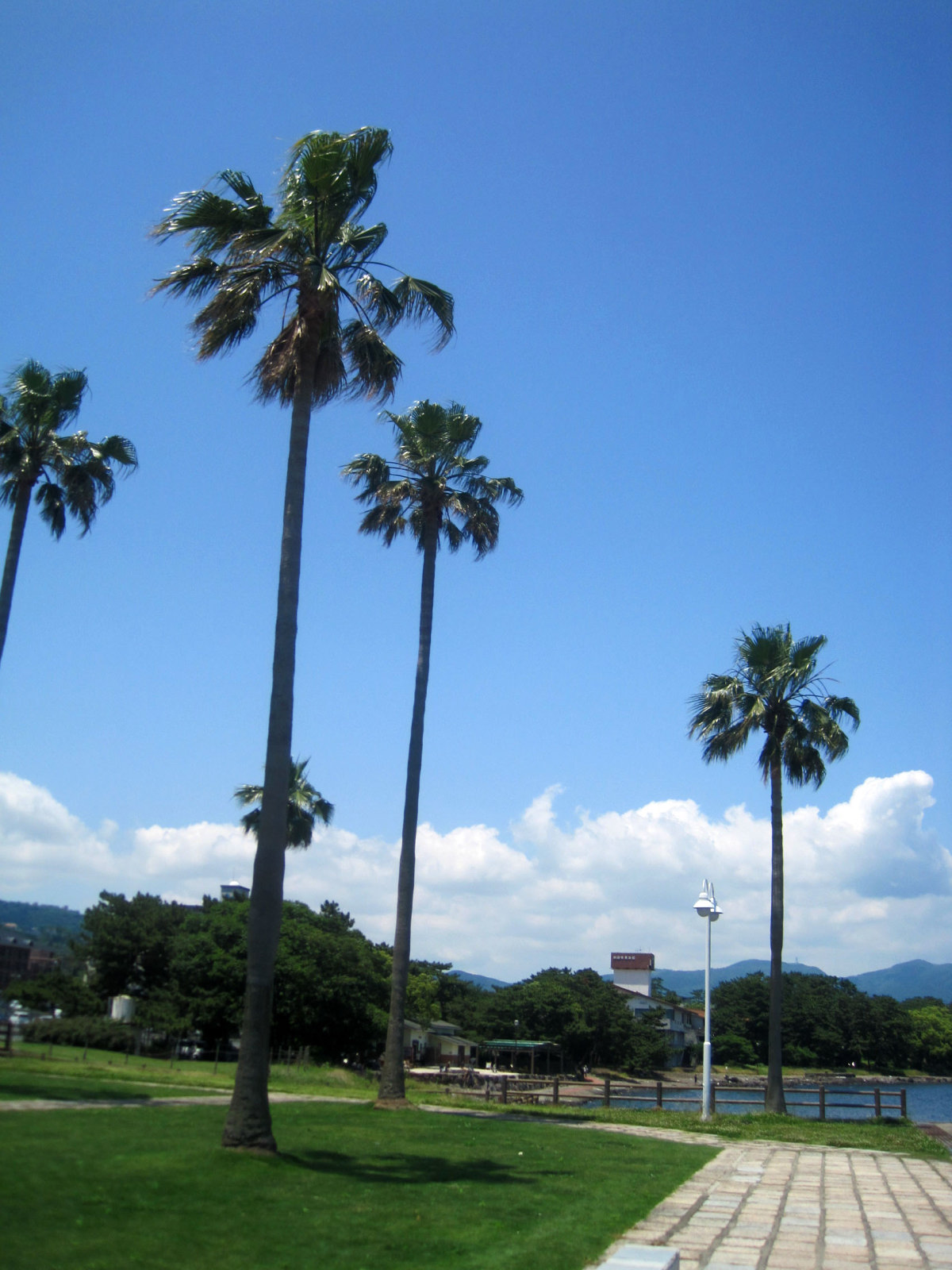 別府湾岸に作られた市民公園という感じですが・・・でも,空といい緑の芝生や南国めいた椰子などといい・・・絶品!