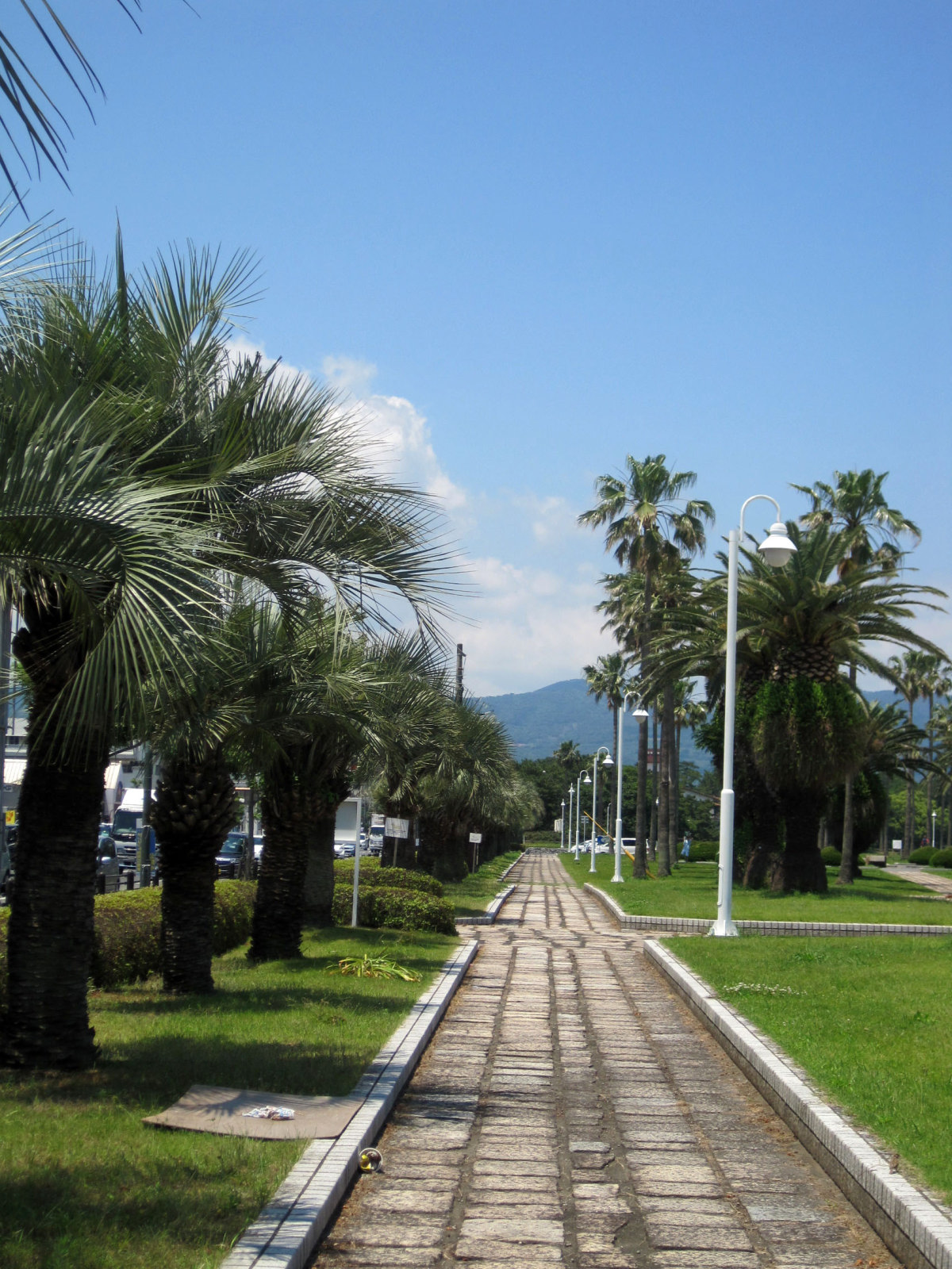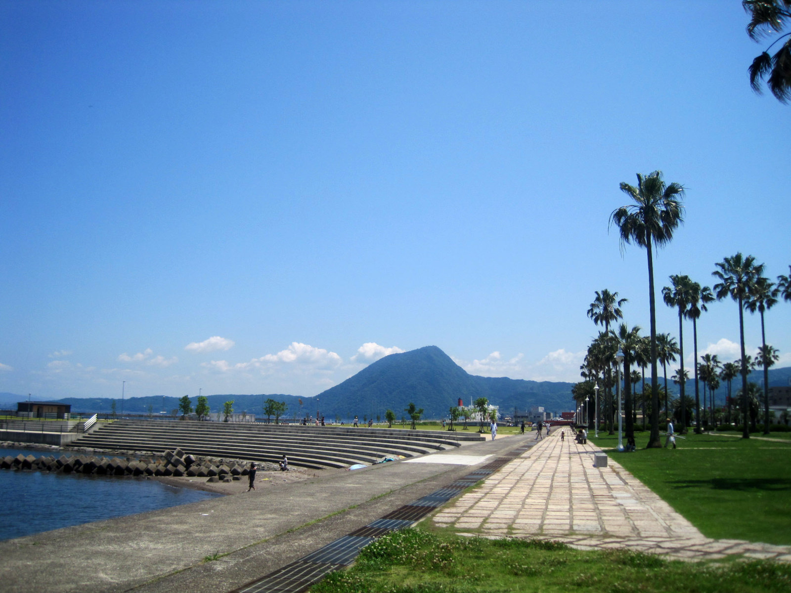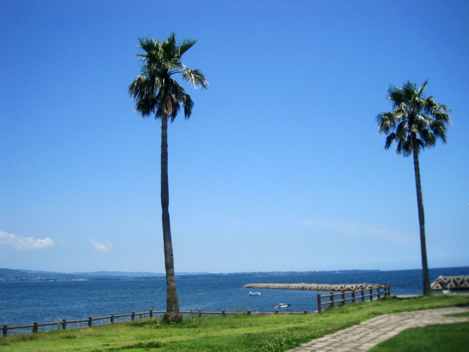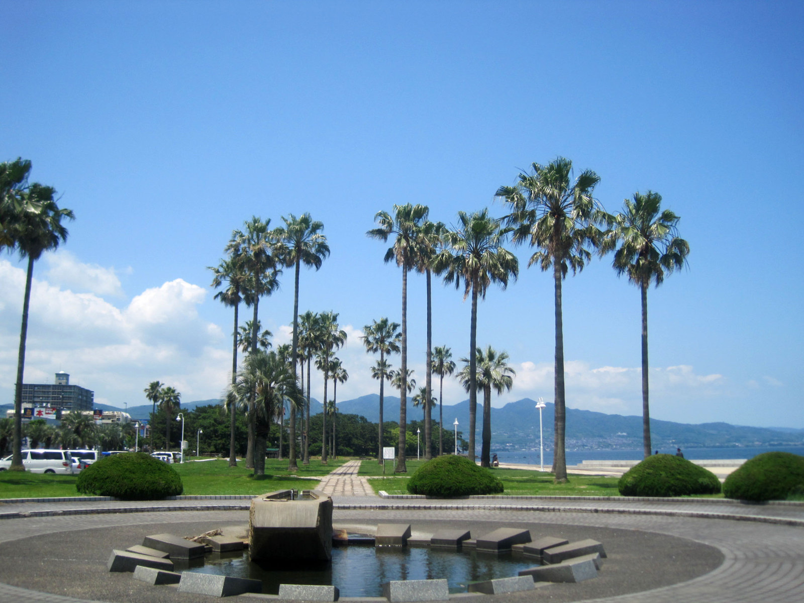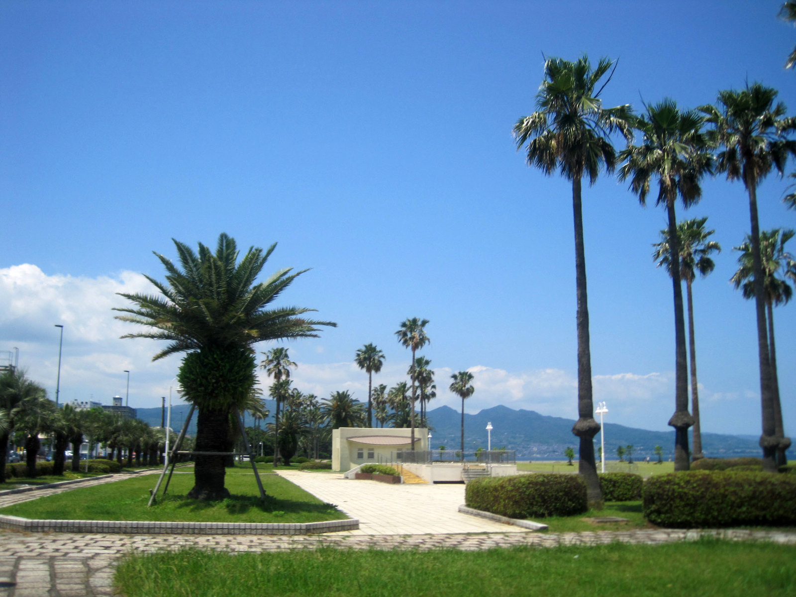【上人ヶ浜公園は別府市の北部にある海岸の公園です。園内には芝生広場や小さな展望台もあり、背の高いパームツリーから南国の雰囲気が漂います。国道10号沿いの好立地にあり、また、別府海浜砂湯や別府市美術館が隣接しています。】だそうです。うん? 展望台ってあったっけ?