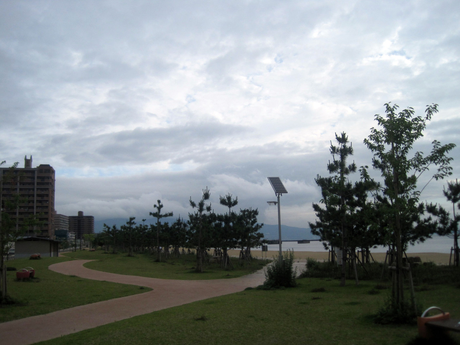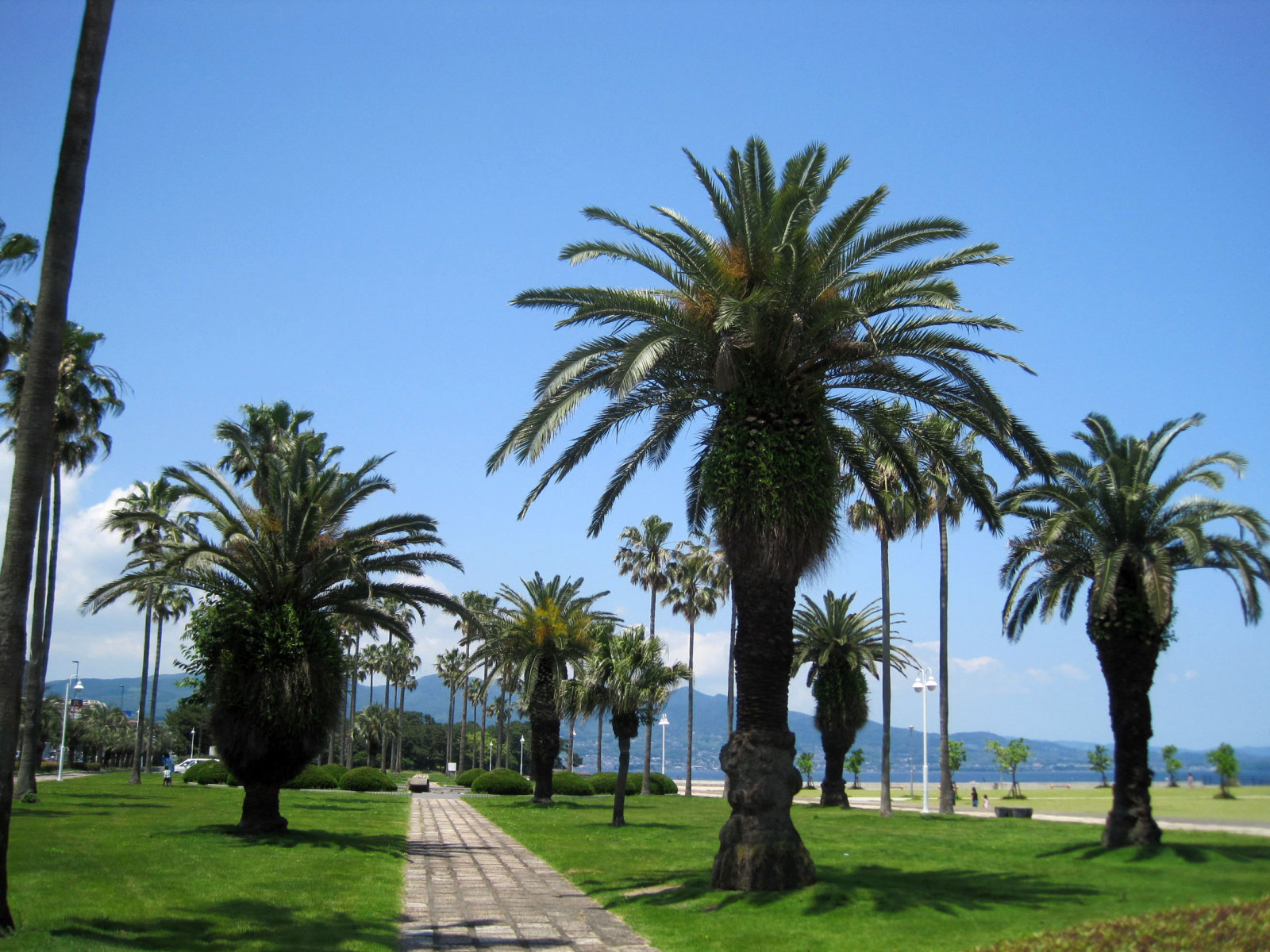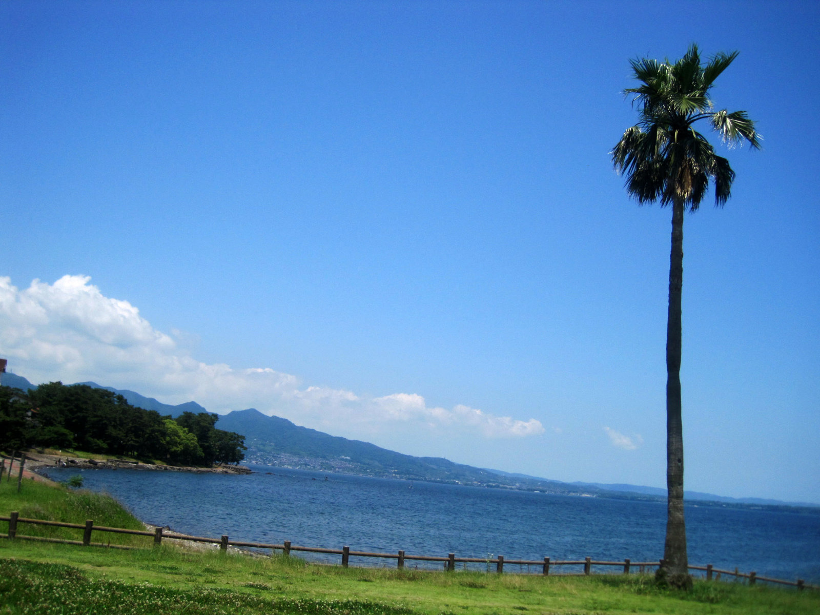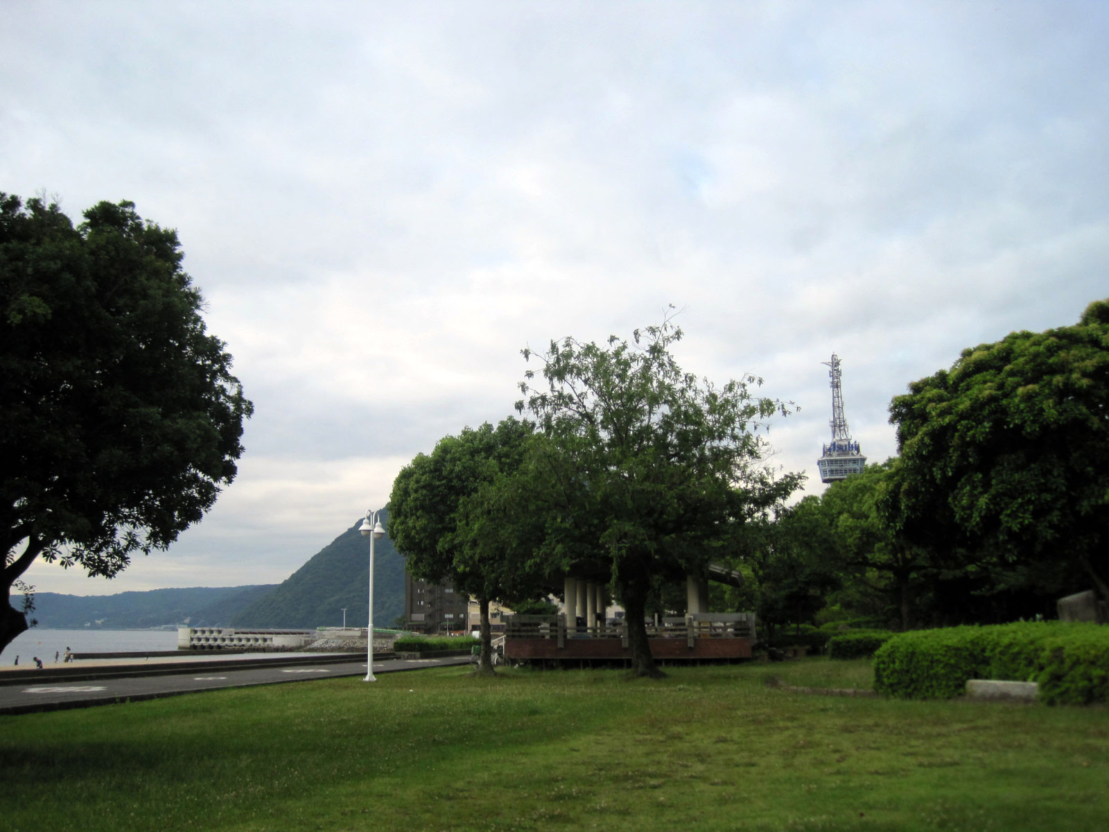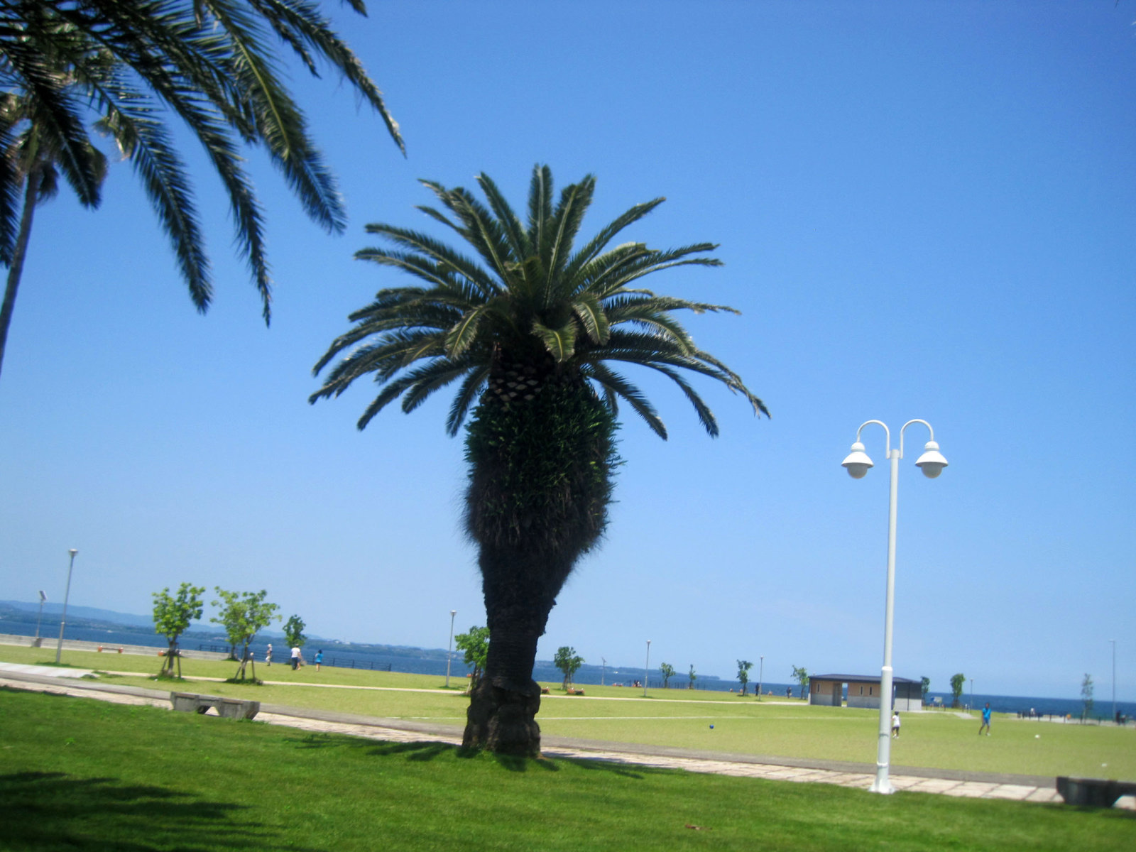【上人ヶ浜公園は別府市の北部にある海岸の公園です。園内には芝生広場や小さな展望台もあり、背の高いパームツリーから南国の雰囲気が漂います。国道10号沿いの好立地にあり、また、別府海浜砂湯や別府市美術館が隣接しています。】だそうです。うん? 展望台ってあったっけ?