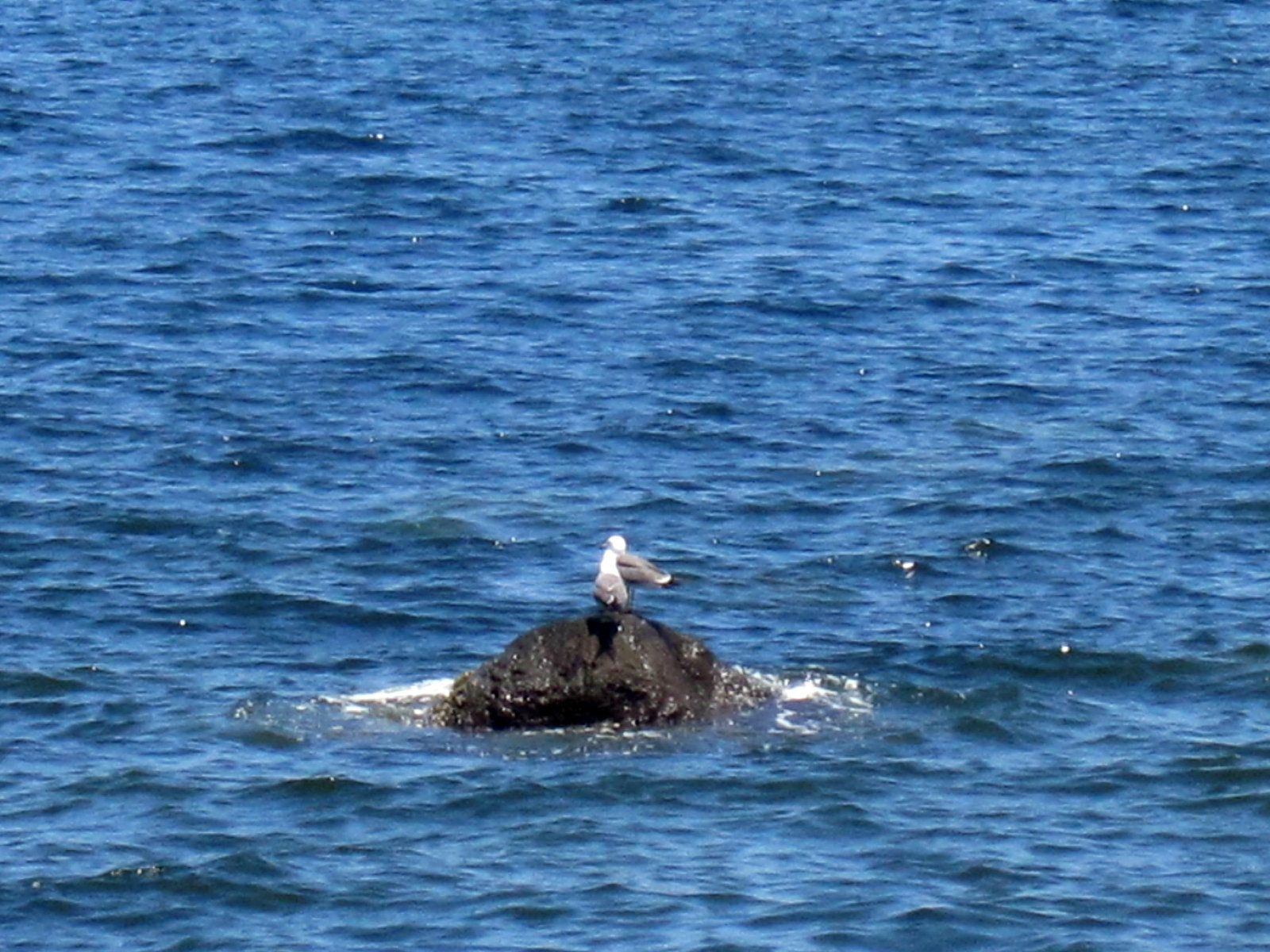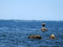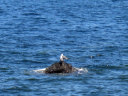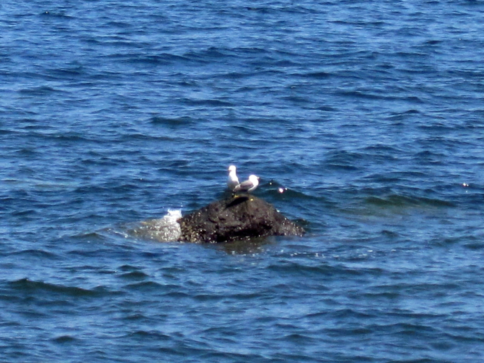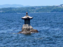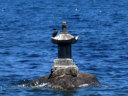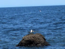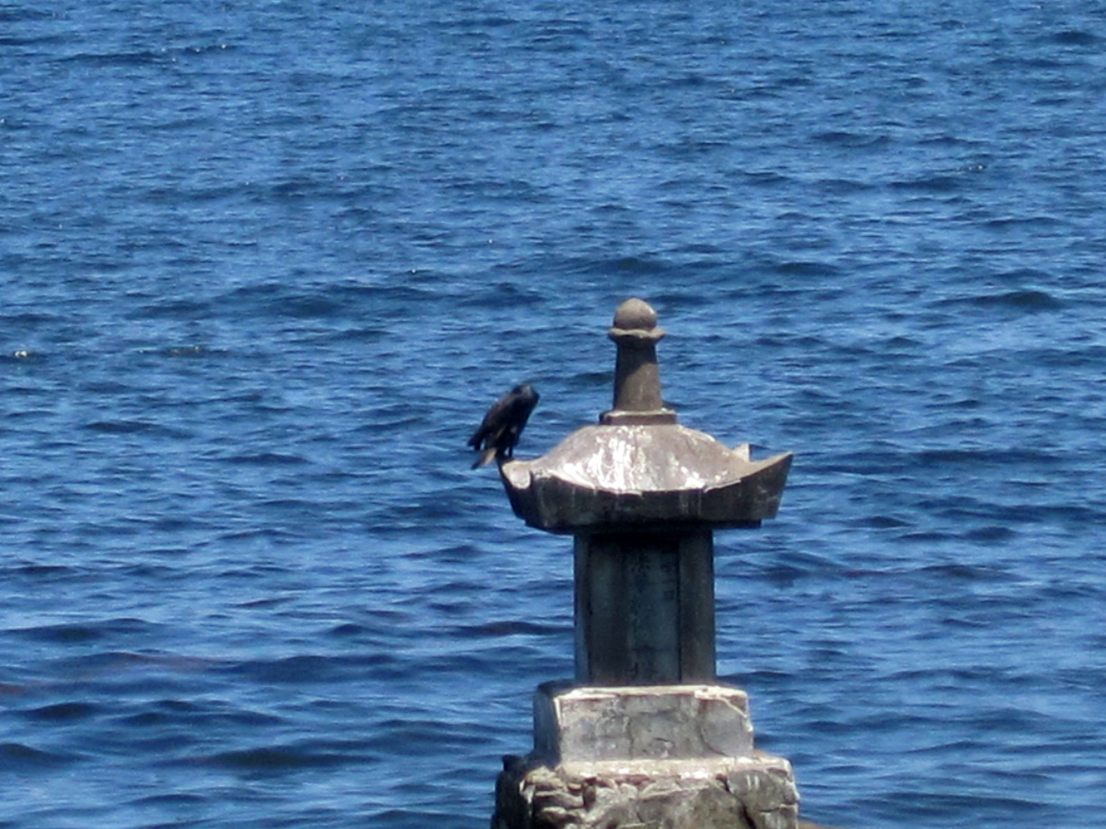 隣の岩にはカモメが二羽・・・お堂の屋根にも・・・ウミウ??