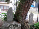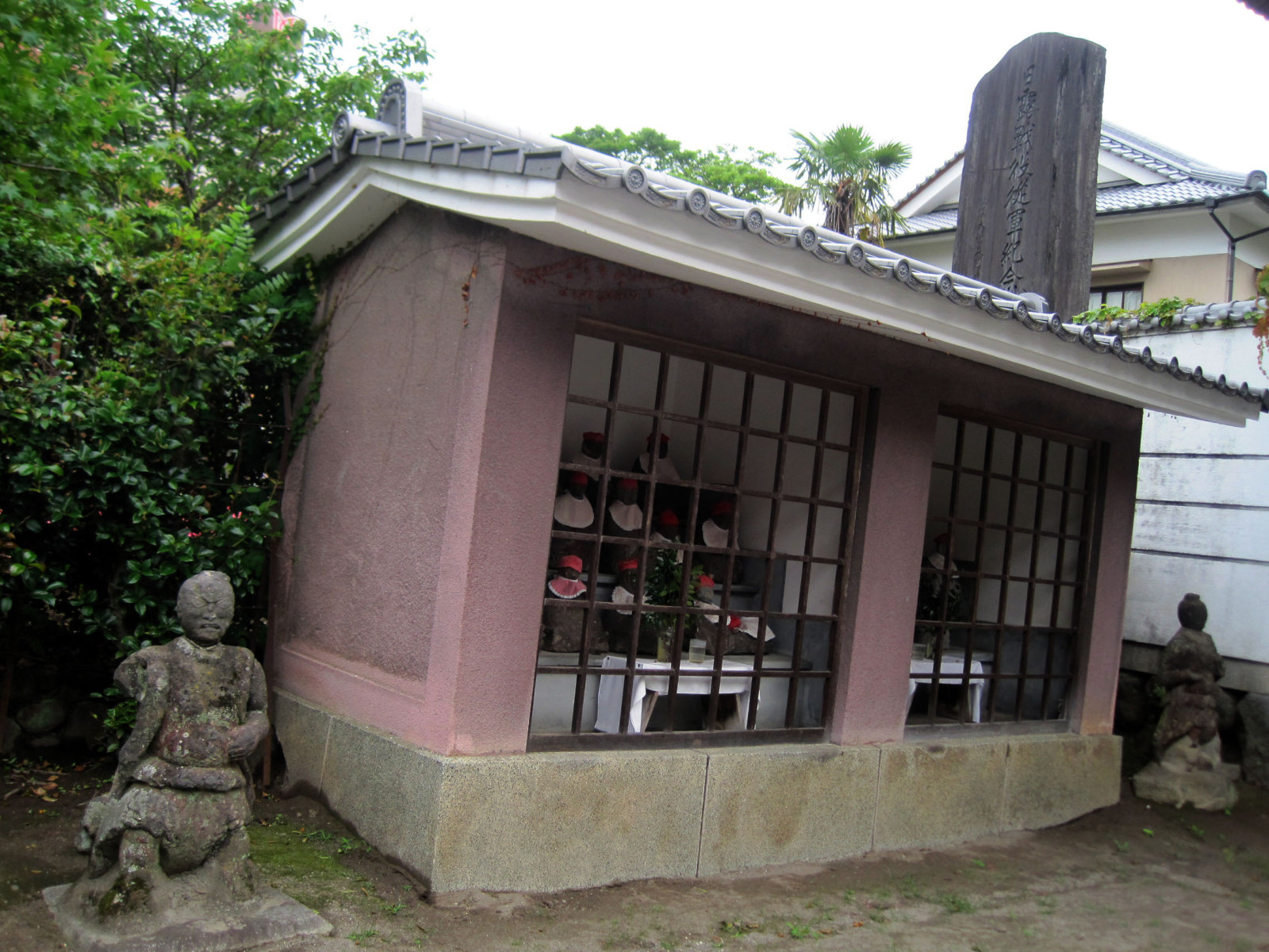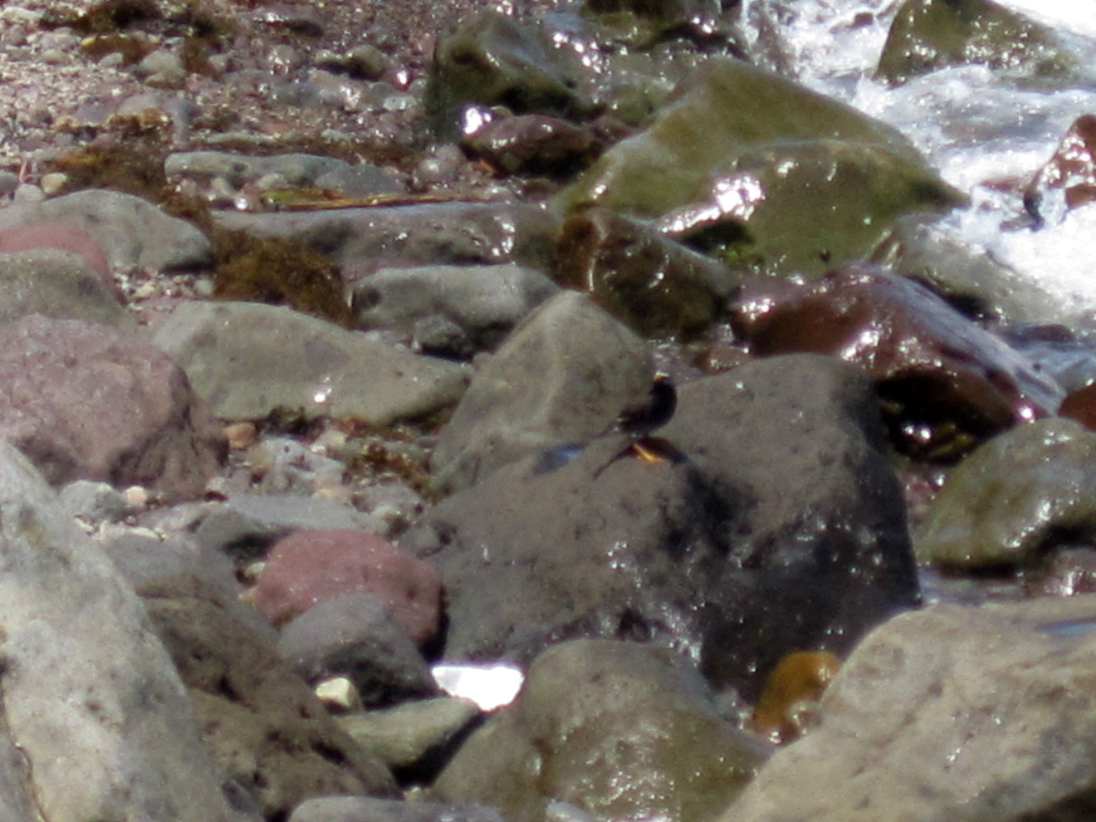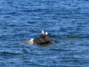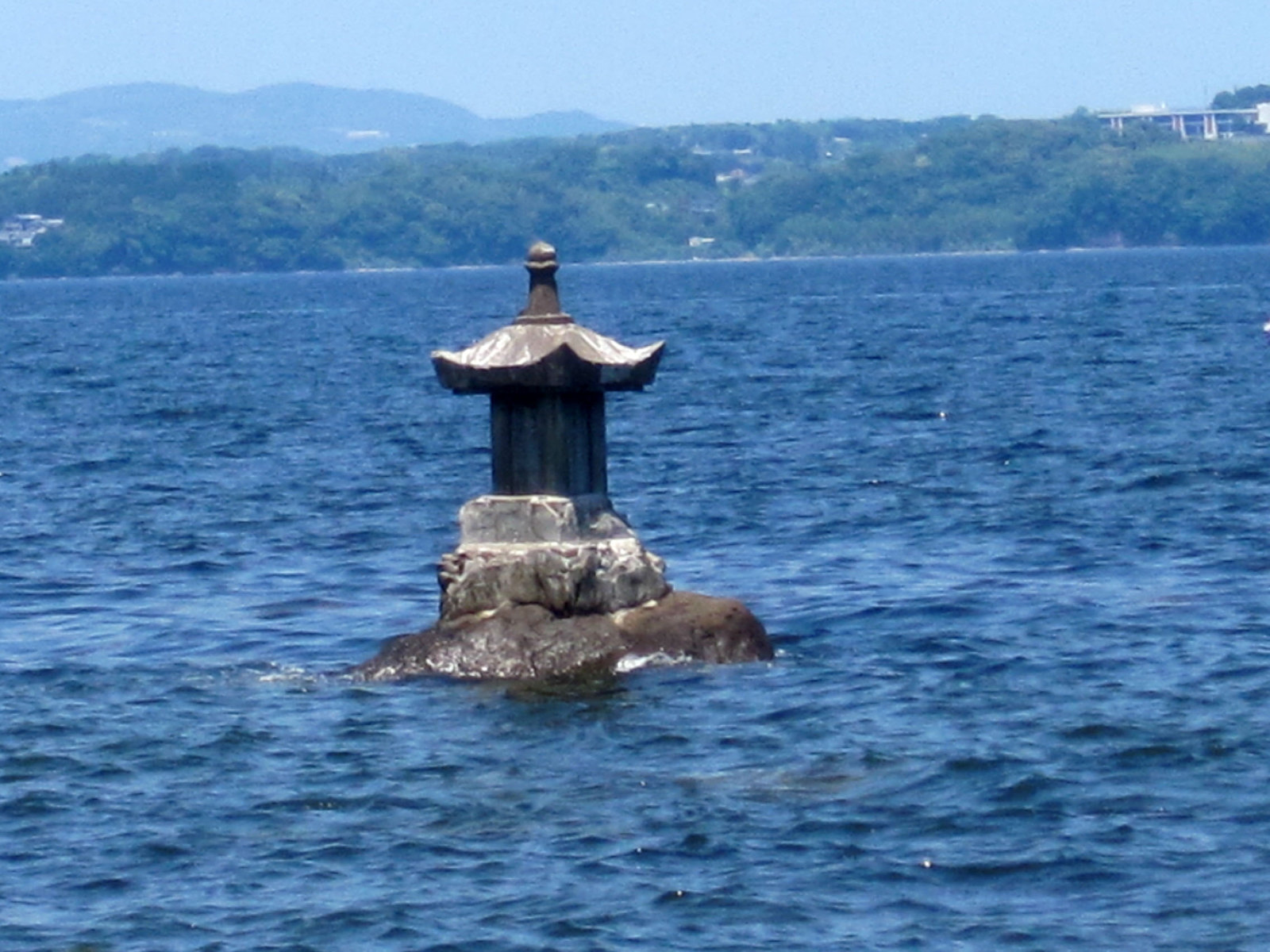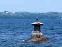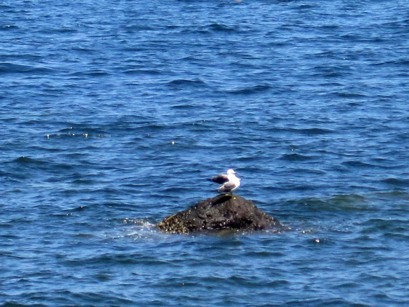 隣の岩にはカモメが二羽・・・お堂の屋根にも・・・ウミウ??