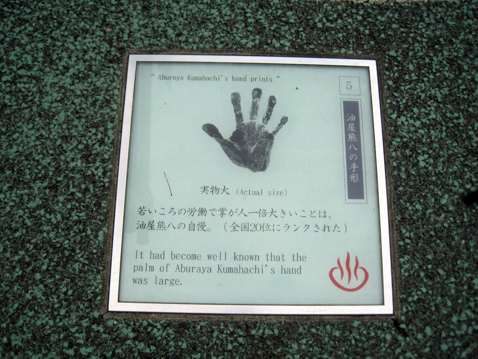 【油屋 熊八(あぶらや くまはち、1863年(文久3年)7月16日 - 1935年(昭和10年)3月24日)は、歓楽的な温泉都市大分県別府市の観光開発に尽力し、田園的な温泉保養地由布院の礎を築いた実業家。いまでこそ観光地の売出しや開発には、公費の支出が当たり前な現代とは違い、別府温泉の宣伝はすべて熊八個人の私財と借財でまかなわれていた。その為熊八没後、亀の井自動車や旅館は借金の返済の為売り払われたが、その行動力と独創力に敬意をこめ別府観光の父・別府の恩人として慕われている。現在、別府市民らで「油屋熊八翁を偲ぶ会」が作られている。2007年11月1日には、その偉業を称えて大分みらい信用金庫(本社・別府市)の依頼により、別府駅前にブロンズ像が建てられた。そのブロンズ像は片足で両手を挙げ、熊八がまとうマントには小鬼が取りついている。これは、制作した彫刻家・辻畑隆子によると、天国から舞い降りた熊八が「やあ!」と呼びかけているイメージとのこと。[3]墓は故郷の宇和島市の光国寺にある。】です。