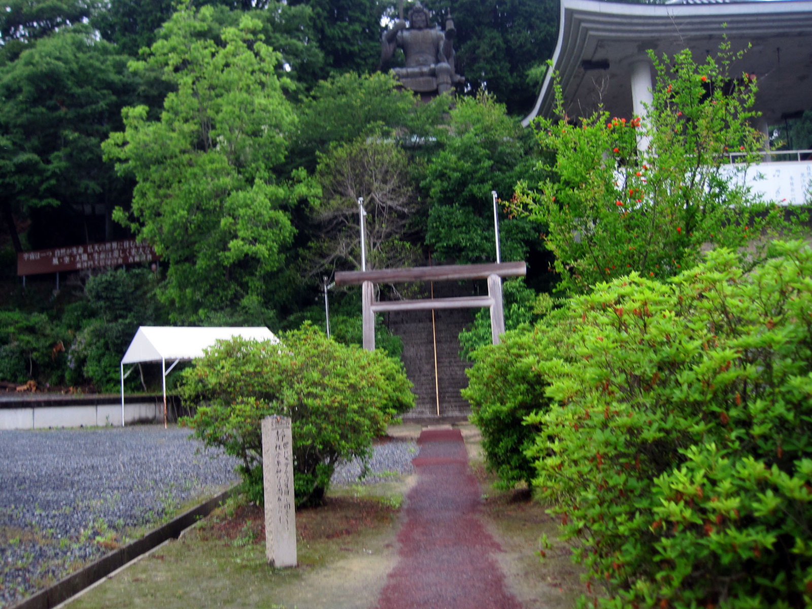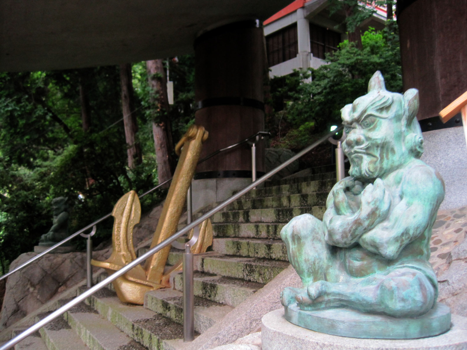 この真正面の巨大毘沙門天は【巨大 毘沙門天は、参道101の石段中程の、楼門 (七福宝船門)上に乗っている。その下に船の大きな碇がある。また「怒り」鎮めるということも兼ねている。毘沙門天王は、左の手に