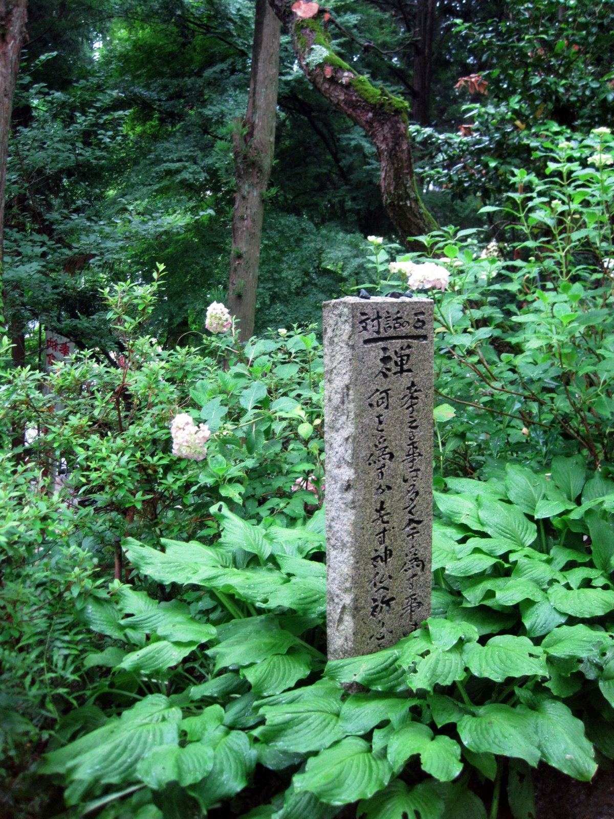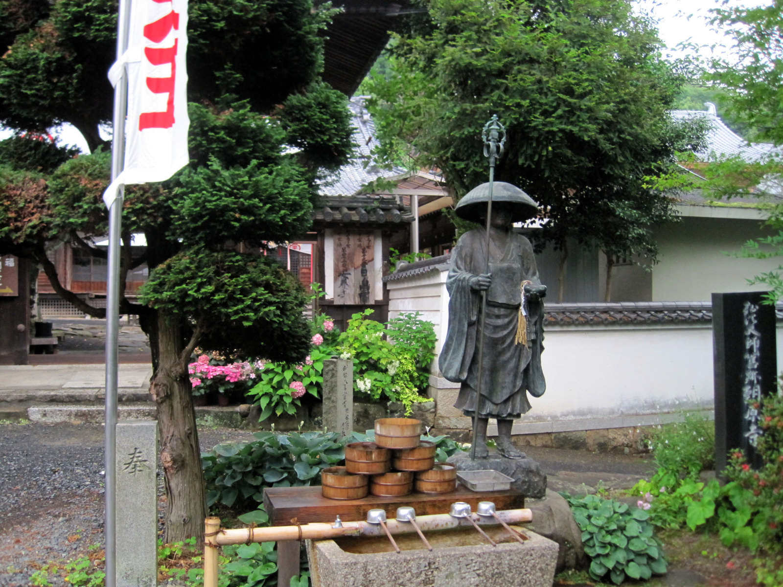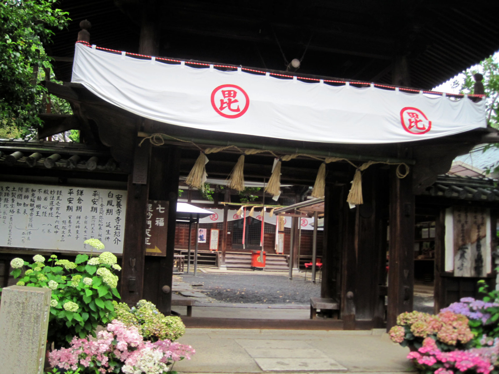 山門の所には,いくつもの紫陽花が,活けられていました。
