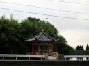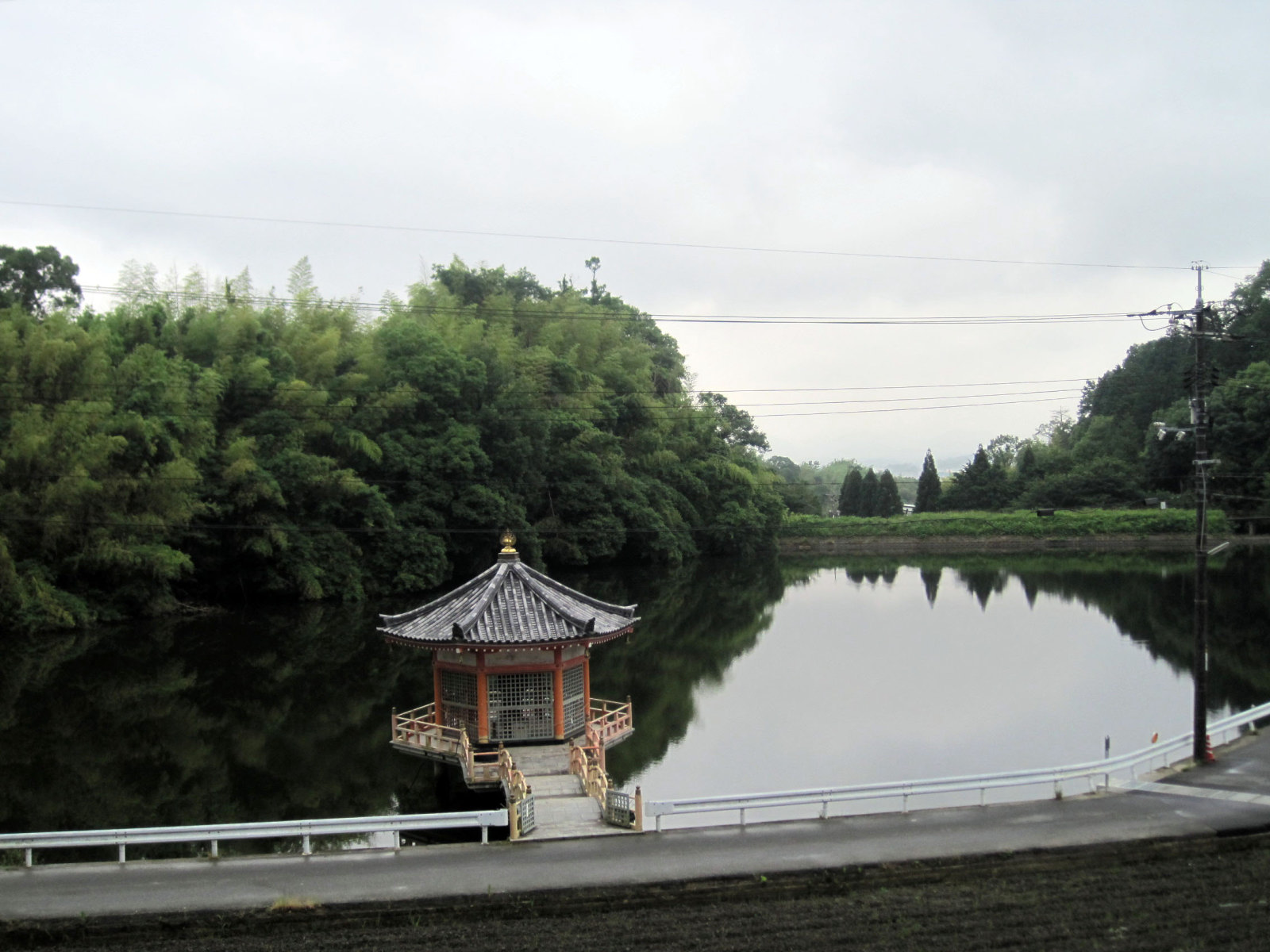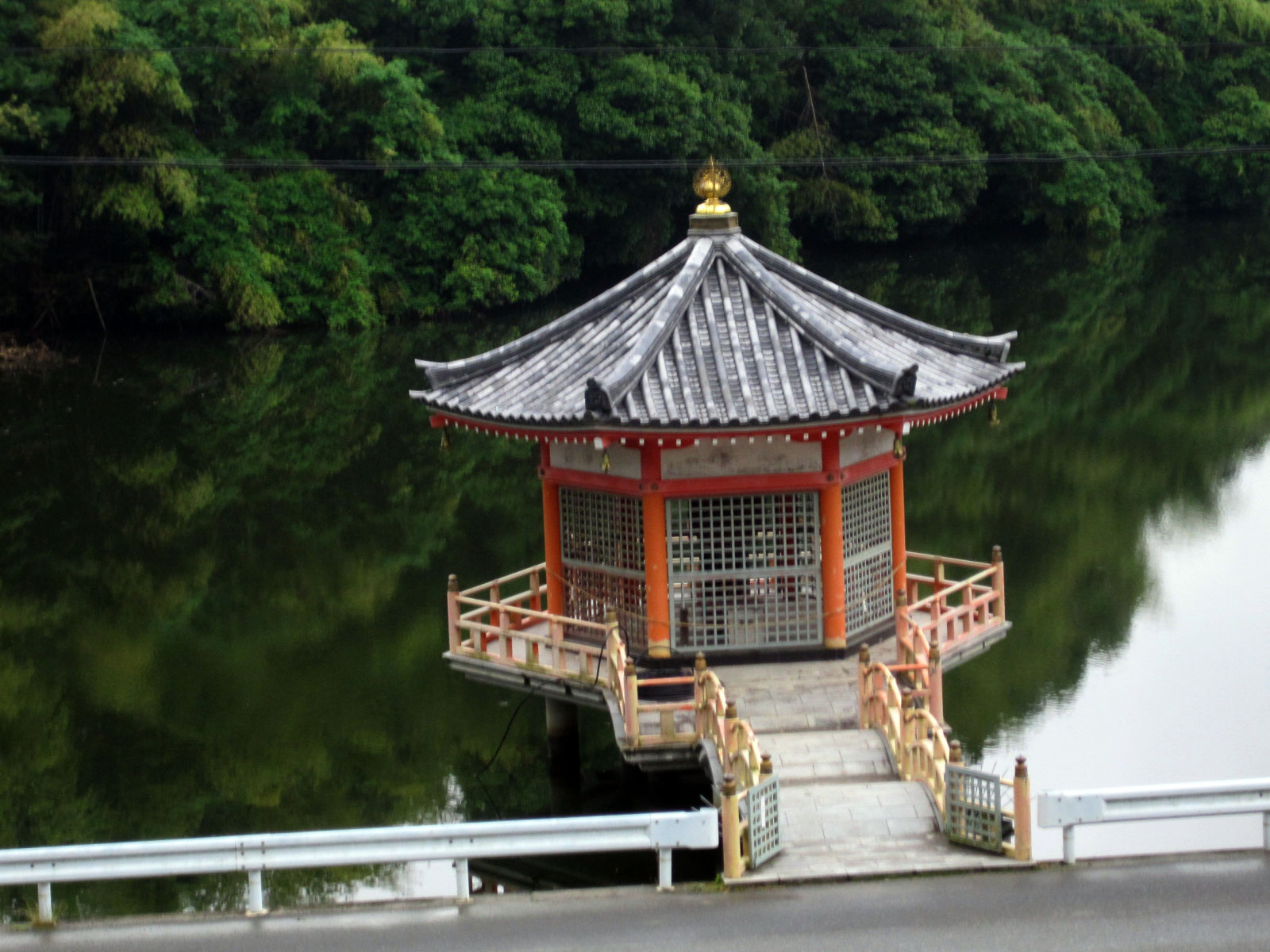 【天王池に浮かぶ朱色の浮見堂。龍頭観世音菩薩が祀られている】です。