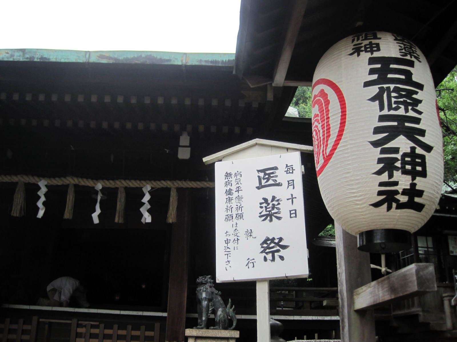 【第十二代景行天皇の御代、日本武尊(やまとたけるのみこと)が東夷征伐の為、上野忍が岡をお通りになられた時、薬祖神(上記の二柱)の大神に御加護を頂いた事を感謝なされて、この地に両神をおまつりなされました(約1890年前)。『尭恵法師の北国紀行より・・・正月の末 武蔵野のさかい忍ヶ岡を優遊しはべり鎮座の社五條天神と申しはべり、折ふし枯れたる茅原を焼きはべり契りをきて誰かは春の初草に 忍ヶ岡の露の下萌え』云々とあり、この正月は文明十八年(約五百年前)ですので、相当の古社であることがわかります。相殿におまつりしてあります菅原道真公は、寛永十八年(約三百五十年前)に合祀され、歌の道の祖神として俗称下谷天満宮とも云われました。社地は御創祀以来、天神山(今の摺鉢山)瀬川屋敷(アメヤ横丁入口)他、幾度か変遷を重ね、昭和三年九月に御創祀の地に最も近い現地(花園稲荷神社隣り)に御遷座になりました。尚、日本橋本町にある薬事協会ビルの屋上には、薬祖神社として御分霊をおまつりし、毎年十月十七日に薬業関係者により盛大なお祭りが行われています。】だそうです。