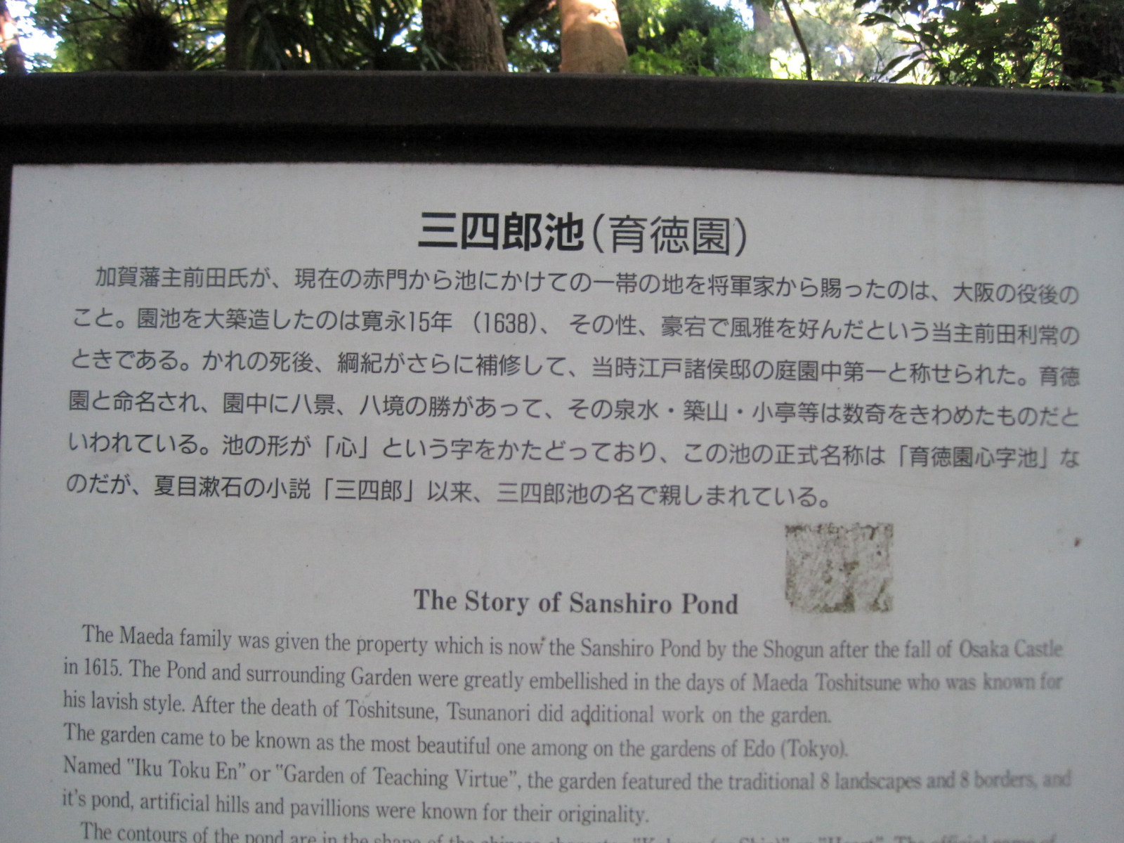 【元和元年(1615)の大坂夏の陣の後、加賀藩前田家が幕府から現在の東京大学の敷地を賜った。寛永3年(1626)前田家3代利常の時に、徳川3代将軍家光訪問の内命を受け、殿舎、庭園の造園にかかり完成までに3年を要した。外様大名として誠意を示す必要があったためである。このとき完成した庭園が育徳園と呼ばれ、池を心字池といった。夏目漱石の名作『三四郎』は、ここを舞台としたため、「三四郎池」と呼ばれるようになった。】です。