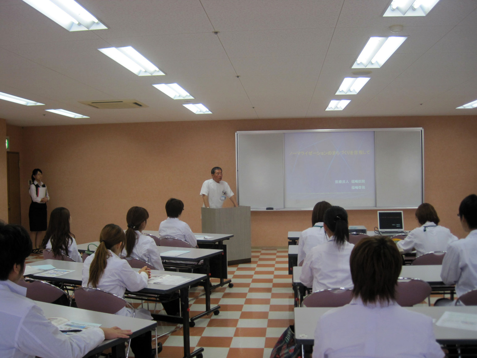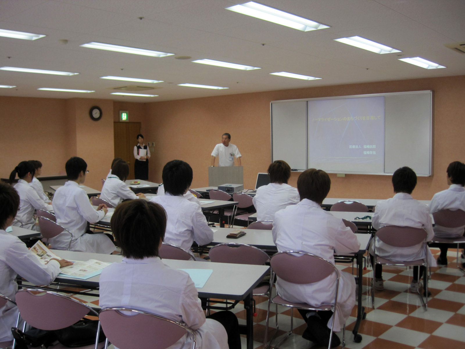最初は,福嶋理事長による講演を聞かせていただきます。医療と介護,さらには看護やリハビリテーションなどの現場の話や苦労話,あるいは国の制度についての苦言等々,中身の濃い,よいお話です!
