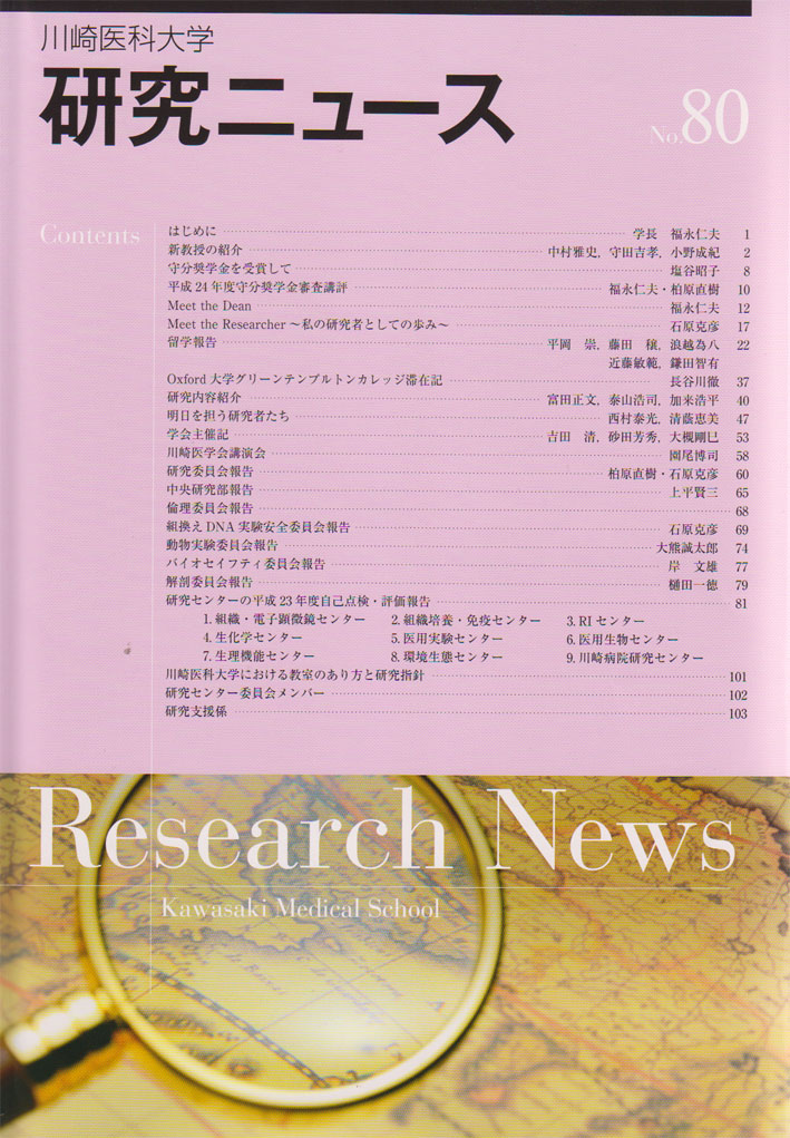 2012.11.14. 川崎医科大学 研究ニュース No.80が届きました。 衛生学教室関連としては,西村准教授が「明日の担う研究者たち」の#1 として,執筆された記事が掲載されています。 以下クリックでPDFを読んでいただけます。 また,大槻は,2012年1月27-28日に主催した第11回分子予防環境医学研究会の様子を報告しました。 以下クリックでPDFを読んでいただけます。 みんな,頑張って研究しましょう!!!!!!!!