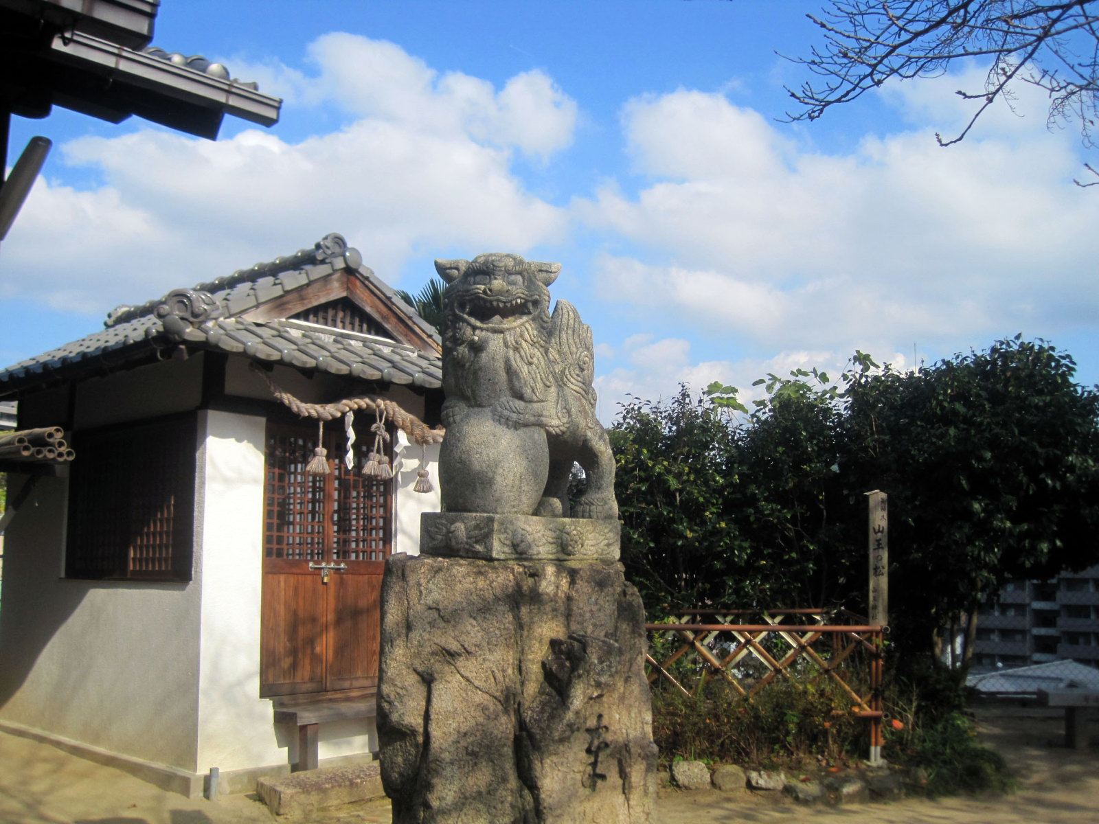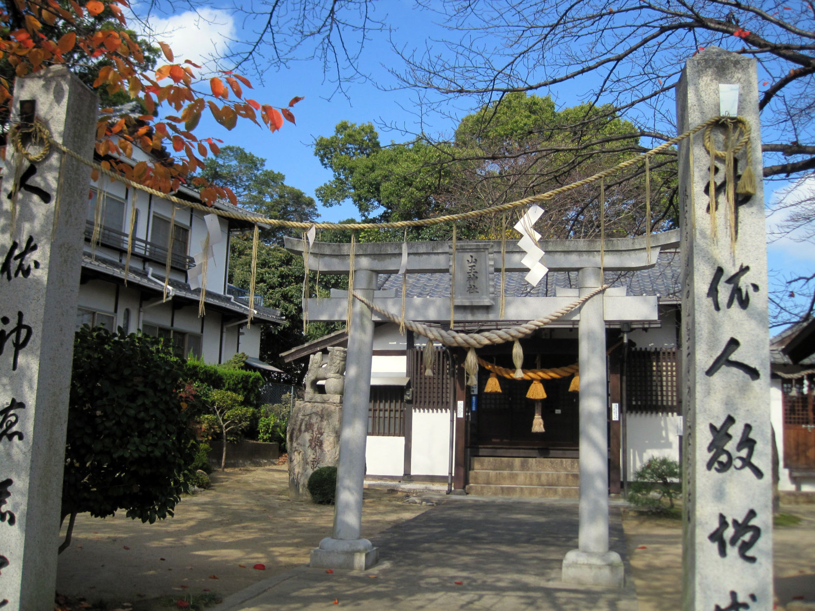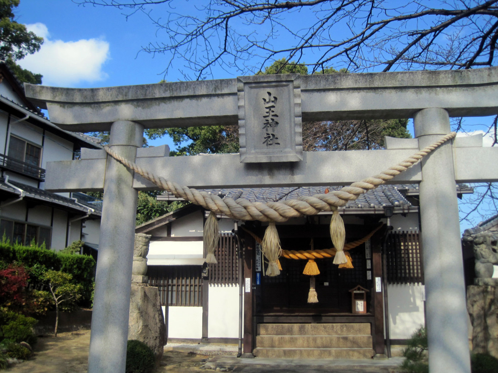【⼭王神社は、正保3(1646)年現在地⻄南寄の旧社地に天狗松と称す⼤⽊があり注連を引き廻して祭神の猿⽥彦⼤神を奉斎したのが始まりである。この祭神は道案内の神と⾔われ、その⼤⽊は落雷により焼失し類焼を免れたので⼩祠を建⽴し、⽕の神として猿⽥彦⼤神の霊を励請し旧段原⼀帯の住⺠より崇敬される。慶応年間中半に⼩祠を⼩社に、⼜明治7(1874)年には社殿に改築し、更に明治40(1907)年現在地に社殿を新築して遷座祭を執⾏する。昭和20(1945)年8⽉の原爆により社殿は、多⼤の破損を蒙り、昭和28年地元の宗敬者達の協⼒により屋根及弊殿の修理を⾏い、更に昭和43(1968)年には明治百年記念事業として根本的改築を⾏い現在に⾄る。従来、⽐治⼭神社の摂社となっていたが、昭和28年宗教法⼈⼭王神社として独⽴法⼈を設⽴する。平成14(2002)年には、⼭王神社が奥州藤原家の縁の神社である福島県の光照⼭王神社の発祥本宮である事が古⽂書により判明し⼀段と注⽬される事となる。】との由緒です。