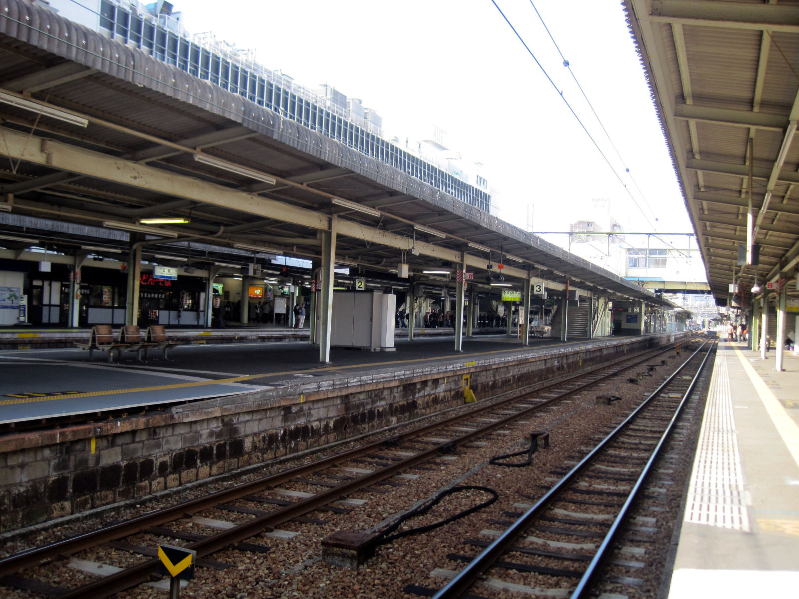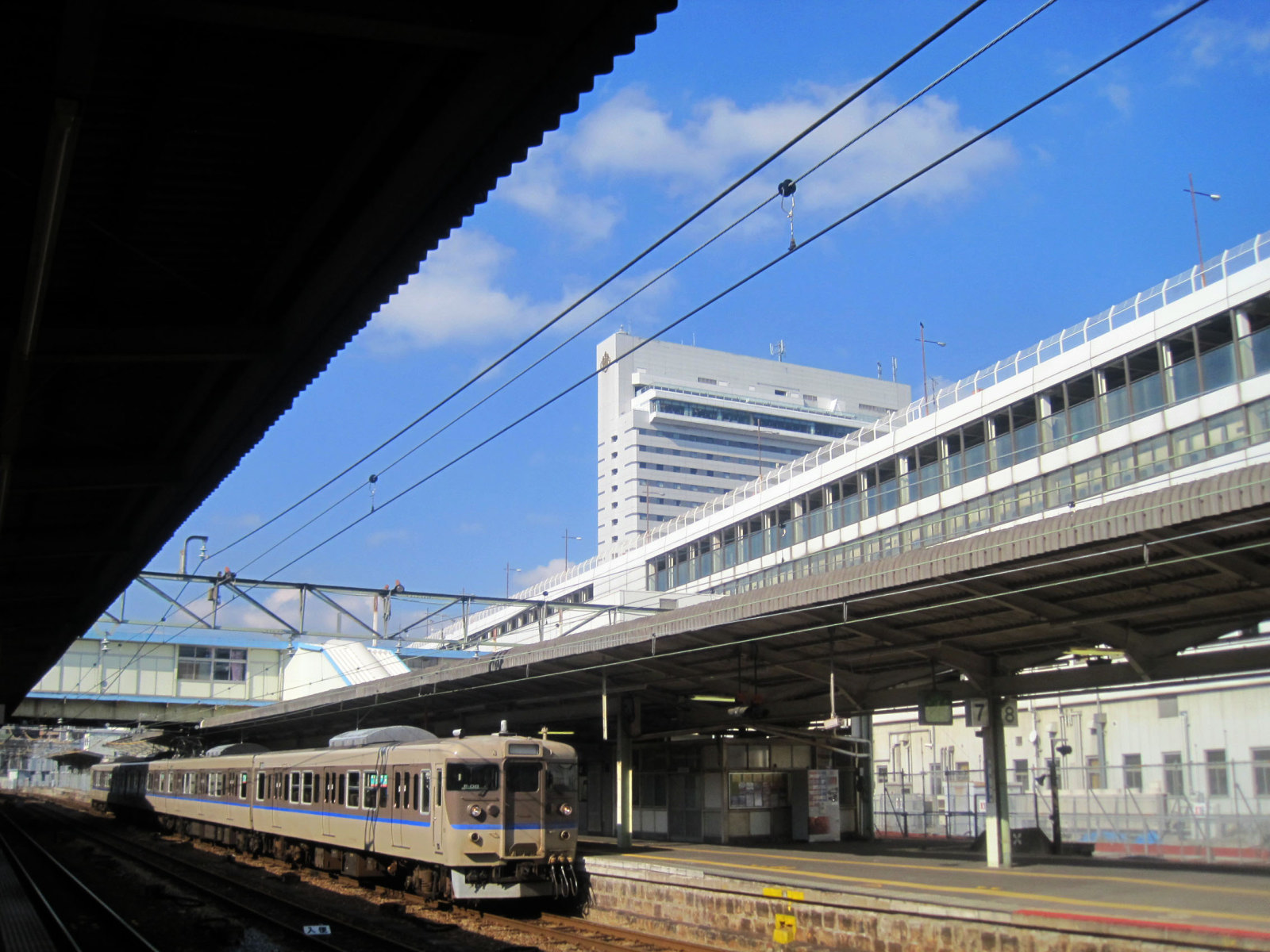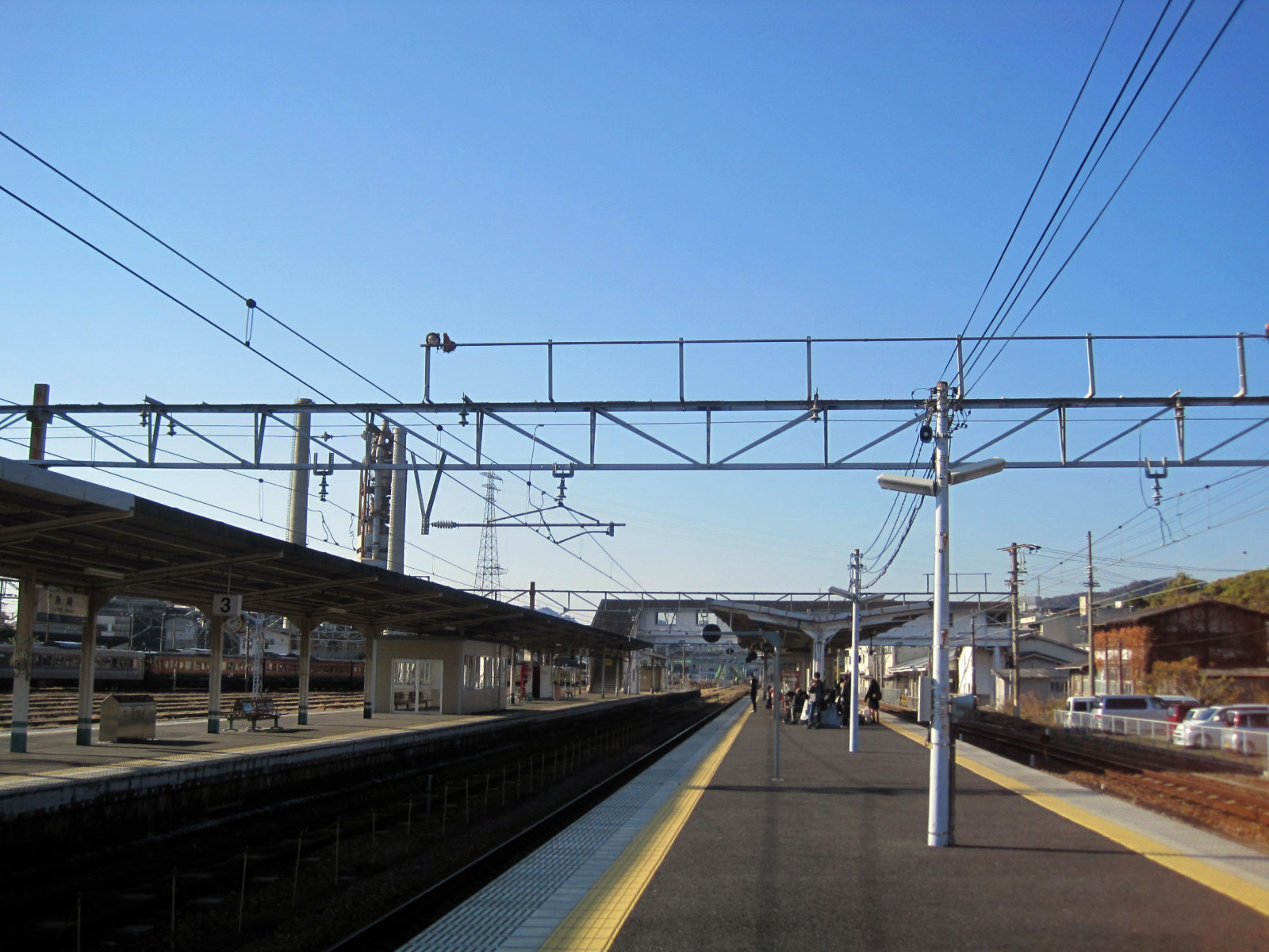 糸崎駅で乗り換え・・・糸崎駅は【この間に岡山支社と広島支社の境界標あり(当駅から尾道寄りは岡山支社管内),2面4線の島式ホームを持つ地上駅。駅舎とホームは跨線橋で結ばれている。かつては下りホームにそば屋があり、名物の天ぷらうどんを停車中の電車の車窓から買うことができた。そば屋はすでに解体されたが、その跡には休憩室が設置されている。旅客線路は2-5番線であるが、ホーム案内上では1-4番線として扱われる。3番線(2番線)が上り本線、5番線(4番線)が下り本線となっている。旅客線路の両側にある、ホームの無い1番線・6番線は貨物用(6番線から三原始発の電車の回送も発車する)で上りは所定で停車する貨物列車がある。駅の南には留置線が多数あり、糸崎乗務員センターの建屋もある。夜間滞泊の設定駅でもある。】ということで・・・線路が一杯!また客車なども沢山止まっています! そうか,ここで,岡山支社と広島支社に分かれるのね!