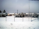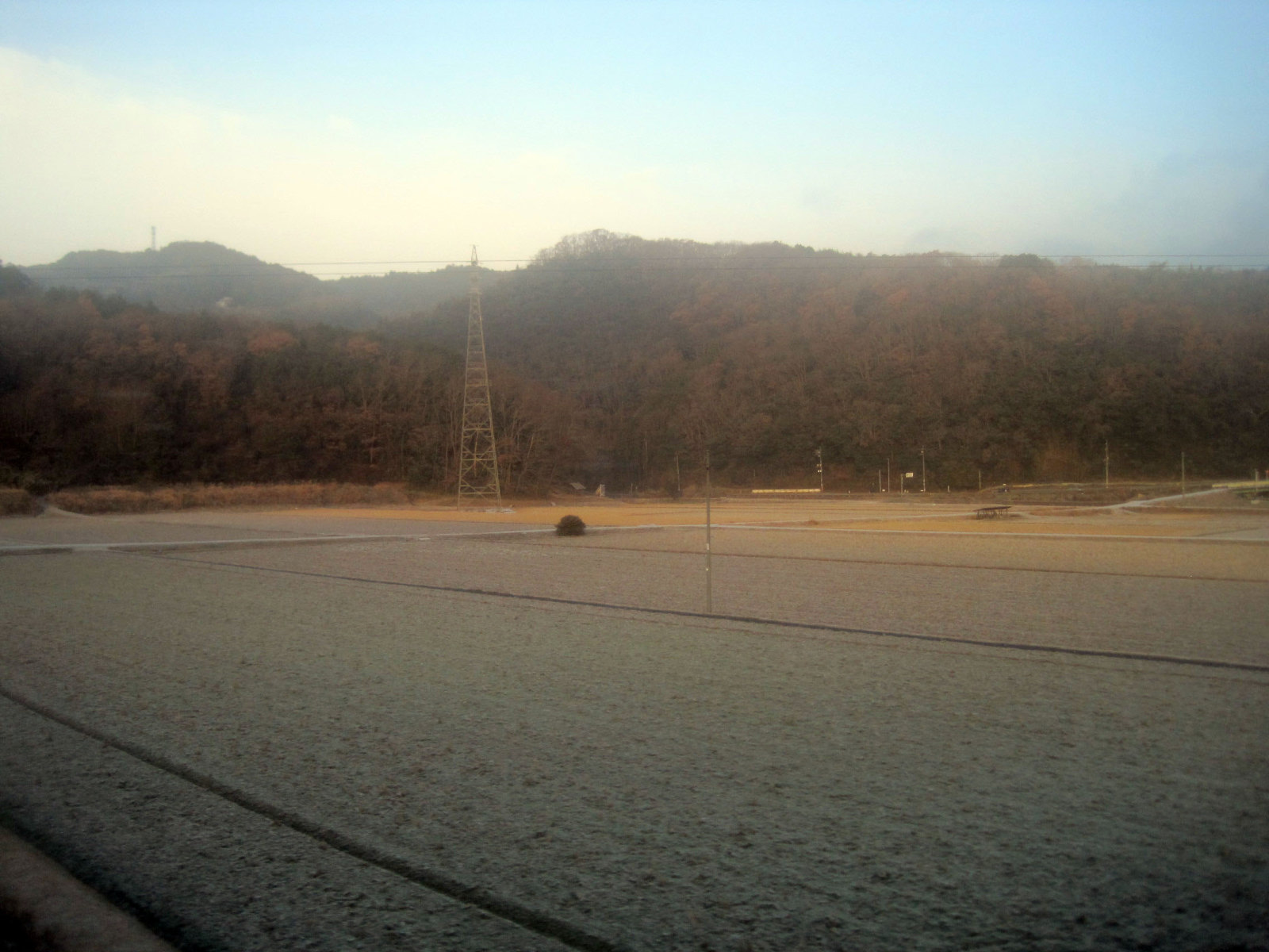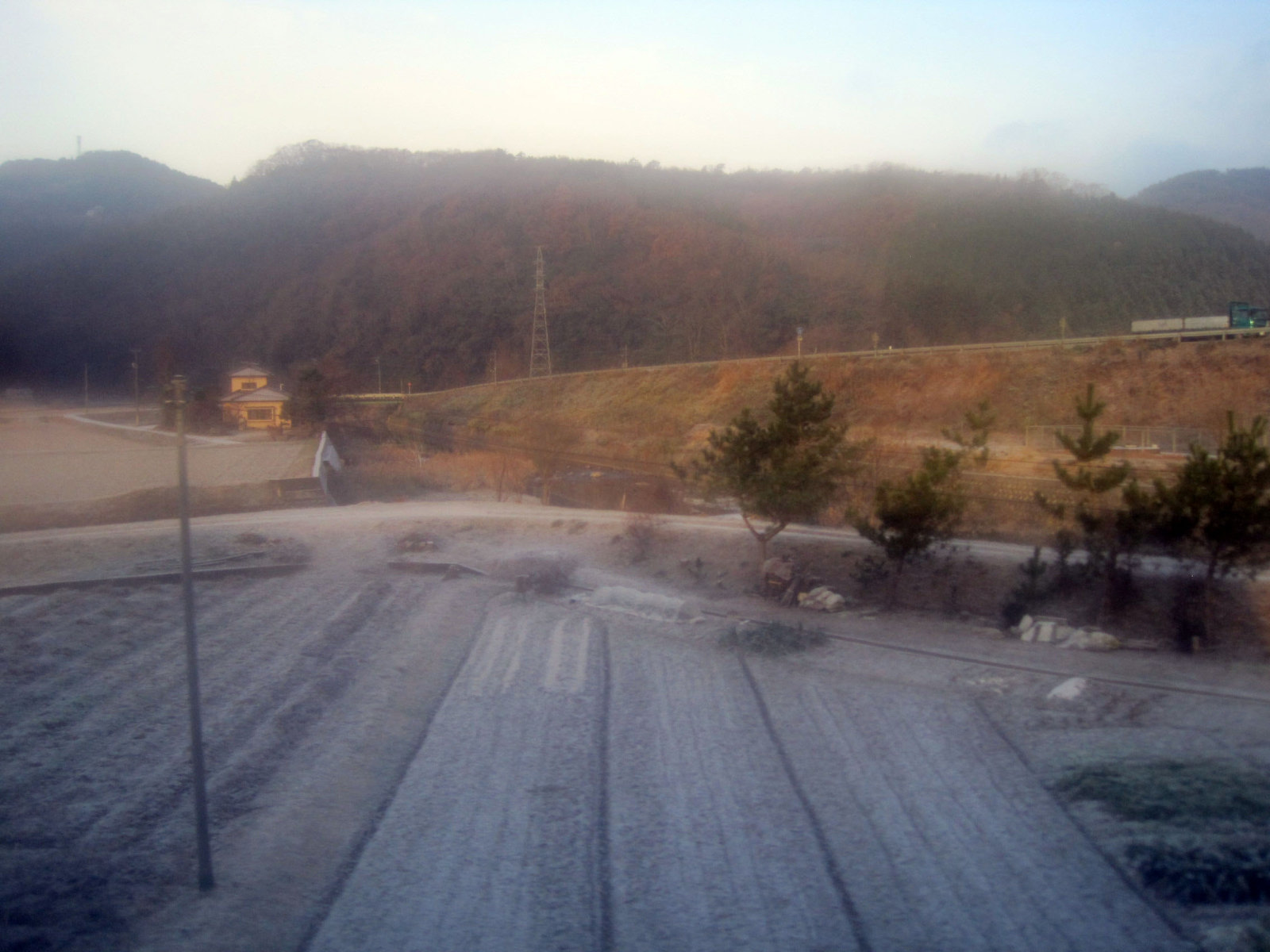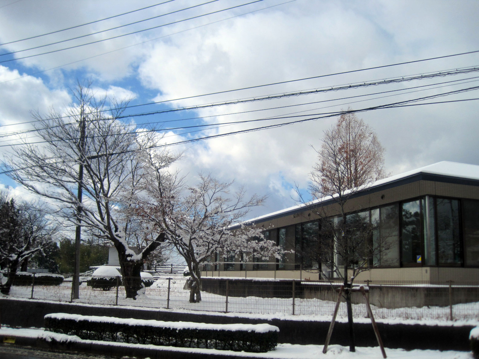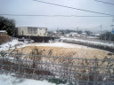 久米南中学のグランドも真っ白! この辺りでは,もう電車の中は,それでも満員だったので,外気との温度差で曇りまくり・・ぼやけだ画像になっちゃいます。