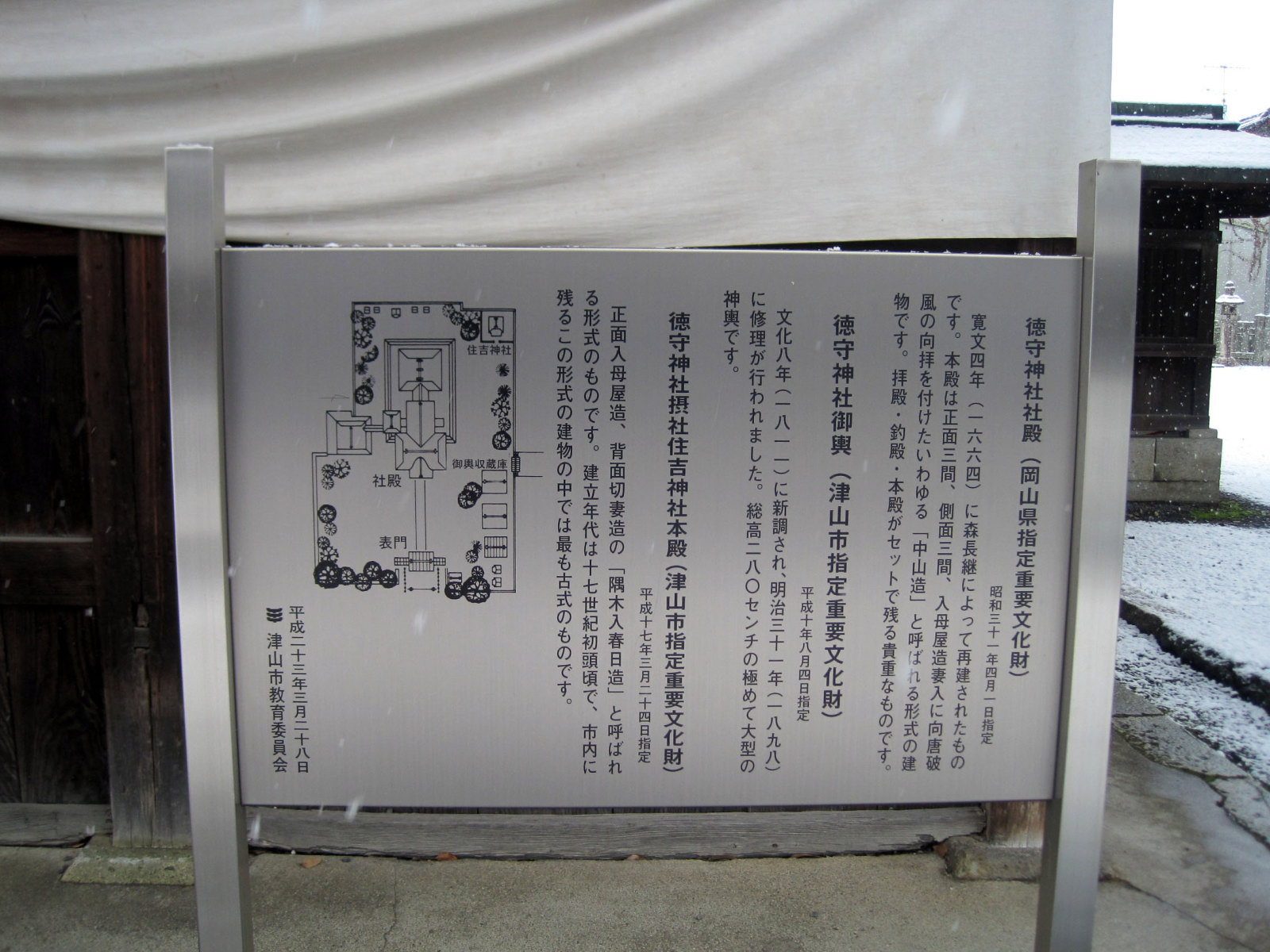 【当神社は聖武天皇の御代天平5年(733)の創祀と伝えられている。社地は当初現在の津山市小田中の地にあったが。天文8年(1539)火災に遭い社殿 宝物等悉く焼失した。慶長8年(1603)美作の国18万6500石の国守大名として入封した森忠政(森蘭丸の弟)が津山城を築くにあたり現在地に移して津山城下の総鎮守とした。現在の社殿は寛文4年(1664),2代藩主森長継公が改築したもので明治5年に県社に列せられ,その後昭和31年に県指定の重要文化財に指定された】だそうです。
