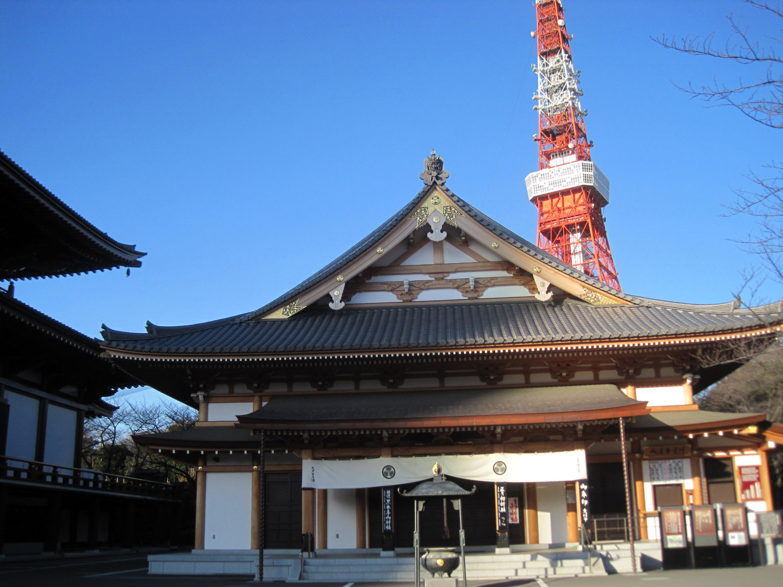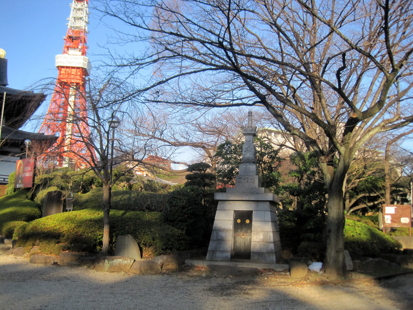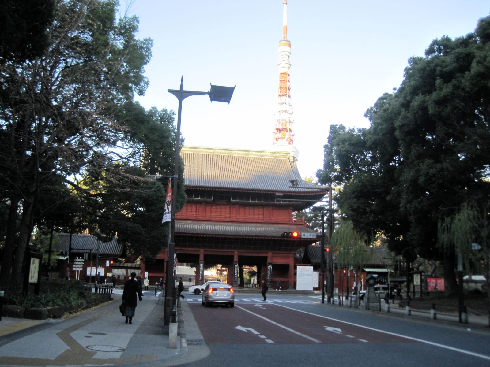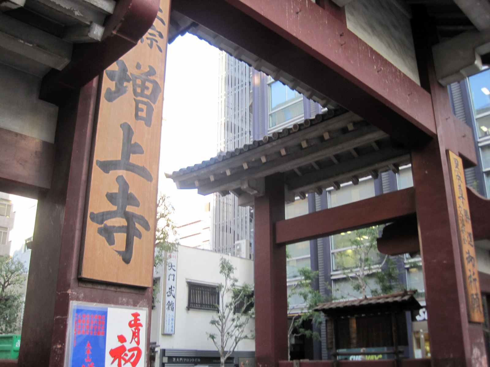 増上寺【空海の弟子・宗叡が武蔵国貝塚(今の千代田区麹町・紀尾井町あたり)に建立した光明寺が増上寺の前身だという。その後、室町時代の明徳4年(1393年)、酉誉聖聡(ゆうよしょうそう)の時、真言宗から浄土宗に改宗した。この聖聡が、実質上の開基といえる。中世以降、徳川家の菩提寺となるまでの歴史は必ずしも明らかでないが、通説では天正18年(1590年)、徳川家康が江戸入府の折、たまたま増上寺の前を通りかかり、源誉存応上人と対面したのが菩提寺となるきっかけだったという。貝塚から、一時日比谷へ移った増上寺は、江戸城の拡張に伴い、慶長3年(1598年)、家康によって現在地の芝へ移された。風水学的には、寛永寺を江戸の鬼門である上野に配し、裏鬼門の芝の抑えに増上寺を移したものと考えられる。また、徳川家の菩提寺であるとともに、檀林(学問所及び養成所)がおかれ、関東十八檀林の筆頭となった。なお、延宝8年(1680年)6月24日に行われた将軍徳川家綱の法要の際、奉行の一人で志摩国鳥羽藩主内藤忠勝が、同じ奉行の一人で丹後国宮津藩主永井尚長に斬りつけるという刃傷事件を起こしている(芝増上寺の刃傷事件)。なお水戸黄門第17部においては、この一件が水戸光圀の旅立ちのきっかけとして描かれている。また元禄14年(1701年)3月に江戸下向した勅使が増上寺を参詣するのをめぐって畳替えをしなければならないところ、高家の吉良義央が勅使饗応役の浅野長矩に畳替えの必要性を教えず、これが3月14日の殿中刃傷の引き金になったという逸話が『忠臣蔵』で有名である。なお、長矩は内藤忠勝の甥である。明治時代には半官半民の神仏共同教導職養成機関である大教院の本部となり大教院神殿が置かれた。のち明治7年(1874年)1月1日排仏主義者により放火される。徳川幕府の崩壊、明治維新後の神仏分離の影響により規模は縮小し、境内の広範囲が芝公園となる。太平洋戦争中の空襲によって徳川家霊廟、五重塔をはじめとした遺構を失う大きな被害を受けた。東京タワーの建設時、増上寺は墓地の一部を土地として提供している。なお、この付近の町名(芝大門)や地下鉄の駅名(大門駅)に使われている「大門」(だいもん)は、増上寺の総門のことを指す。現在の総門は昭和12年に作られた、コンクリート造のものである。】ということです。
