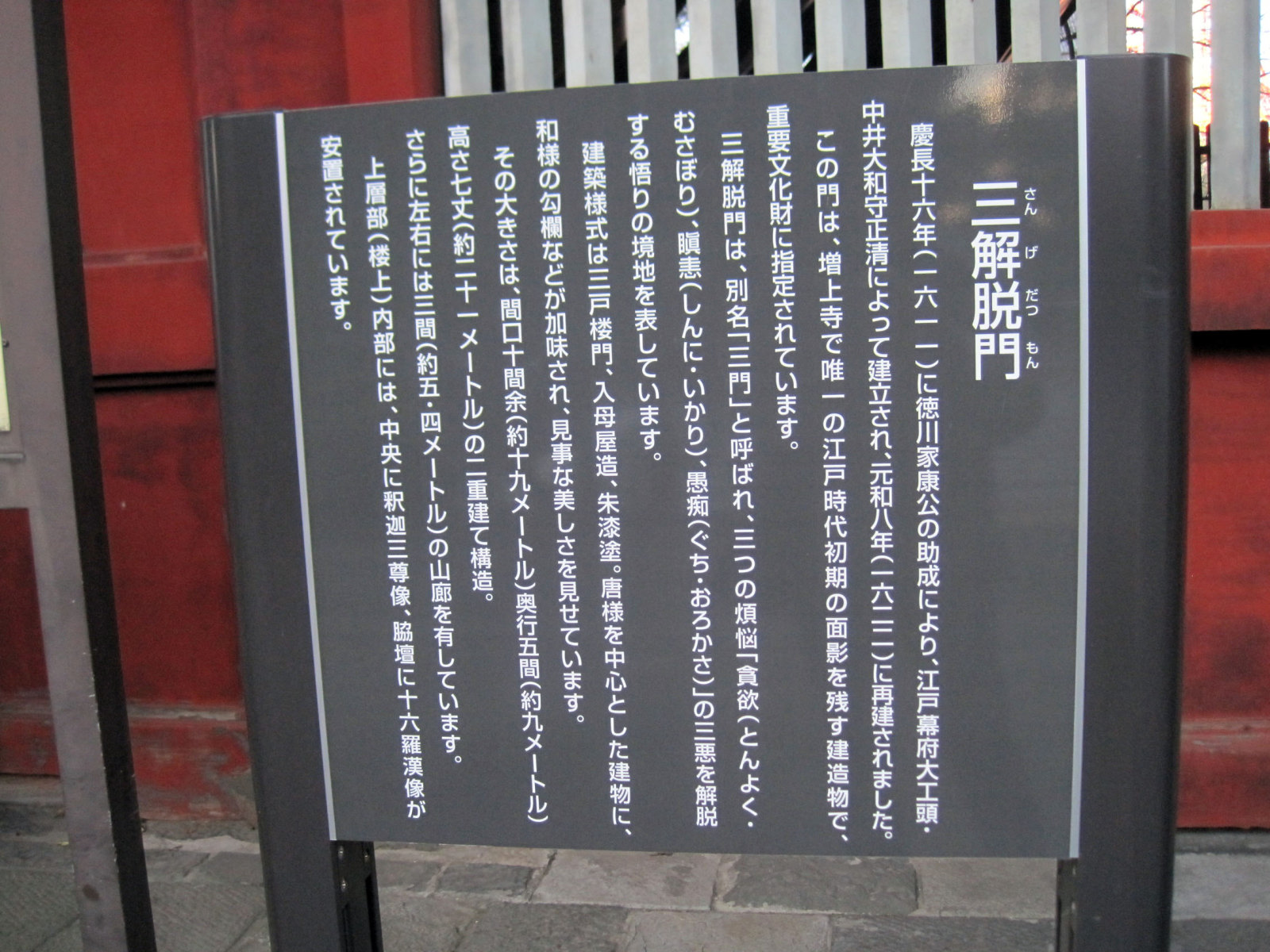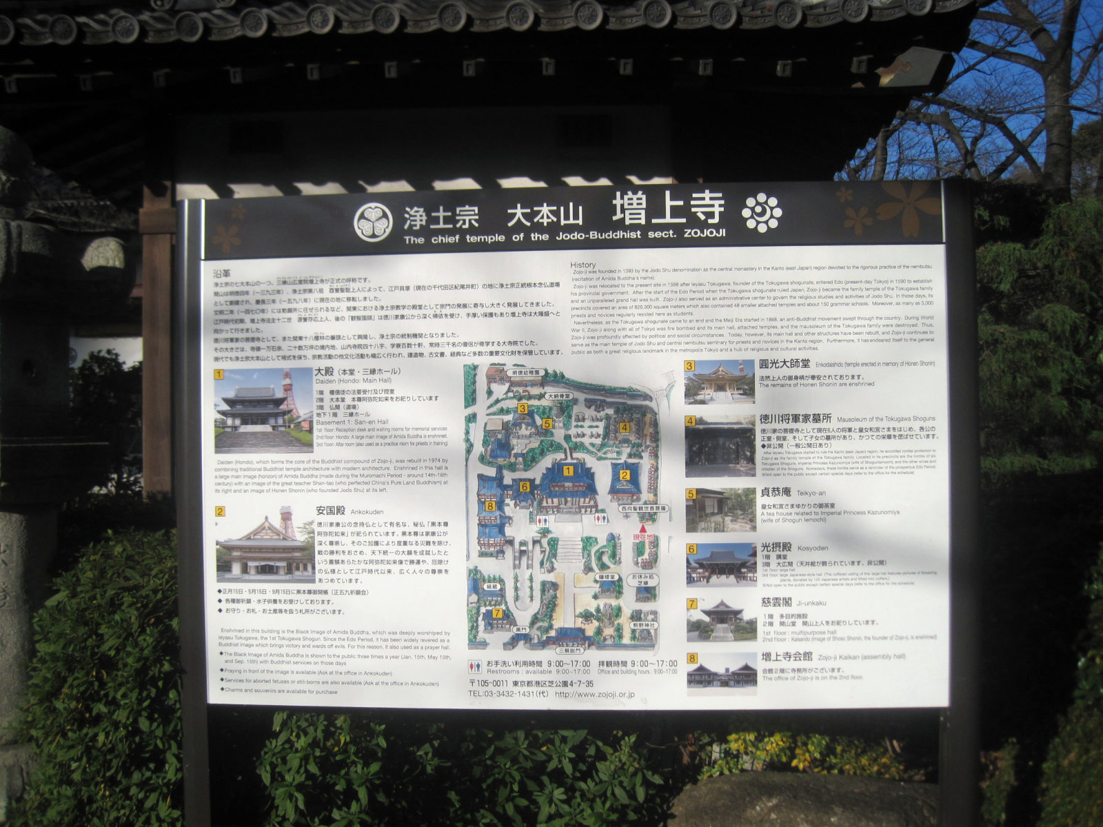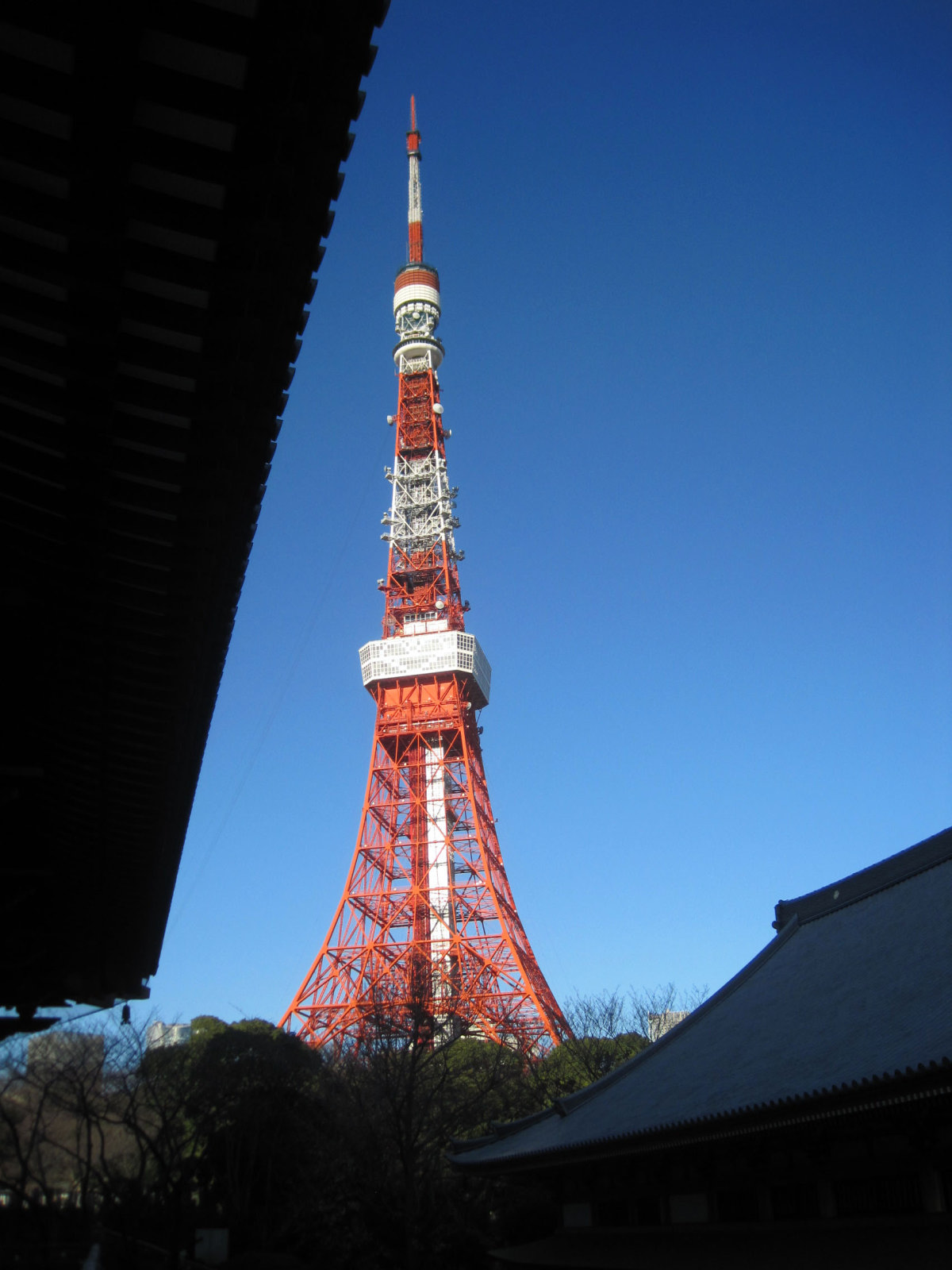 増上寺【空海の弟子・宗叡が武蔵国貝塚(今の千代田区麹町・紀尾井町あたり)に建立した光明寺が増上寺の前身だという。その後、室町時代の明徳4年(1393年)、酉誉聖聡(ゆうよしょうそう)の時、真言宗から浄土宗に改宗した。この聖聡が、実質上の開基といえる。中世以降、徳川家の菩提寺となるまでの歴史は必ずしも明らかでないが、通説では天正18年(1590年)、徳川家康が江戸入府の折、たまたま増上寺の前を通りかかり、源誉存応上人と対面したのが菩提寺となるきっかけだったという。貝塚から、一時日比谷へ移った増上寺は、江戸城の拡張に伴い、慶長3年(1598年)、家康によって現在地の芝へ移された。風水学的には、寛永寺を江戸の鬼門である上野に配し、裏鬼門の芝の抑えに増上寺を移したものと考えられる。また、徳川家の菩提寺であるとともに、檀林(学問所及び養成所)がおかれ、関東十八檀林の筆頭となった。なお、延宝8年(1680年)6月24日に行われた将軍徳川家綱の法要の際、奉行の一人で志摩国鳥羽藩主内藤忠勝が、同じ奉行の一人で丹後国宮津藩主永井尚長に斬りつけるという刃傷事件を起こしている(芝増上寺の刃傷事件)。なお水戸黄門第17部においては、この一件が水戸光圀の旅立ちのきっかけとして描かれている。また元禄14年(1701年)3月に江戸下向した勅使が増上寺を参詣するのをめぐって畳替えをしなければならないところ、高家の吉良義央が勅使饗応役の浅野長矩に畳替えの必要性を教えず、これが3月14日の殿中刃傷の引き金になったという逸話が『忠臣蔵』で有名である。なお、長矩は内藤忠勝の甥である。明治時代には半官半民の神仏共同教導職養成機関である大教院の本部となり大教院神殿が置かれた。のち明治7年(1874年)1月1日排仏主義者により放火される。徳川幕府の崩壊、明治維新後の神仏分離の影響により規模は縮小し、境内の広範囲が芝公園となる。太平洋戦争中の空襲によって徳川家霊廟、五重塔をはじめとした遺構を失う大きな被害を受けた。東京タワーの建設時、増上寺は墓地の一部を土地として提供している。なお、この付近の町名(芝大門)や地下鉄の駅名(大門駅)に使われている「大門」(だいもん)は、増上寺の総門のことを指す。現在の総門は昭和12年に作られた、コンクリート造のものである。】ということです。