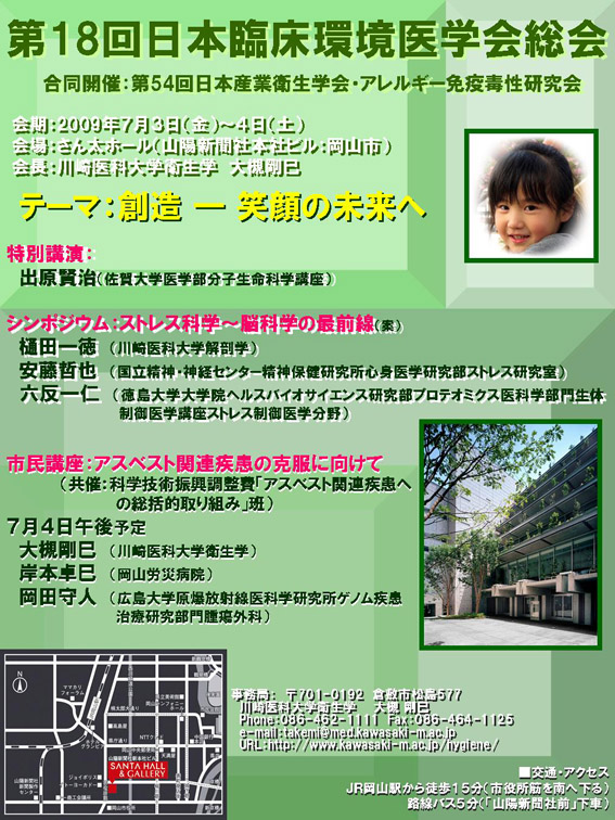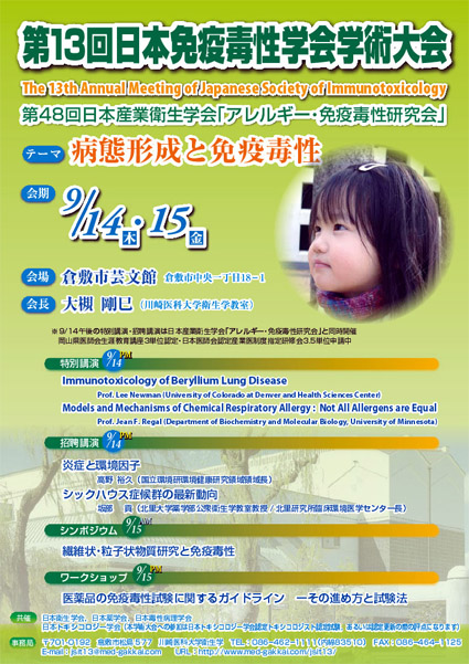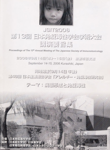| テーマそのままに子供の笑顔を載せましょう! って意図です。この顔は・・・・でも,実は,2006年9月に倉敷芸文館で催しました第13回日本免疫毒性学会学術大会のポスター(図2)と抄録集表紙(図3)でも観た顔ではないでしょうか? |