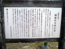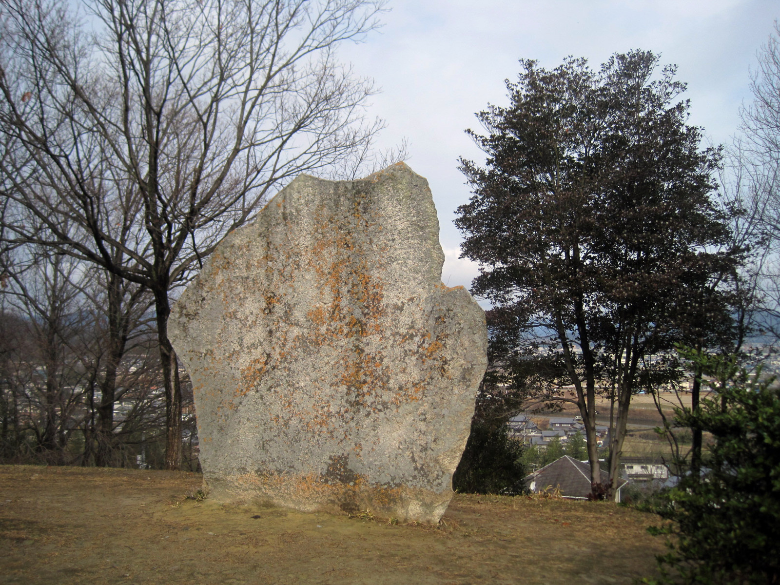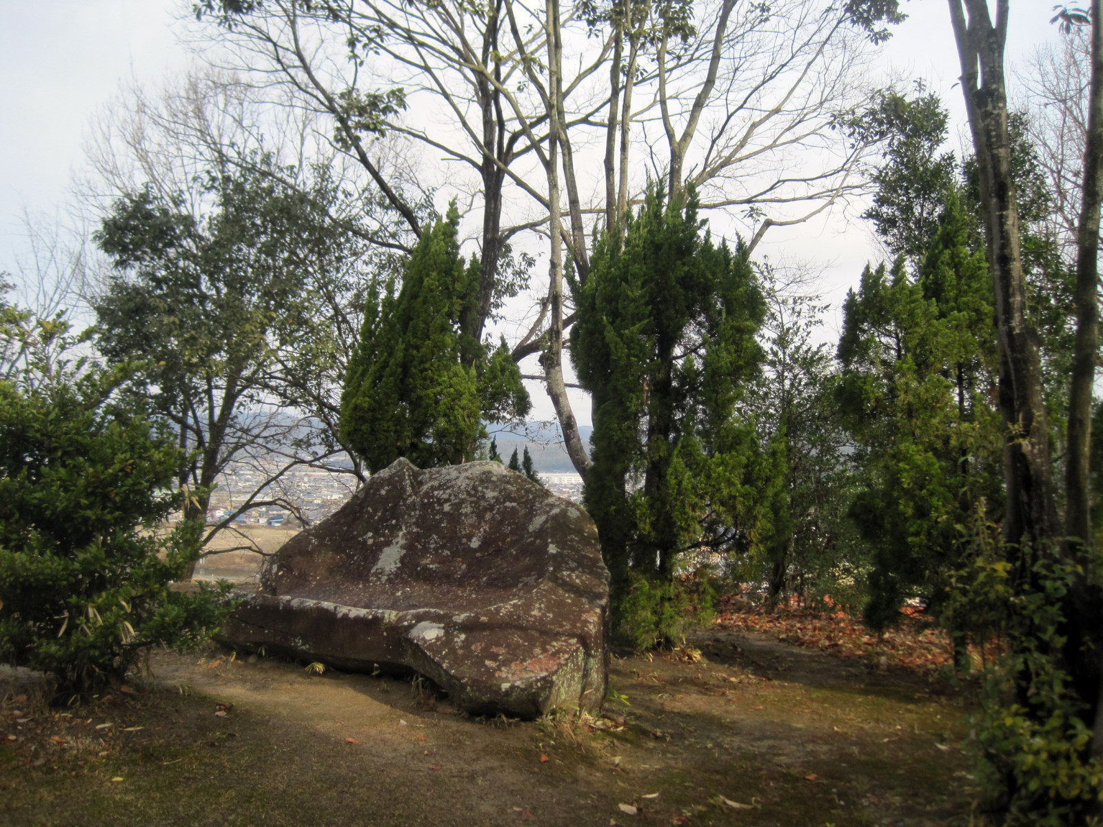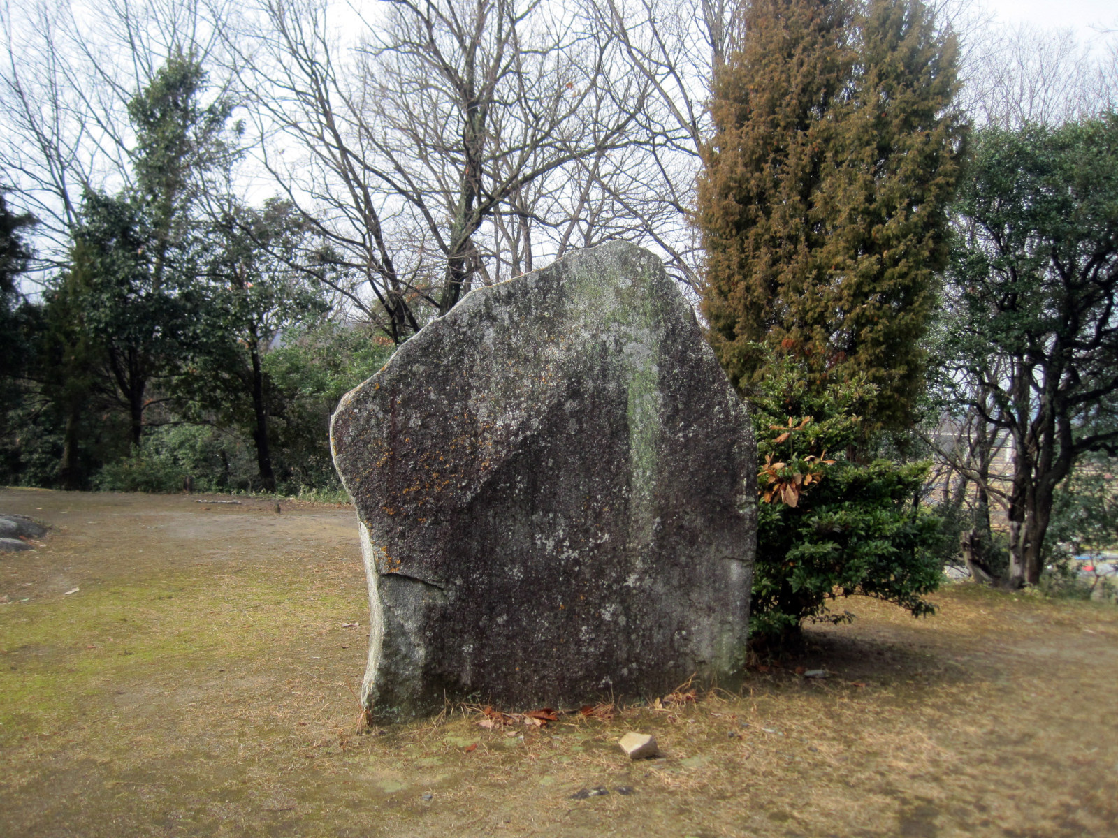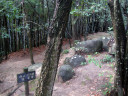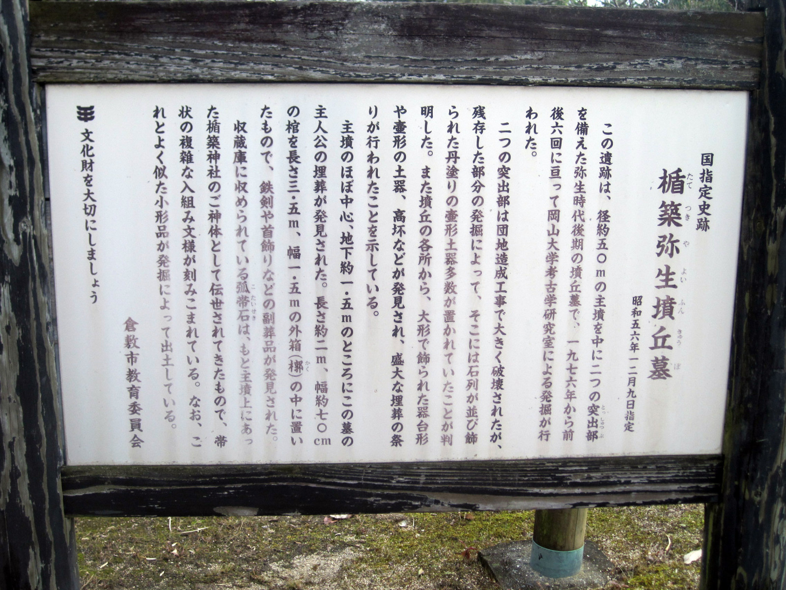 【国指定史跡 楯築弥生墳丘墓(たてつきやよいふんきゅうぼ) 昭和56年12月9日指定:楯築弥生墳丘墓は、径約50mの主墳を中に二つの突出部を備えた弥生時代後期の墓で、現存全長約72mの大きさをもつ。1976年から1986年まで前後6回に亘る発掘が岡山大学文学部考古学研究室を中心に行われた。二つの突出部は団地造成工事の犠牲となり、北東突出部は法面の、南西突出部は給水塔の工事で大きく破壊されたが、これまでの発掘によってそこには石列が並び、飾られた丹塗りの壷形土器多数が置かれていたことが判明した。いま主墳の頂には五個の巨石が、また斜面にも石列がみられる。これらには埋葬の霊域を守る役目をもつものであろうか。また墳頂や斜面の一部には拳大の円礫が置かれている。墳頂下に二つの埋葬が発見された。中心部の地下約1.5mのあたりに発見された埋葬は、この墳丘墓の主人公のもので、棺の長さ約2m、幅約70cm、棺底には厚く朱(30kg以上)が敷かれていた。骨はすべて腐って無くなっていたが、歯の小さなかけらが二つみつかった。副葬品は鉄剣一、首飾り二、多数の小管玉とガラス小玉の集り一である。この棺は外箱つまり槨(かく)の中に入れられていた。棺も槨も木製であったが、腐っていく過程で土と入れ替わった痕跡から構造の追及が行われた。槨の長さ3.5m、幅1.5m、底板は少なくとも二枚で、その下方には横木数本の痕がみられた。槨の南東には、溝を掘り石をつめた排水施設がつくられていた。また、埋葬の祭りに使われたさまざまな道具を壊して、円礫多数とともに埋葬箇所の上方に積みあげていたことも判明した。その中には、もと楯築神社伝世のご神体(収蔵庫にあり)とよく似た弧帯石(こたいせき)、人形土製品、大形華麗な特殊器台形土器、高坏、土製の勾玉・管玉などがある。もうひとつの埋葬は、中心埋葬の南東約9mで発見され、木棺の痕跡がみとめられたが、副葬品はなく、朱も微量にとどまった。1987年5月吉日:岡山大学教授 近藤義郎 記:倉敷市教育委員会(現地案内板より)