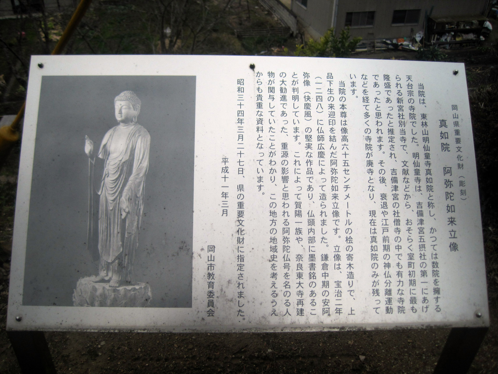 【当院は、東林山明仙童寺真如院と称し、かつては数院を擁する天台宗の寺院でした。明仙童寺は、吉備津宮五摂社の第一にあげられる新宮社別当寺で、文献などから、おそらく