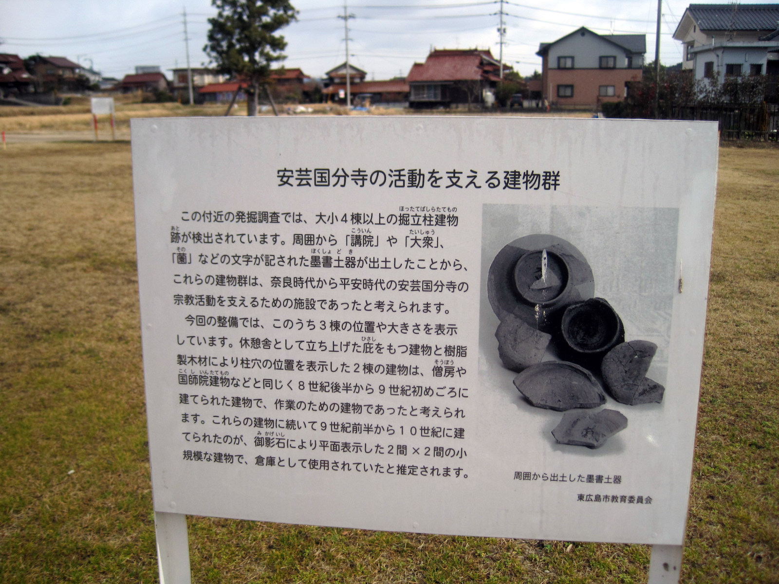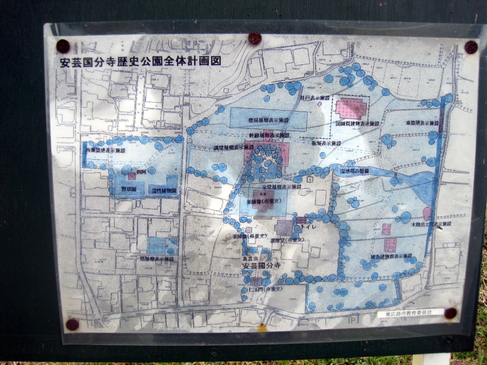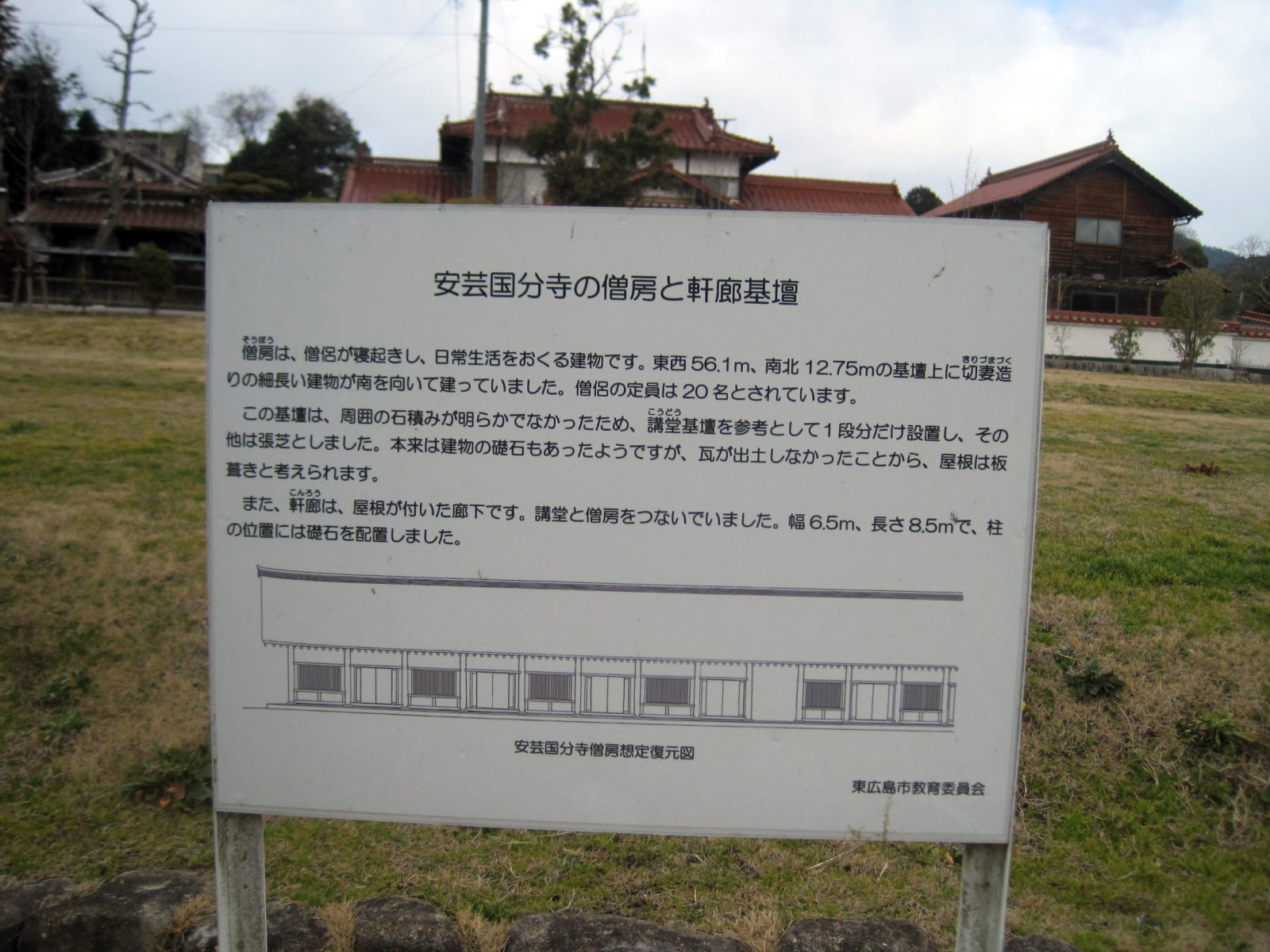 【国分寺は、奈良時代、聖武天皇によって全国に建立された寺院で、安芸国(現在の広島県の西部地域)では西条に建立されました。発掘調査によって安芸国分寺は天平勝宝2(750)年には主要な堂宇が建てられ、僧侶によって法会が行われていたことが明らかになりました。現在の真言宗國分寺を中心とした一帯は国史跡に指定されており、安芸国分寺歴史公園として整備が進められています。また、市重要文化財の仁王門は市内で最も古い建物で、護摩堂や2体の木造薬師如来坐像は県・市の重要文化財に指定されています。】だそうです。