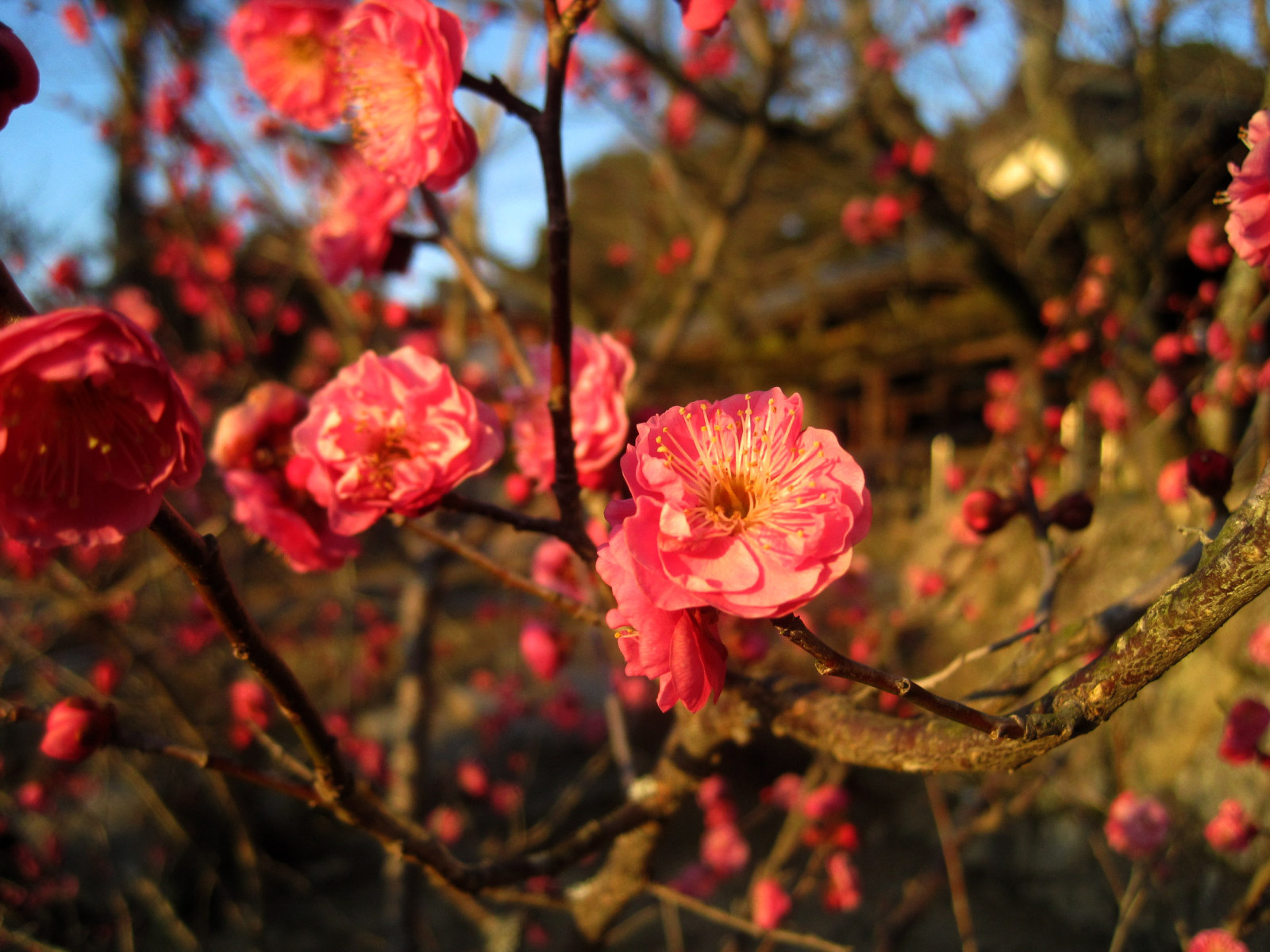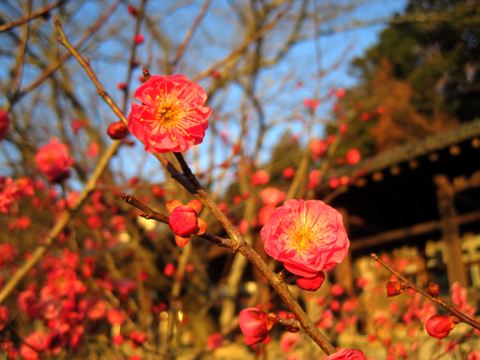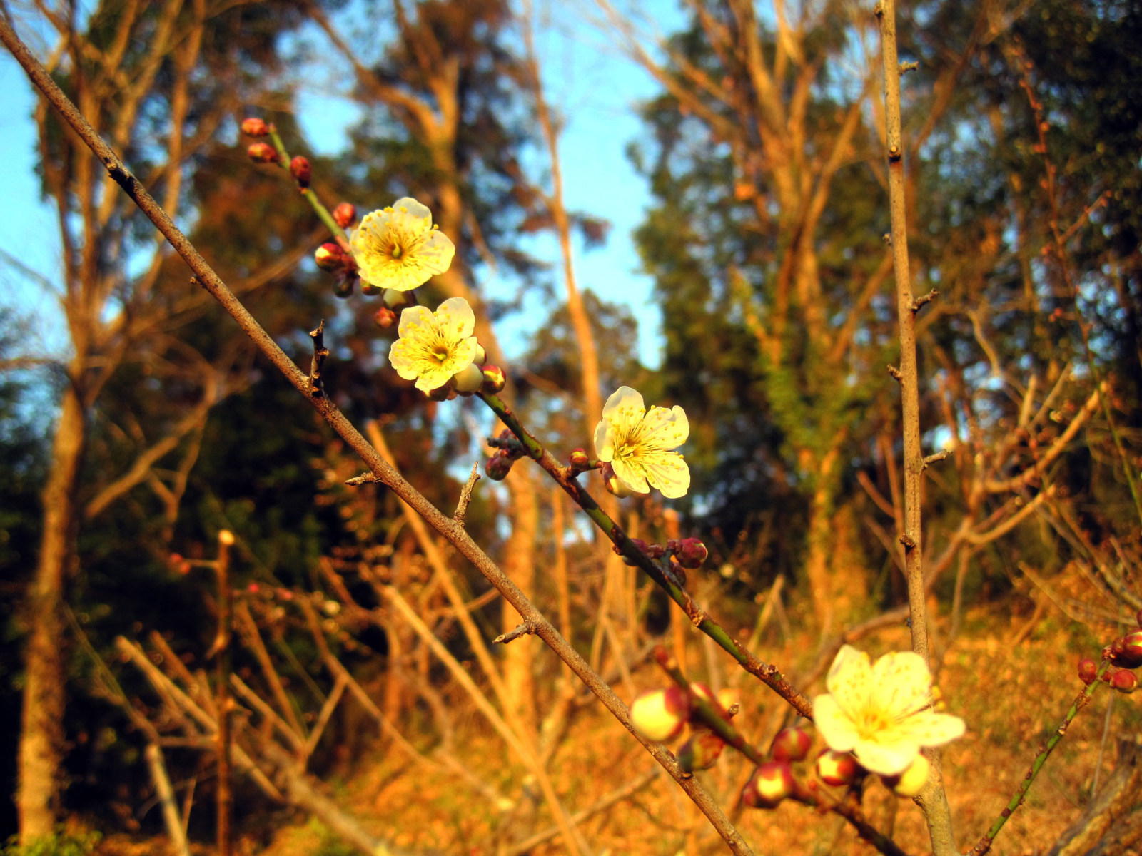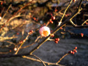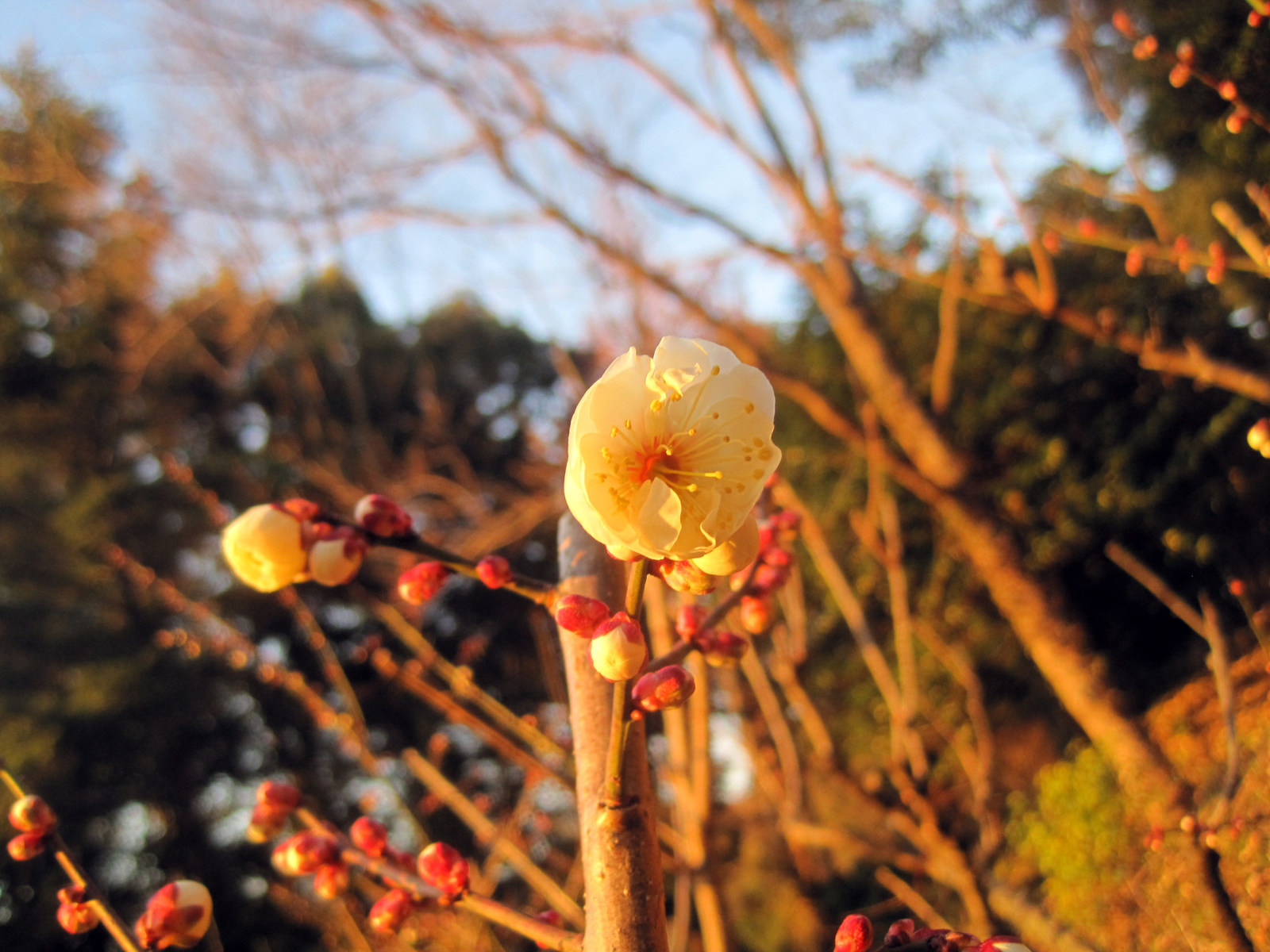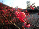 「「梅は,咲いたか〜」って訪れてみたのですが・・・・紅梅も夕陽のオレンジ色の中・・・。