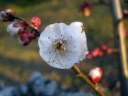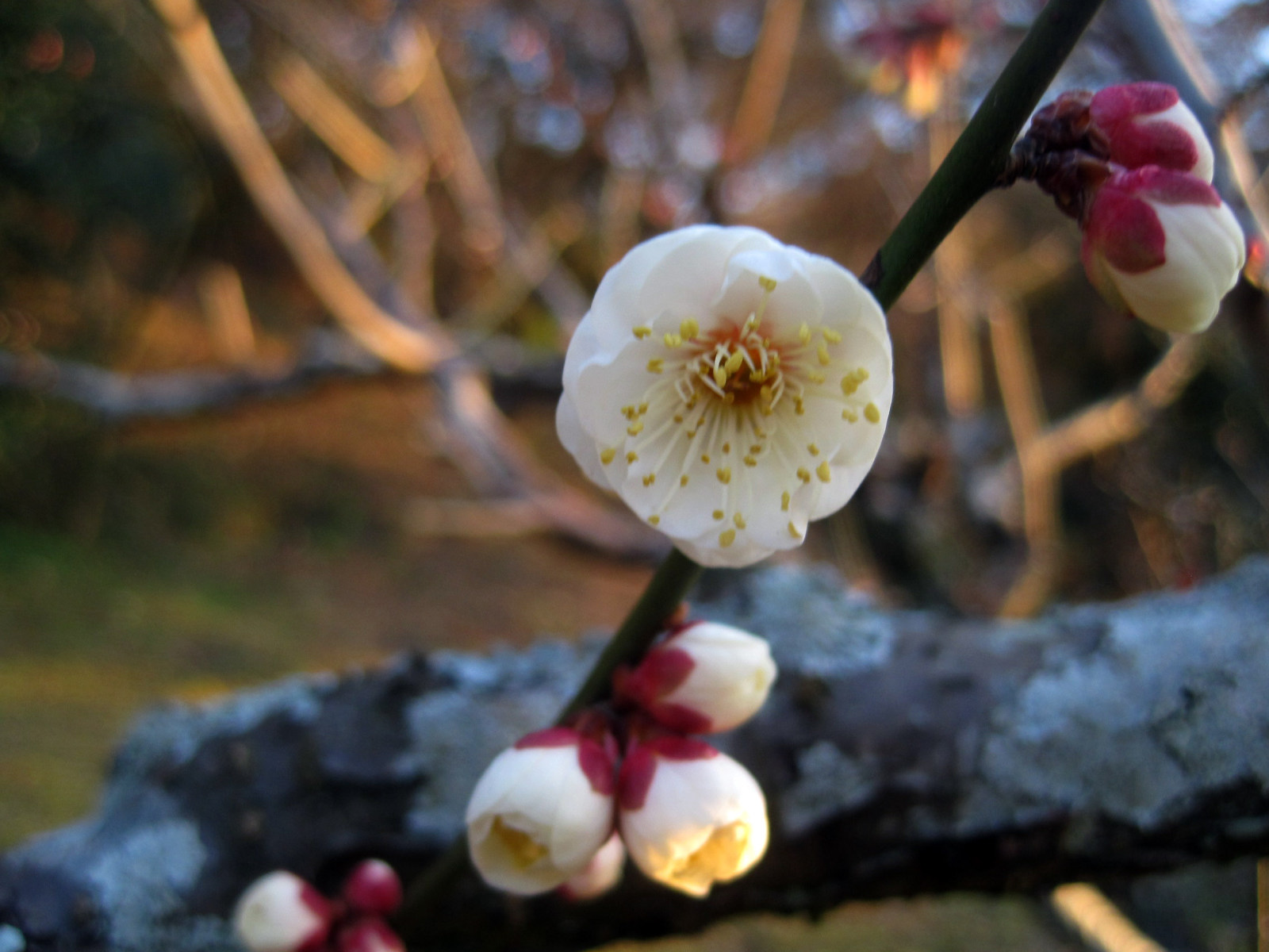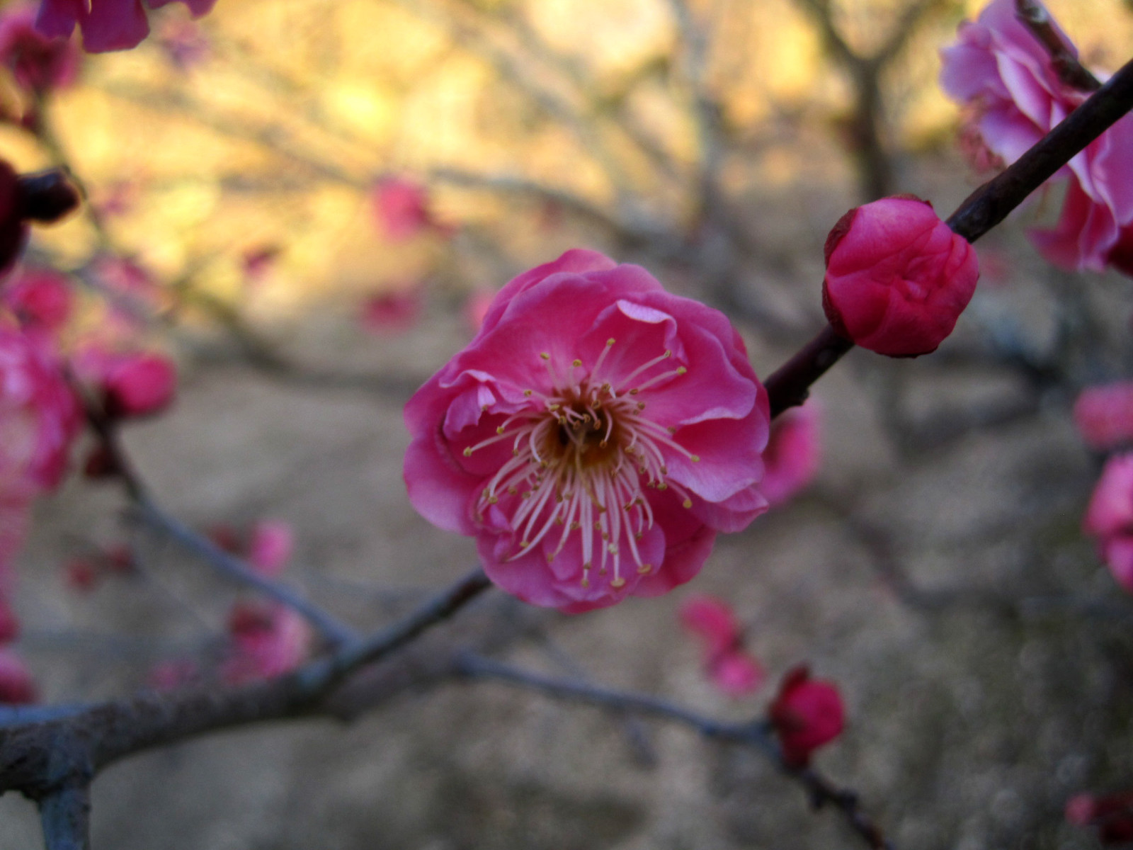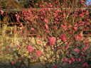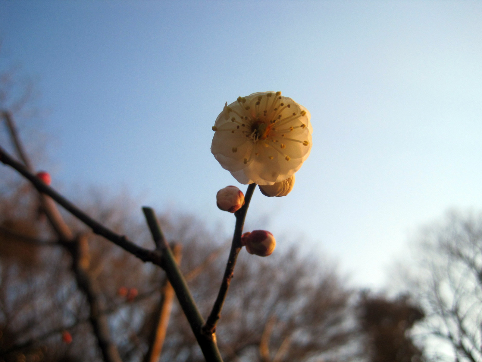 「「梅は,咲いたか〜」って訪れてみたのですが・・・・紅梅も夕陽のオレンジ色の中・・・。