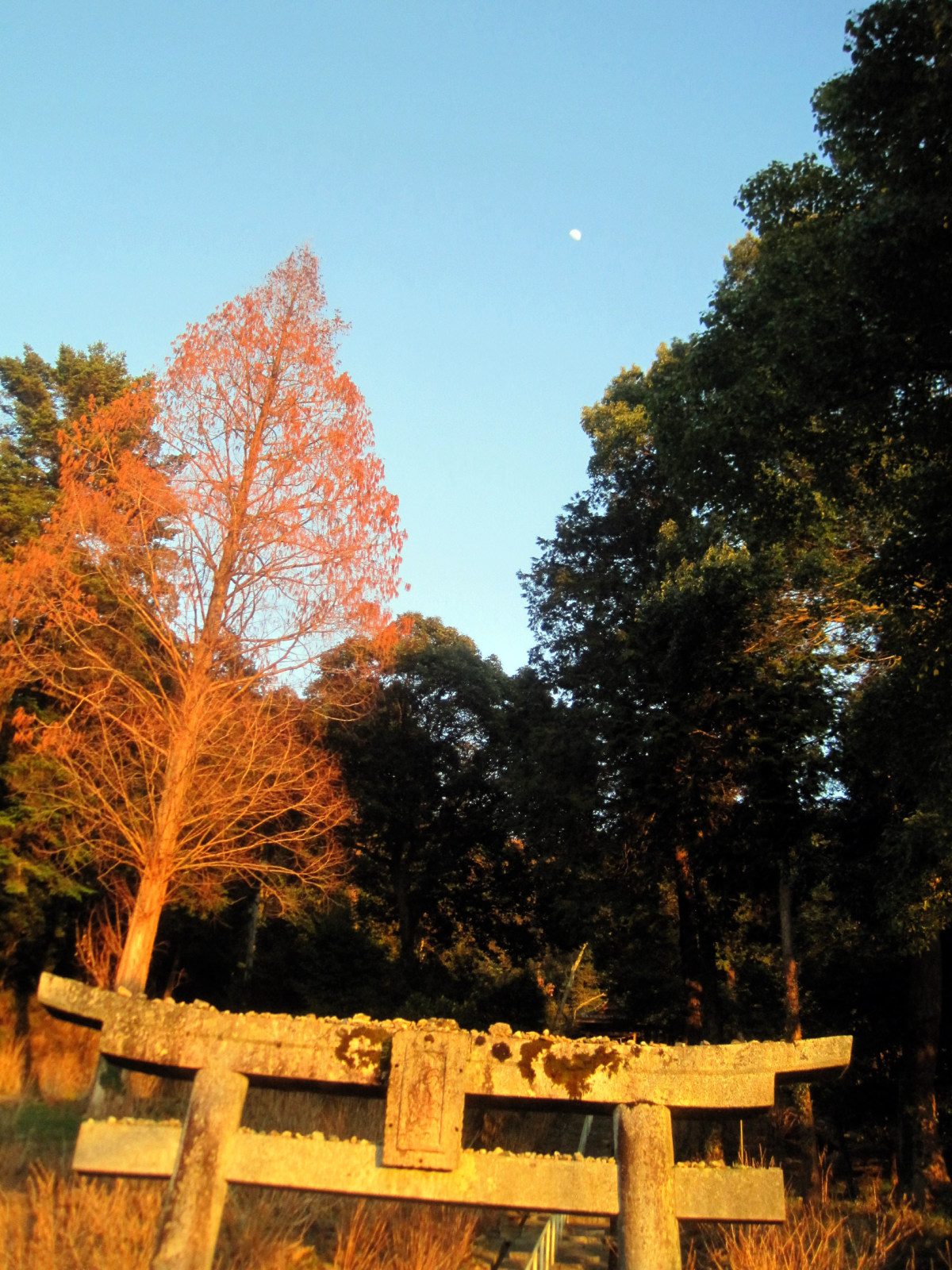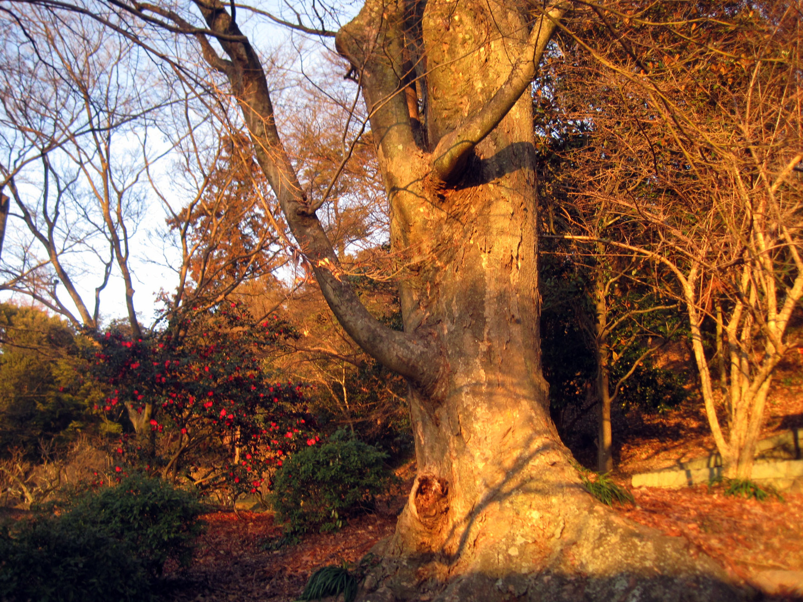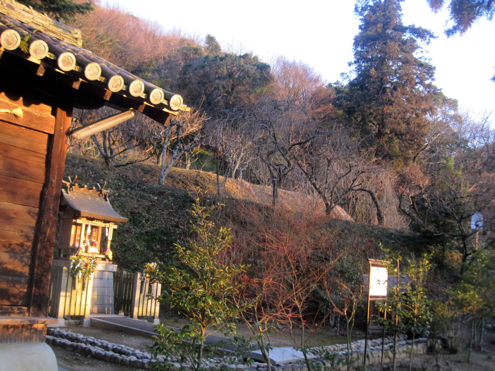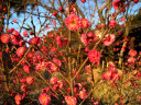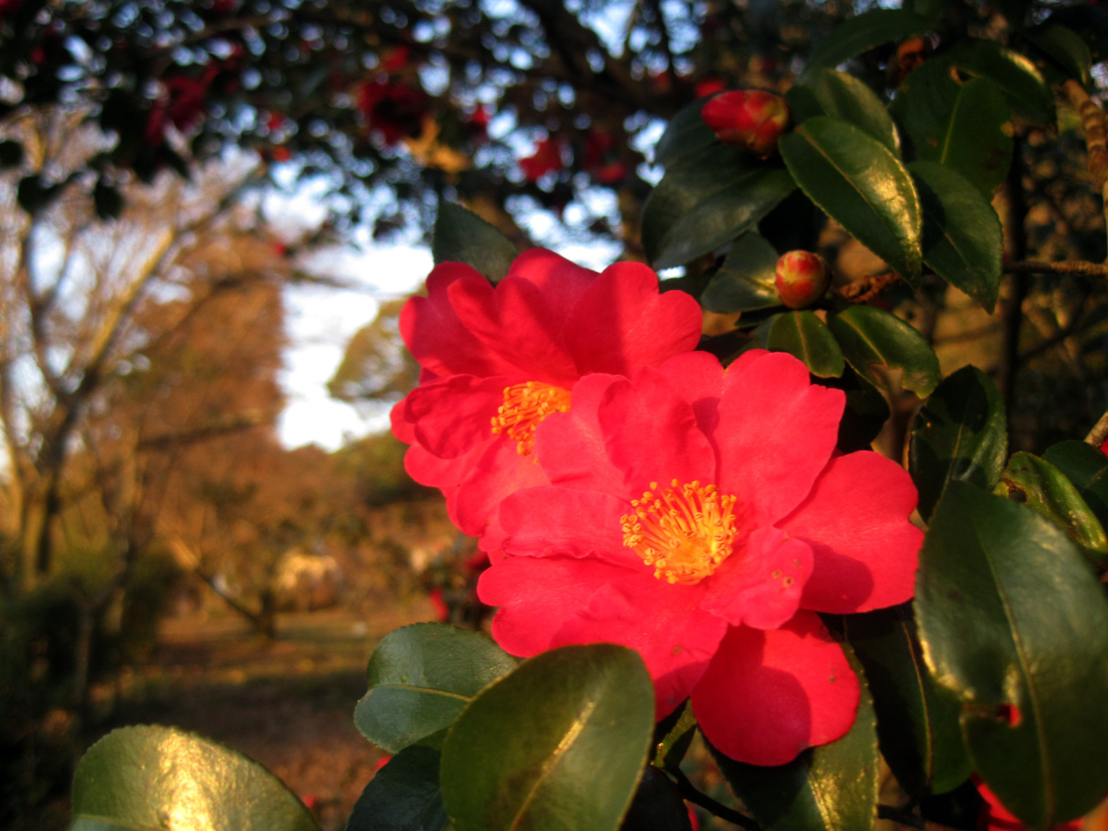「「梅は,咲いたか〜」って訪れてみたのですが・・・・紅梅も夕陽のオレンジ色の中・・・。