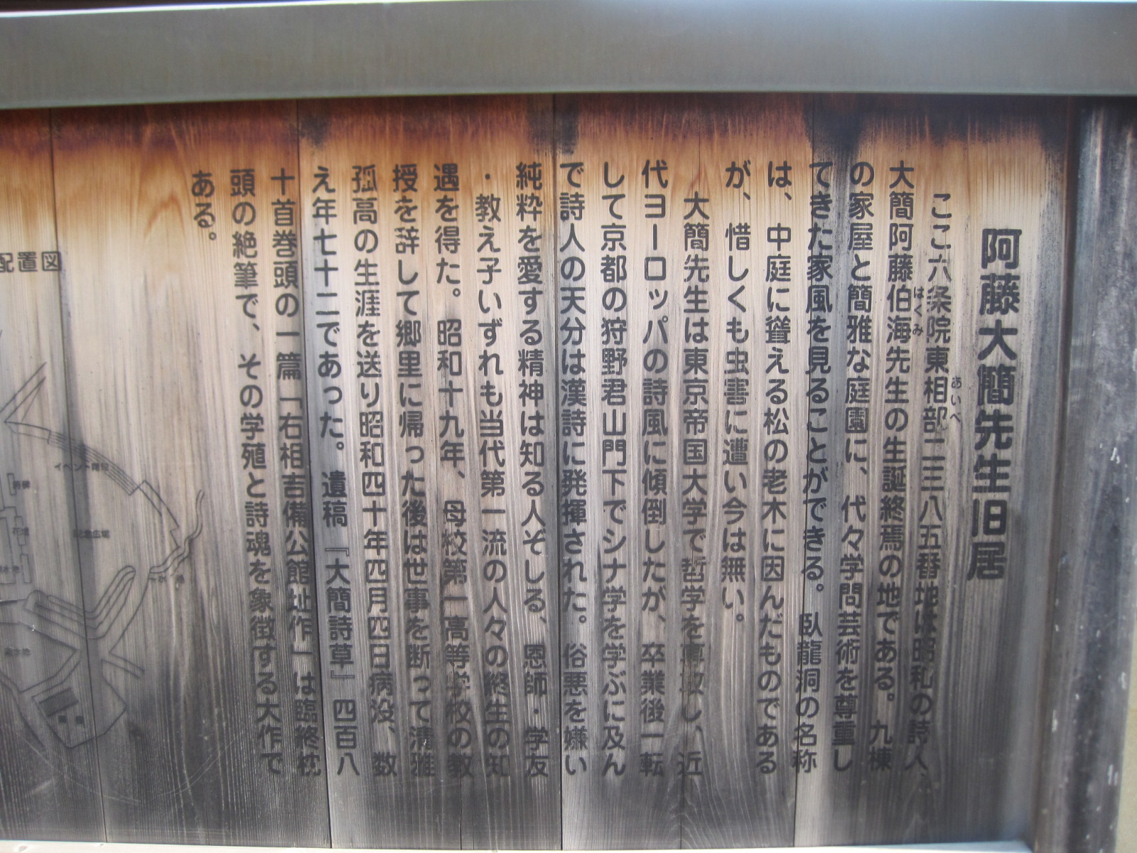 【阿藤伯海:1894−1965 大正-昭和時代の中国文学者。明治27年2月17日生まれ。東京帝大卒業後,中国哲学を狩野直喜(なおき)にまなび,法大,一高の教授をつとめる。昭和24年岡山大の創設につくすが,教授にならず詩作,読書にふける。没後,漢詩集「大簡詩草」が刊行された。昭和40年4月4日死去。71歳。岡山県出身。名は簡。号は大簡,虚白堂。信濃なる山路の雪ともろともにはるをも待たで消ゆるけふかな(辞世)】だそうです。