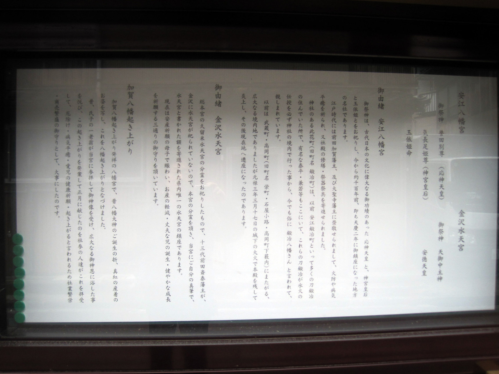 【御祭神は古代日本の文化に偉大なる御功績のあった、誉田別尊(応神天皇)と気長足姫尊(神功皇后)と玉依姫命とをおまつりし、又相殿には天地創造の神である、天御中主神を始めとして、我々の大祖先である天照大御神、国土経営に大功あった大国主神等をおまつりして、今から約壱千百有余年前、即ち天慶2年に御鎮座になった、地方の名社である。江戸時代には前田加賀藩主又大聖寺藩主に崇敬せられまして、火防や病気平癒を祈られ、又社殿の修繕及祭器祭具を寄進せられた。神社の在る此花町(旧町名鍛冶町)は、以前安江鍛冶町と称して、多くの刀鍛冶のいた所で、有名な泰平・兼若等もここにいて、これらの刀鍛冶が水火の伝授を、必ず神社で行なった事から、今でも俗に鍛冶八幡さんと称するのである。以前は武蔵町・高岡町(旧町名栄町・石屋小路・高岡町下薮内)にまたがる、拡大なる境内であったが、慶長年間に現在の地へ遷座になったのである。】だそうです。