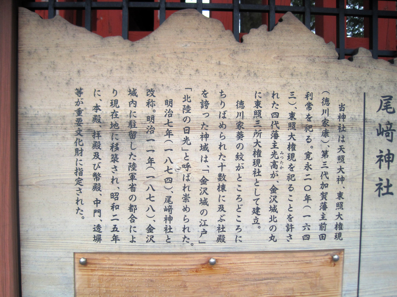 【寛永18年、前田利常の時、日光東照宮の神霊を勧請して金沢城内に社殿を造営した。20年9月落成したので鎮座祭を執行して、別当所をおいて神護寺と称した。廃藩後、城域が陸軍省の所管となったので、明治8年4月移転することになり、明治11年現在地に移った。昭和25年文部省重要文化財指定。】だそうです。