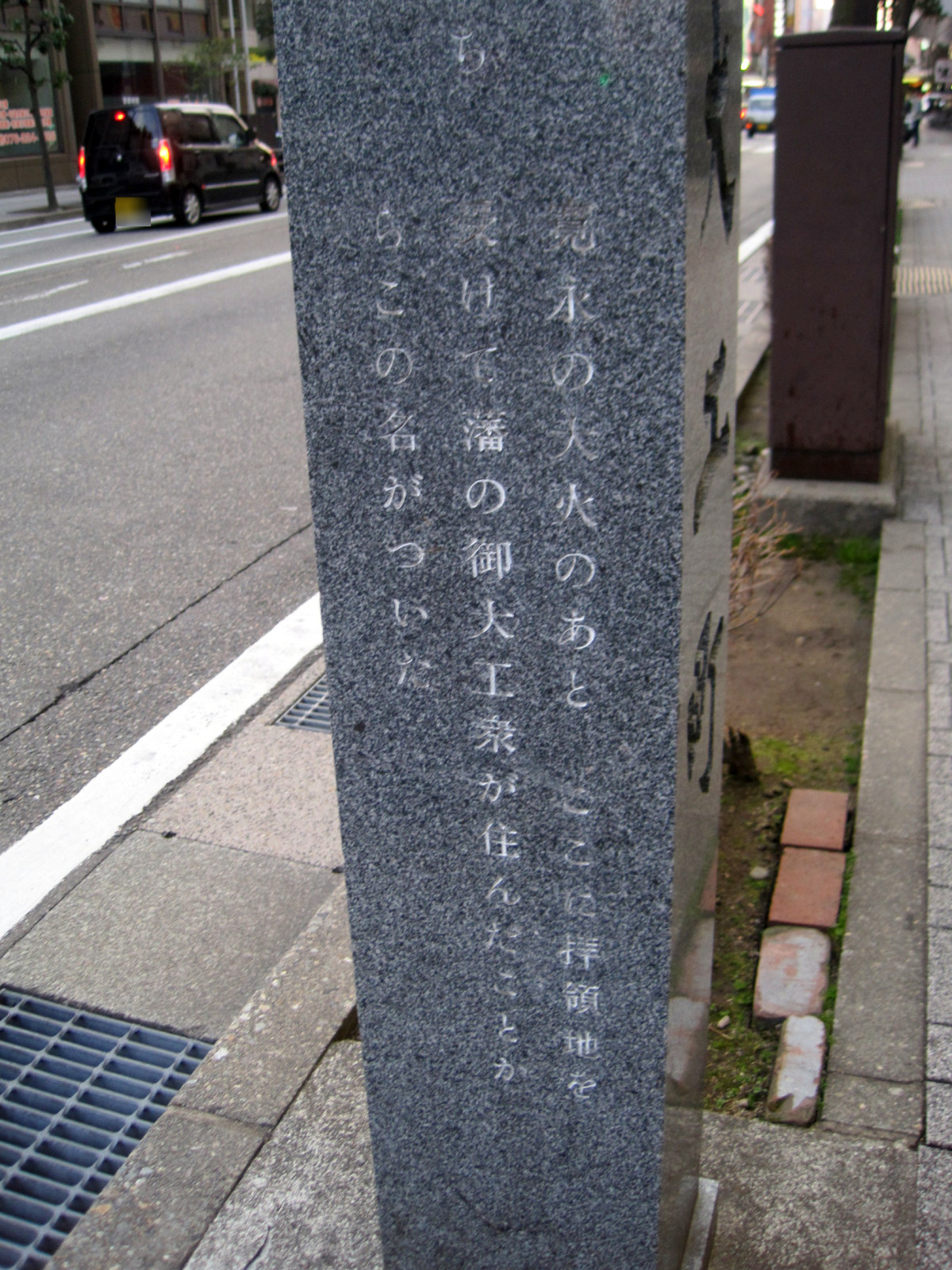 金沢の角々に,いろんな像やオブジェ! さらに「まちのり」チャリはサービスいいですね! さらに,この旧町名の石柱もステキです。