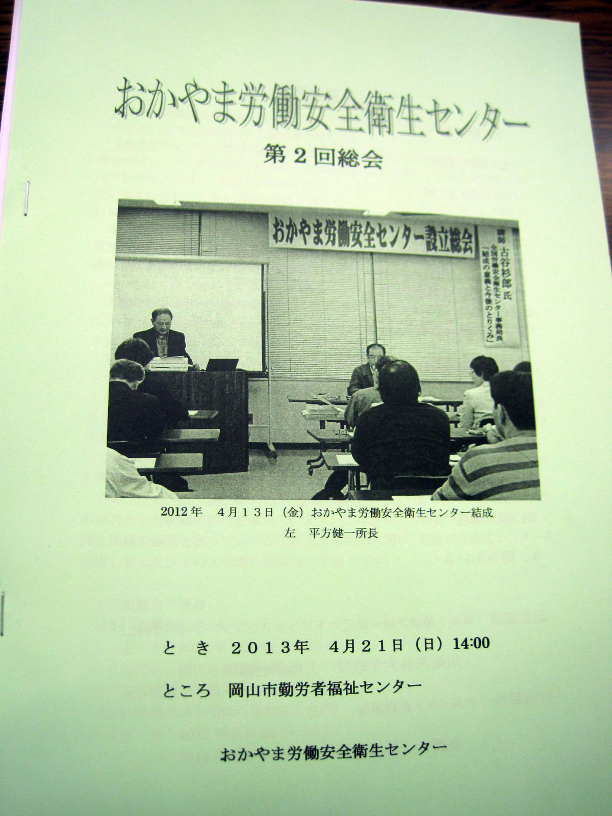 昨年の発足依頼,顧問を仰せつかっております「おかやま労働安全衛生センター」の設立一周年・・第2回総会で,講演をさせていただきました。